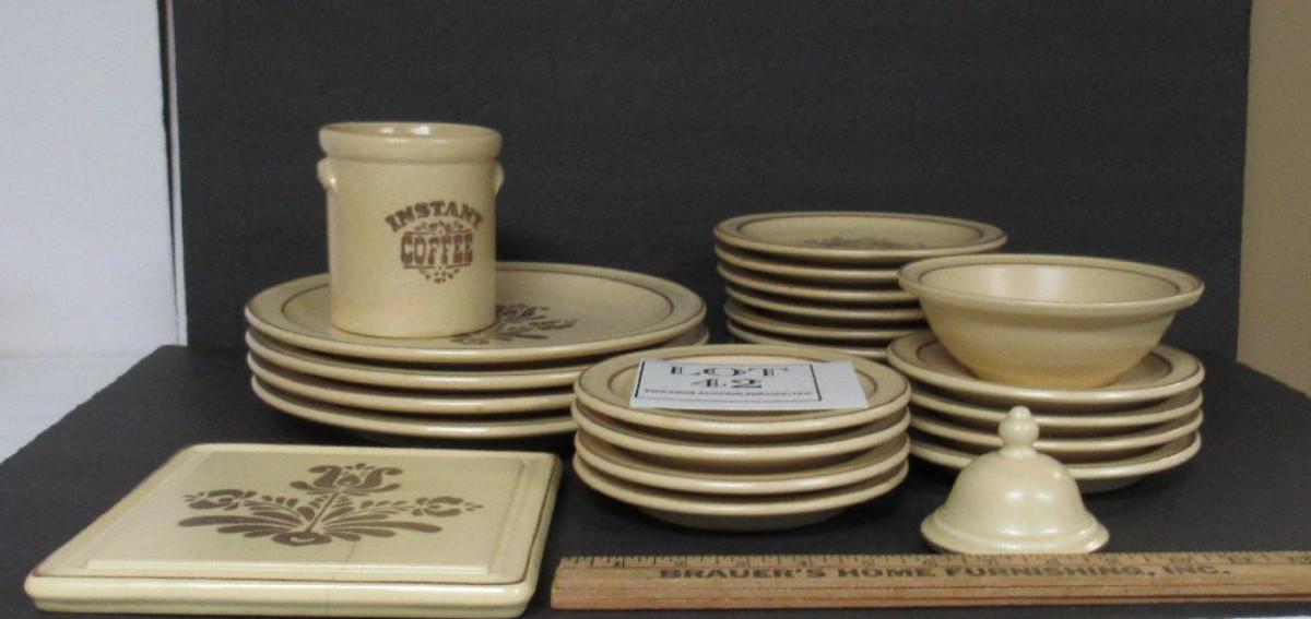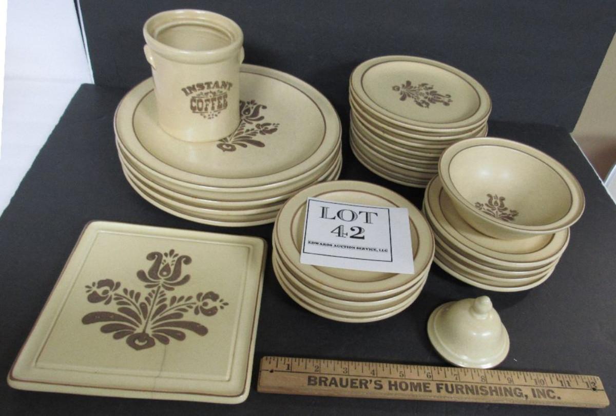 Local pick up only - too heavy to ship. Tea canister does not have top, small cover has no bottom, trivet has hairline crack, rest have no chips or cracks but normal use wear and a few stains here and there.