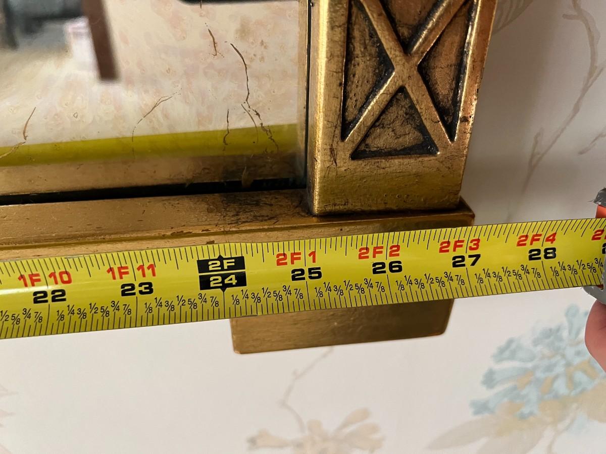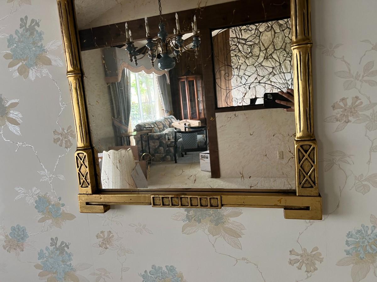 Mid Century Modern Gold Gilt Pagoda Asian Framed Wall Mirror. In good vintage condition. Mirror has that vintage gold veiny look to it. About 27"x44" size.