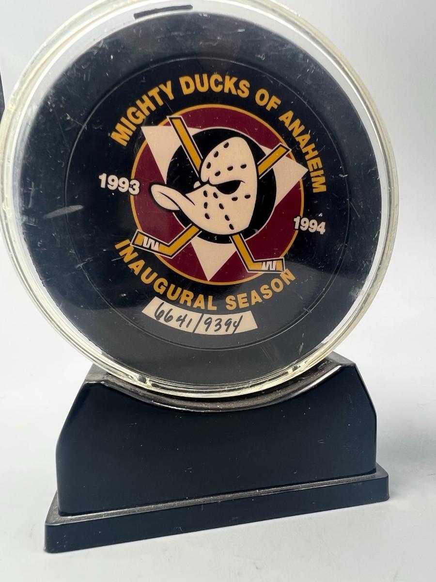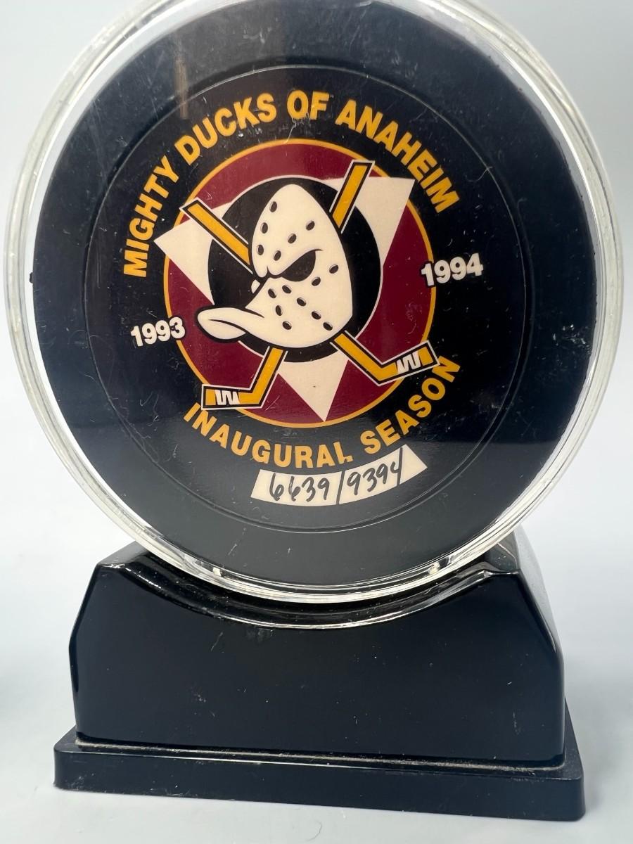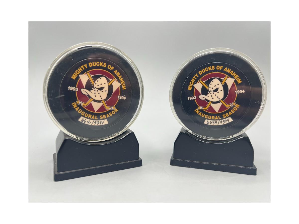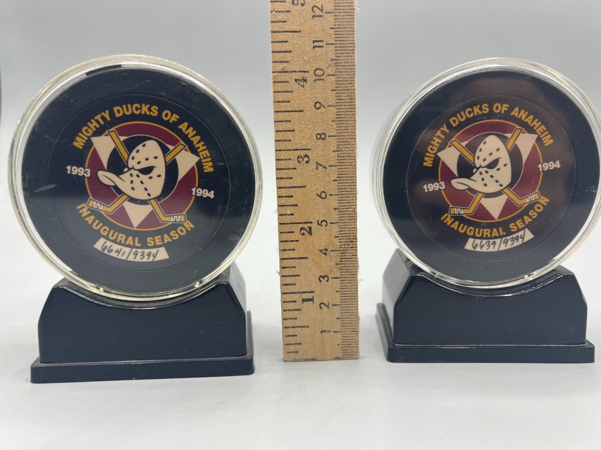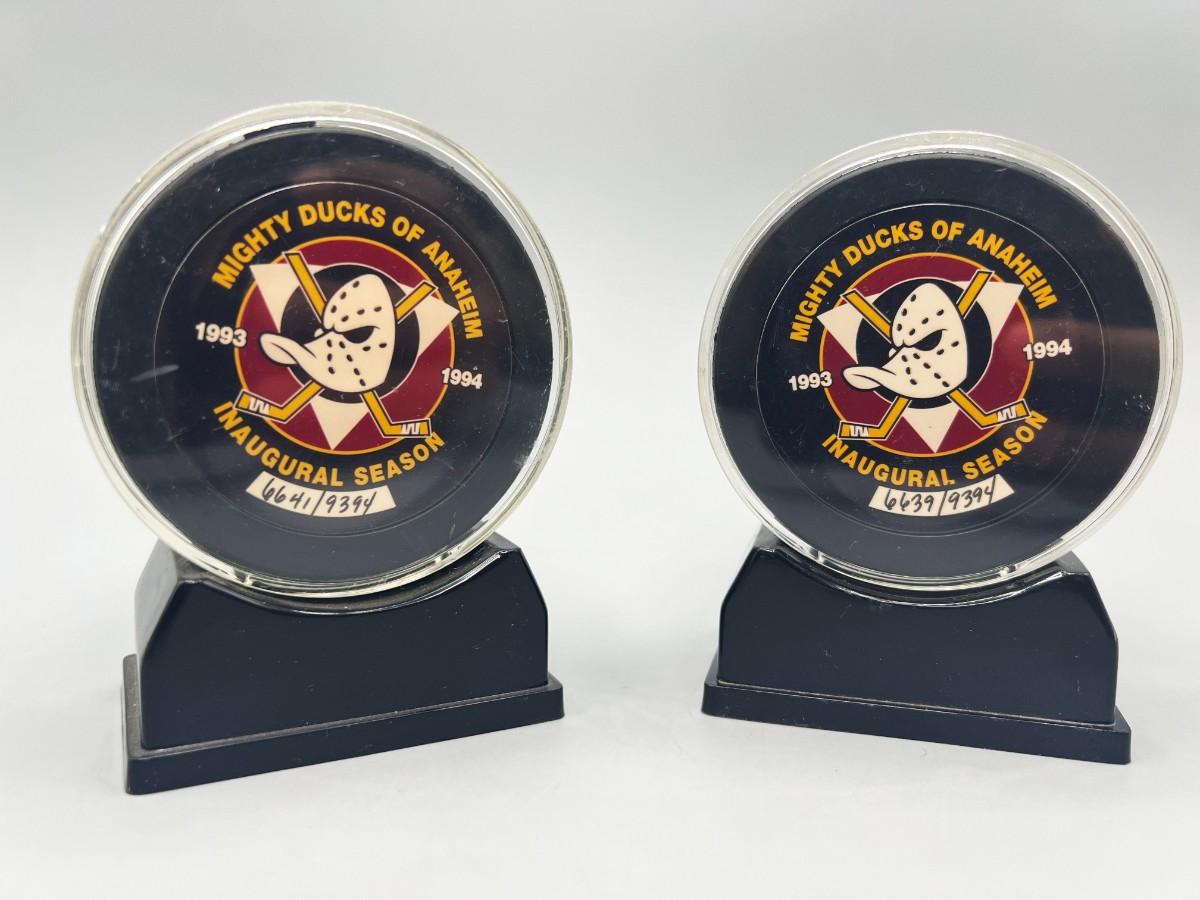 Retro Pair Mighty Ducks of Anaheim Inaugural Season NHL Hockey Numbered Displayable Pucks