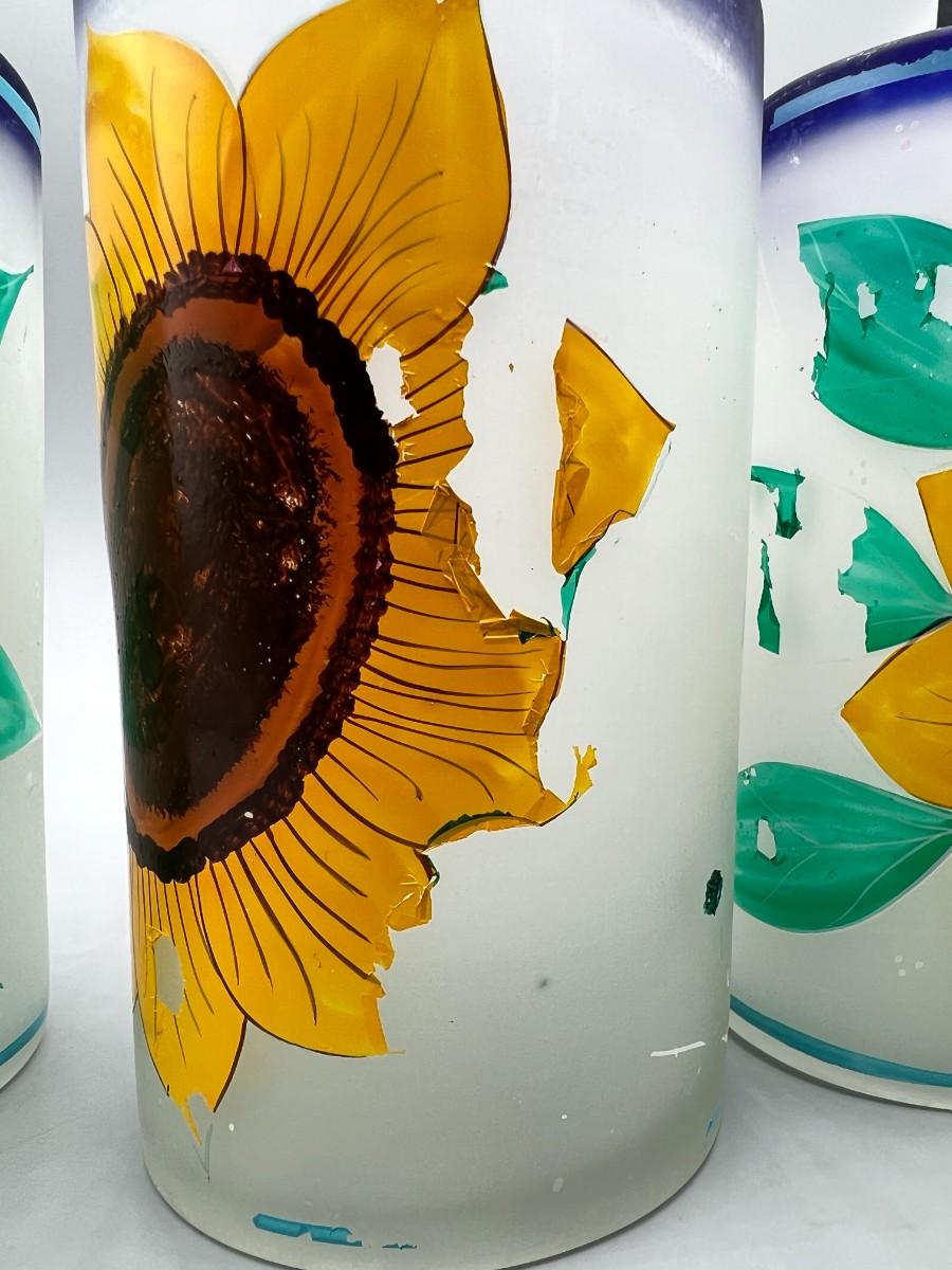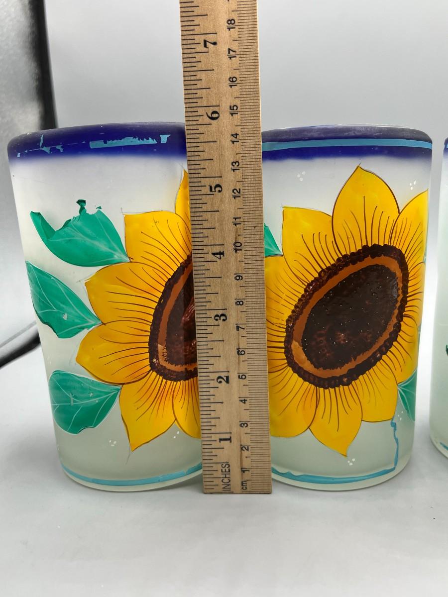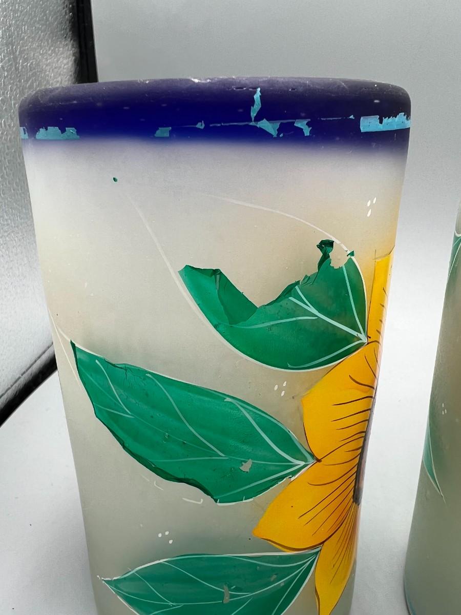 Frosted Glass Painted Sunflower Pitcher with 4 Matching Drink Glasses. Good condition.