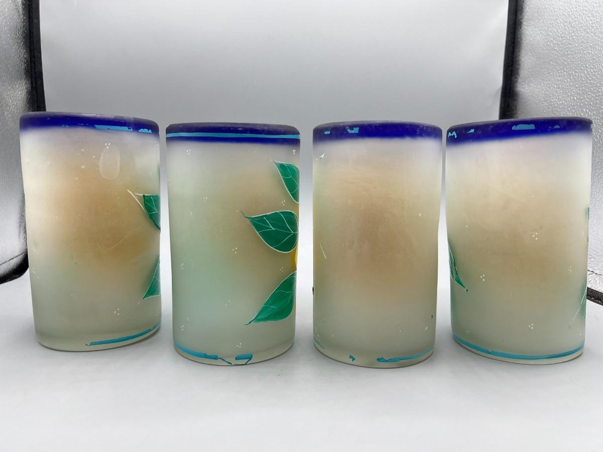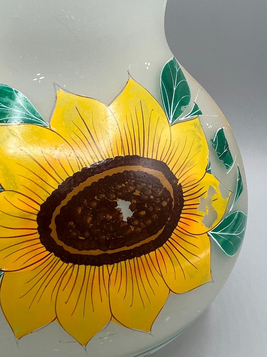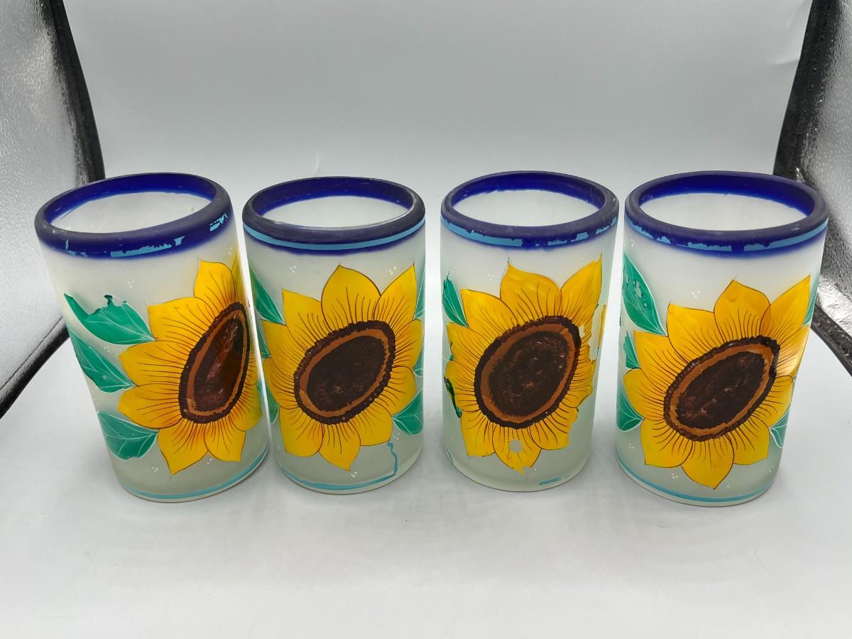 Frosted Glass Painted Sunflower Pitcher with 4 Matching Drink Glasses. Good condition.