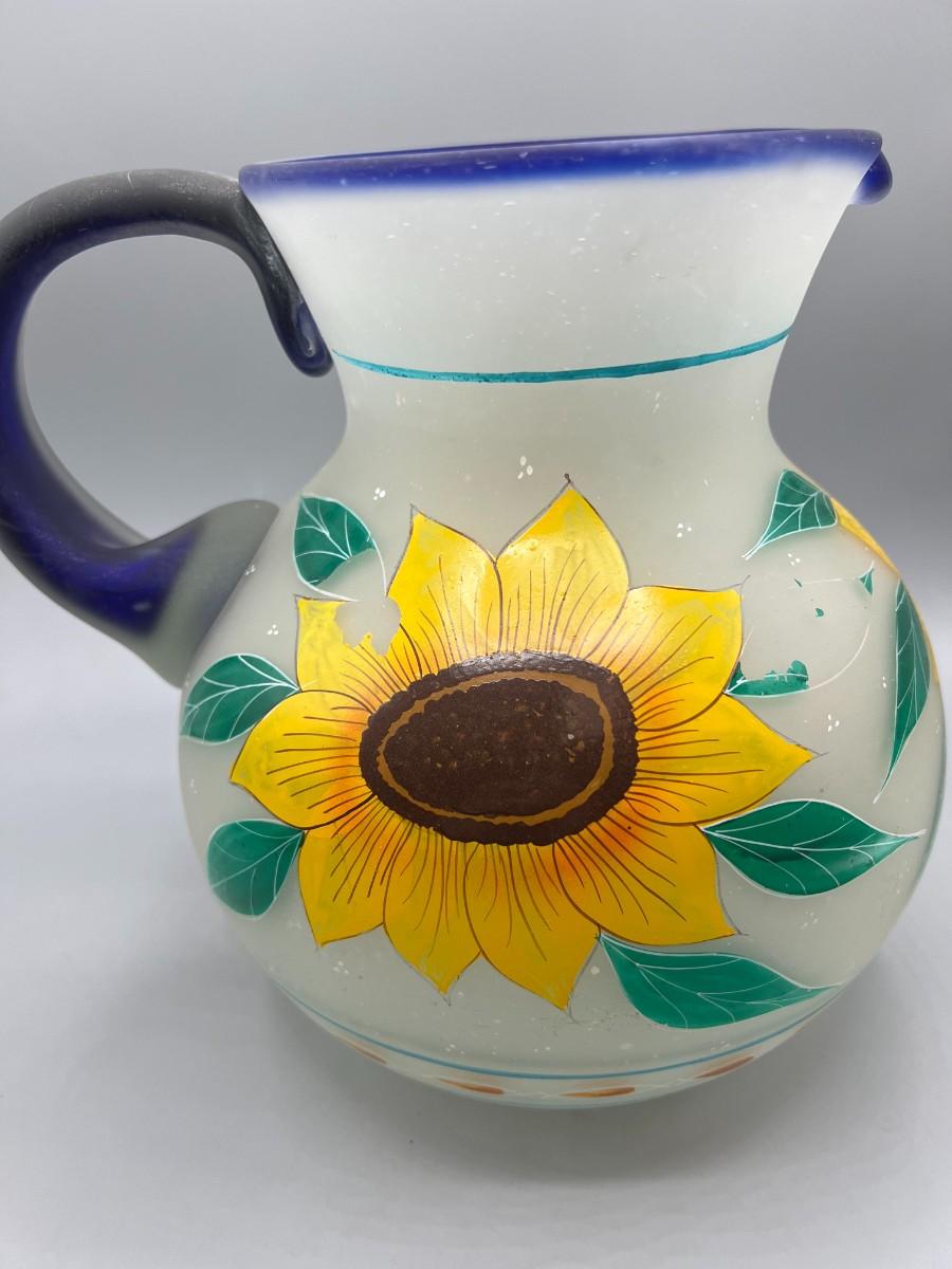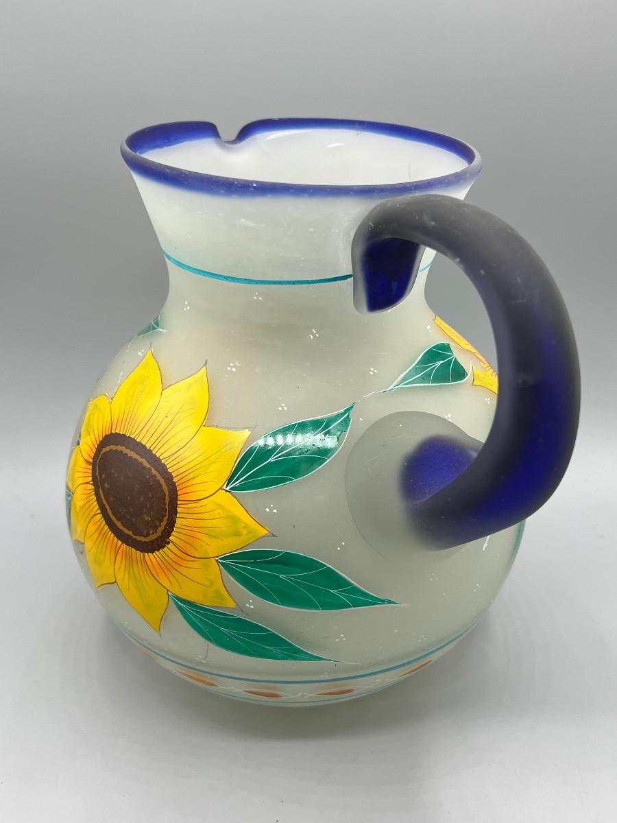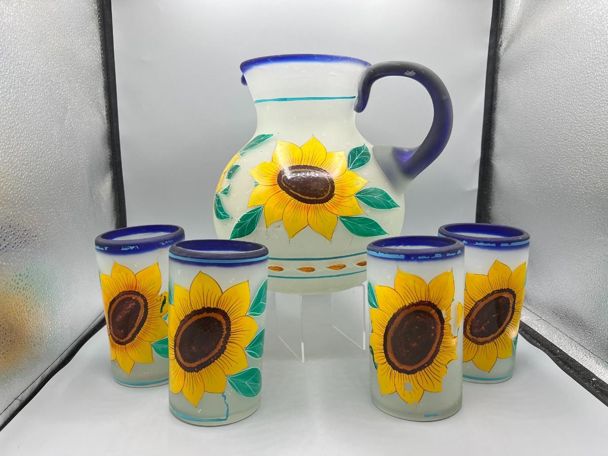 Frosted Glass Painted Sunflower Pitcher with 4 Matching Drink Glasses
