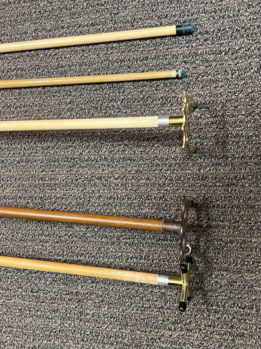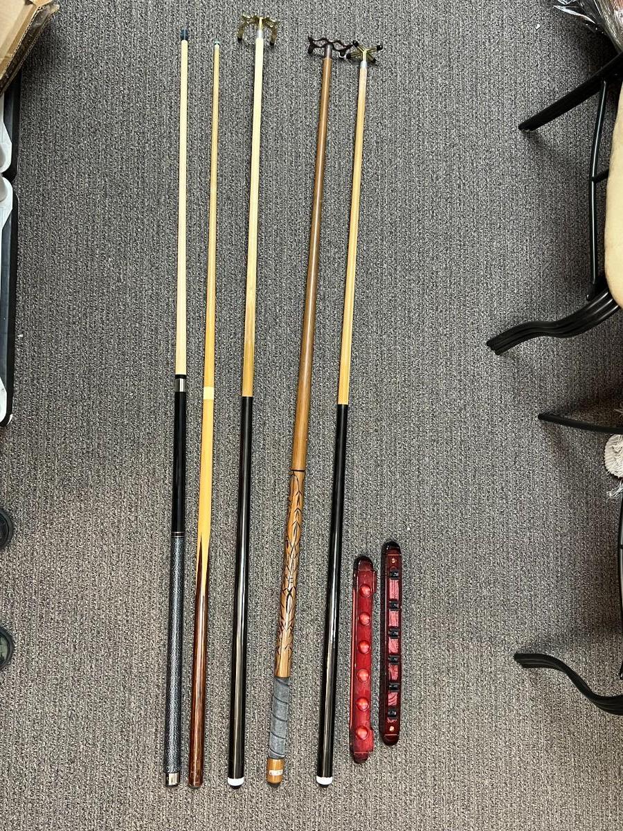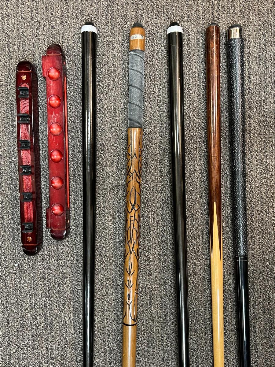 Lot of Billiards Pool Cues Alex Higgins, Pool Bridges, & Pool Cue Stick Rack