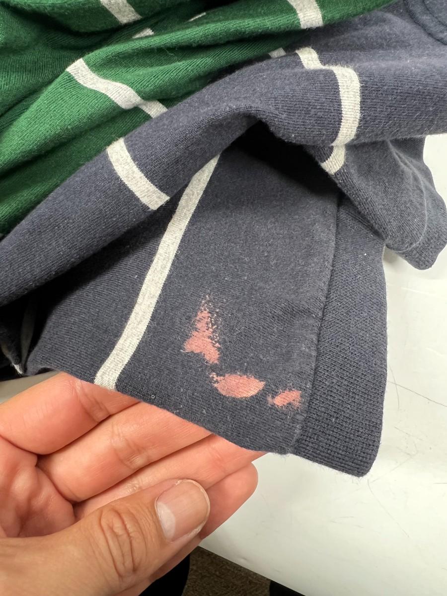There is some light wear and there is a stain on the cuff of the blue shirt, but there is no other significant damage and is in overall good wearable condition. Check pictures for more details and for information.