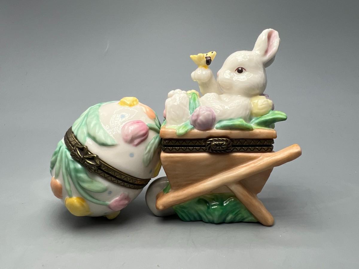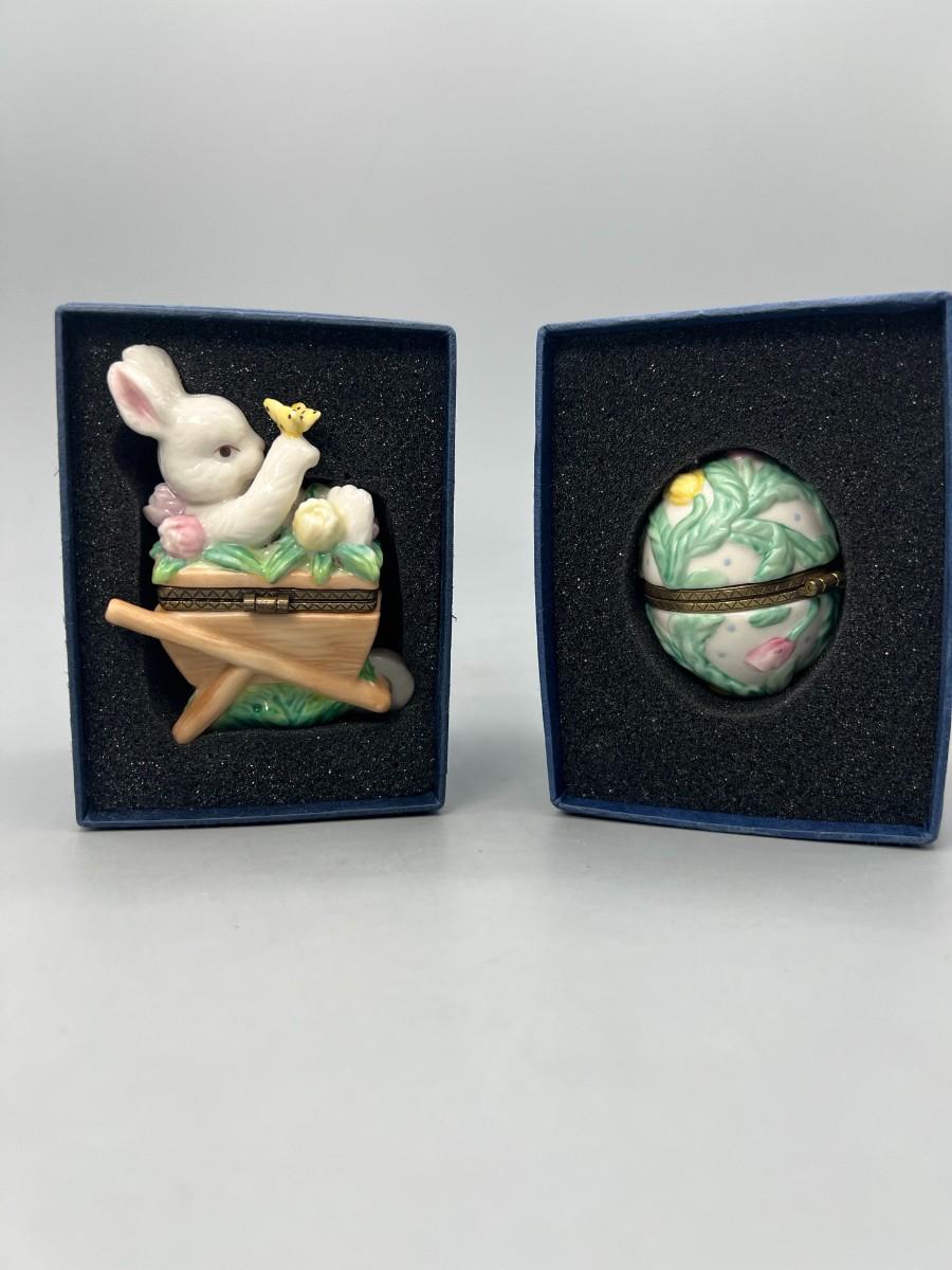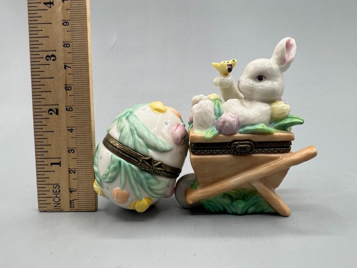 Pair of Easter Bunny in Wheelbarrow & Colorful Tulip Egg Ceramic Snuff Boxes
