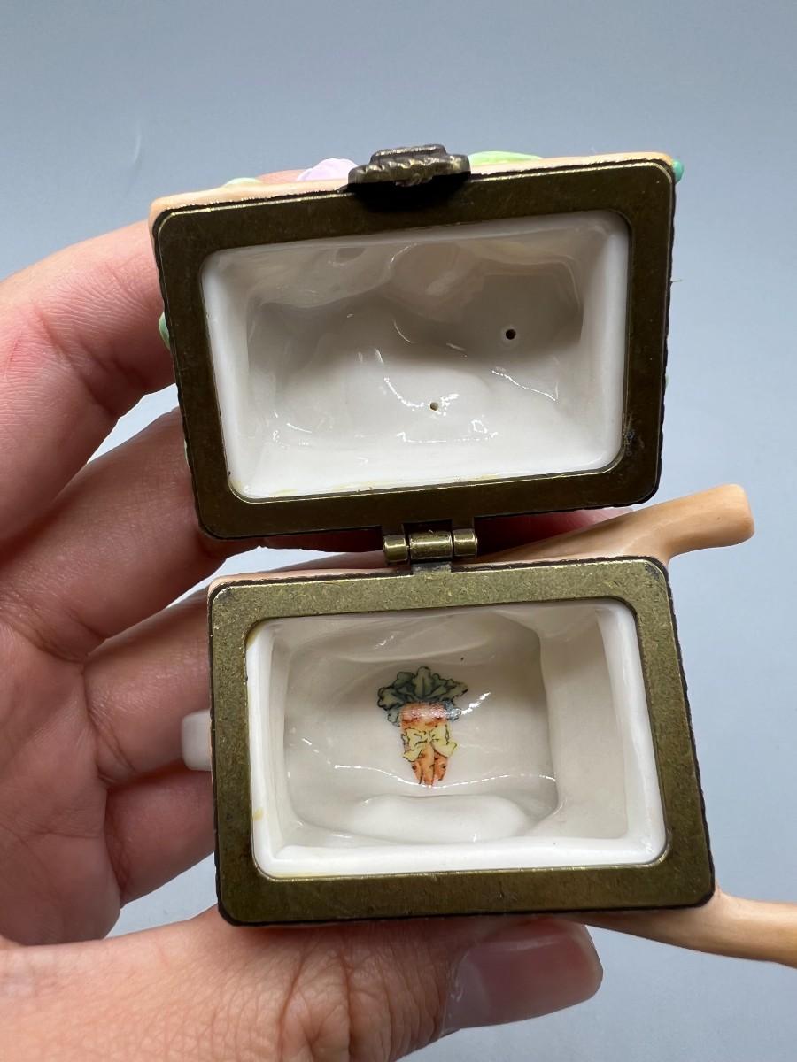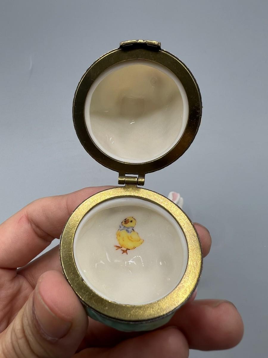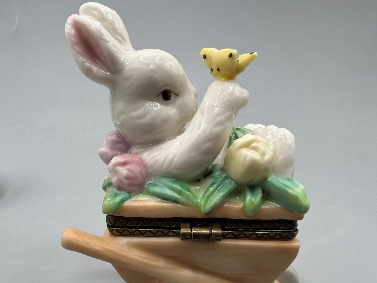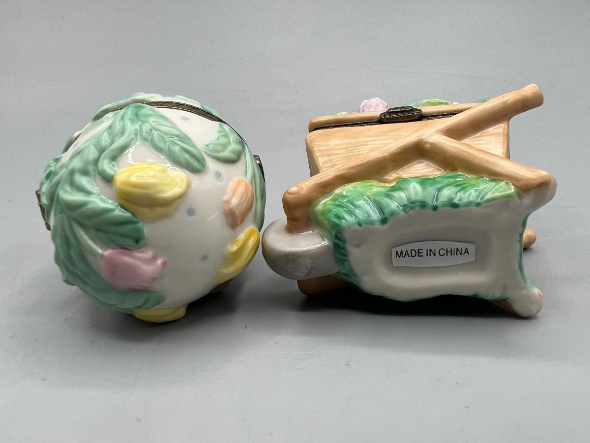 Pair of Easter Bunny in Wheelbarrow & Colorful Tulip Egg Ceramic Snuff Boxes