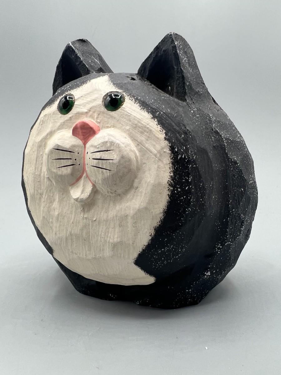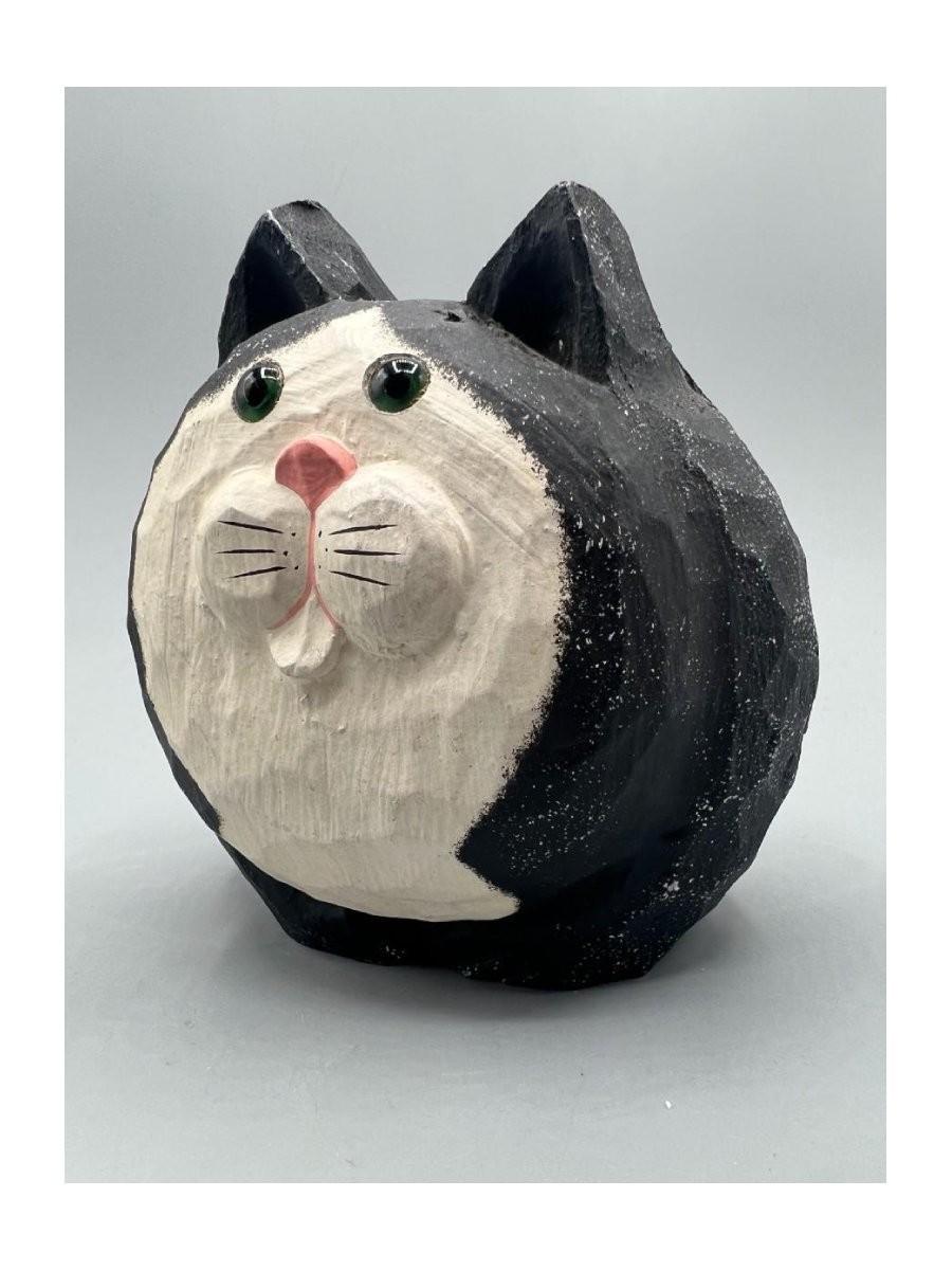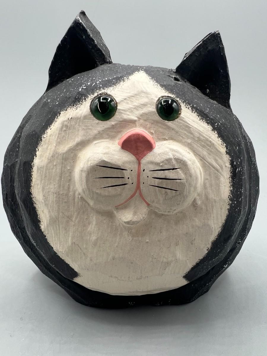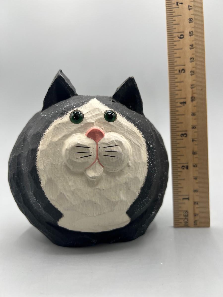 Round Wooden Handmade Carved Signed Cute Black & White Cat Rustic Figurine Decor