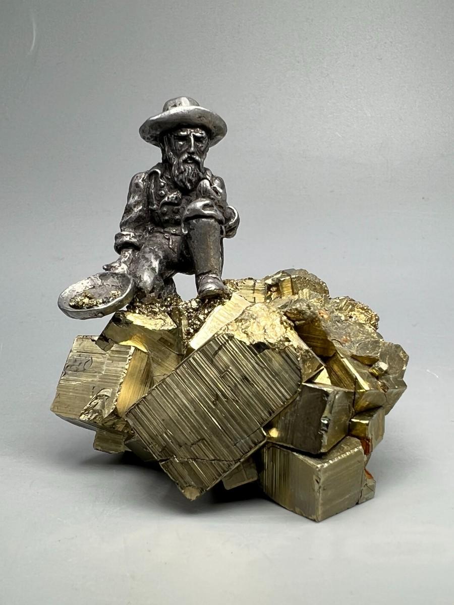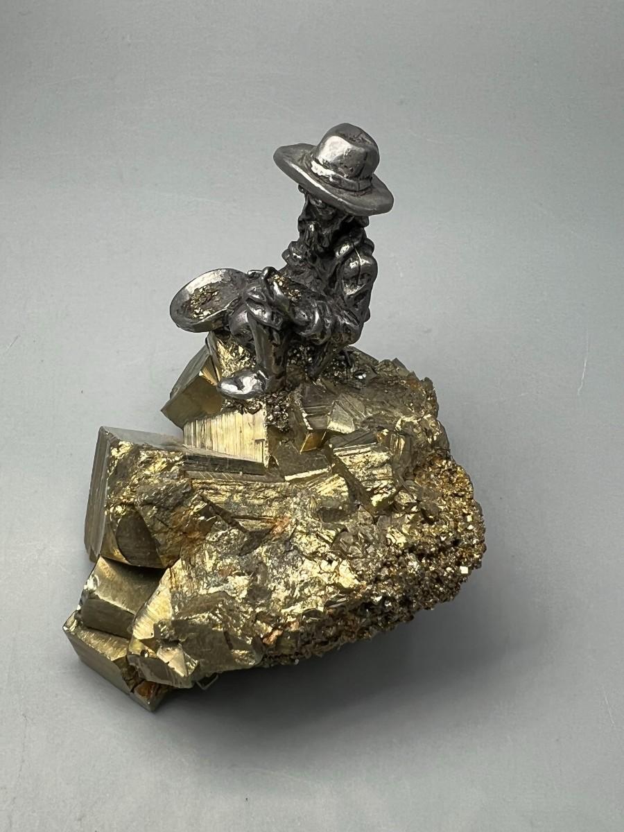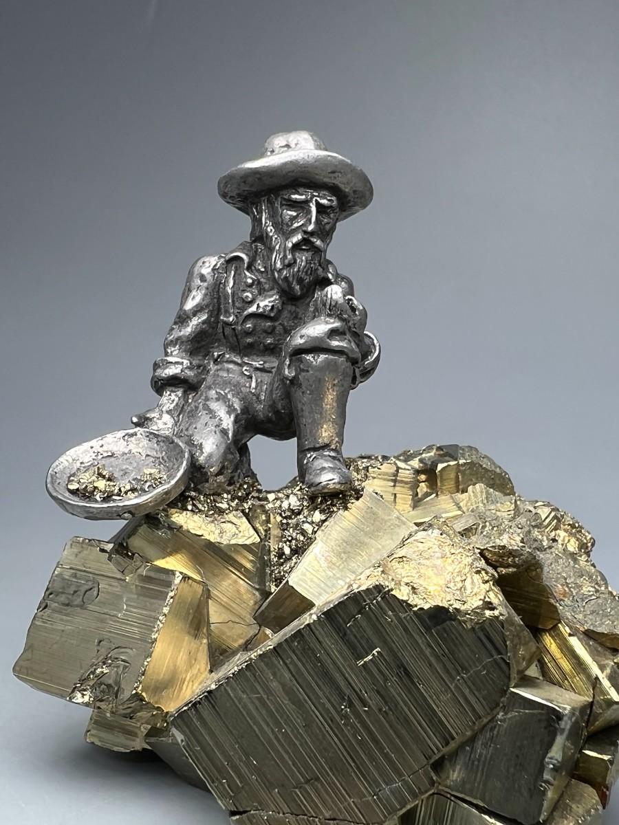 Small Retro Prospector Old West Miner Figurine on Pyrite Crystal Fools Gold Cluster