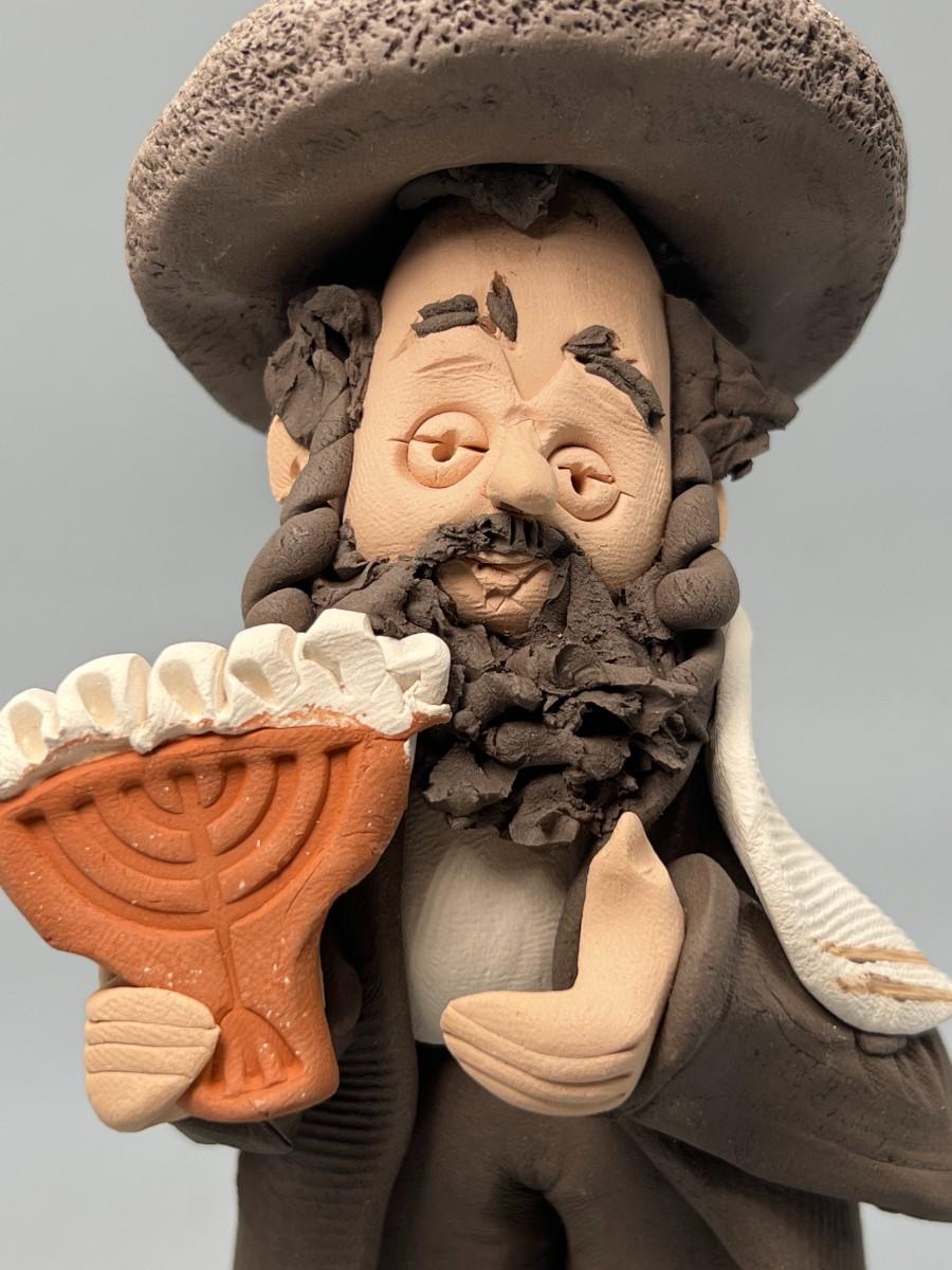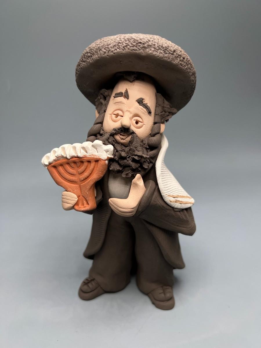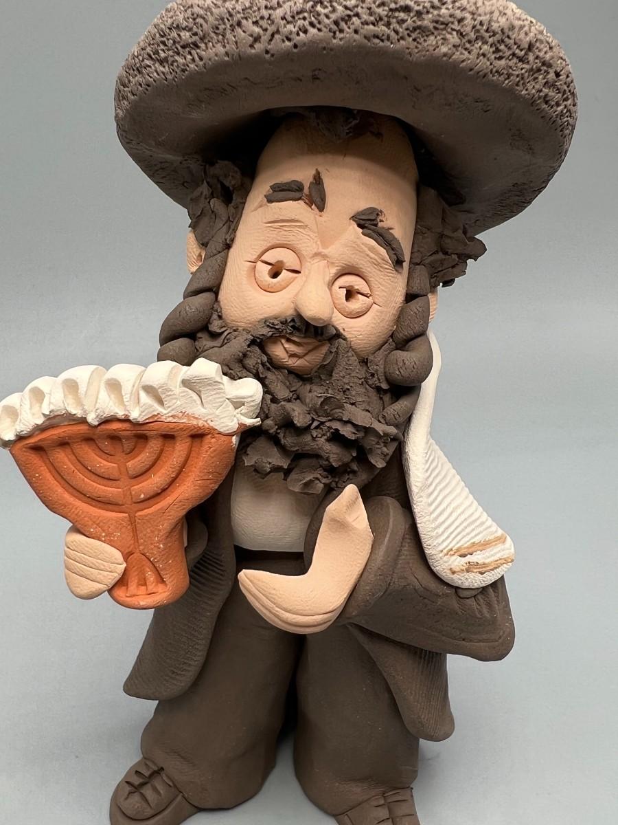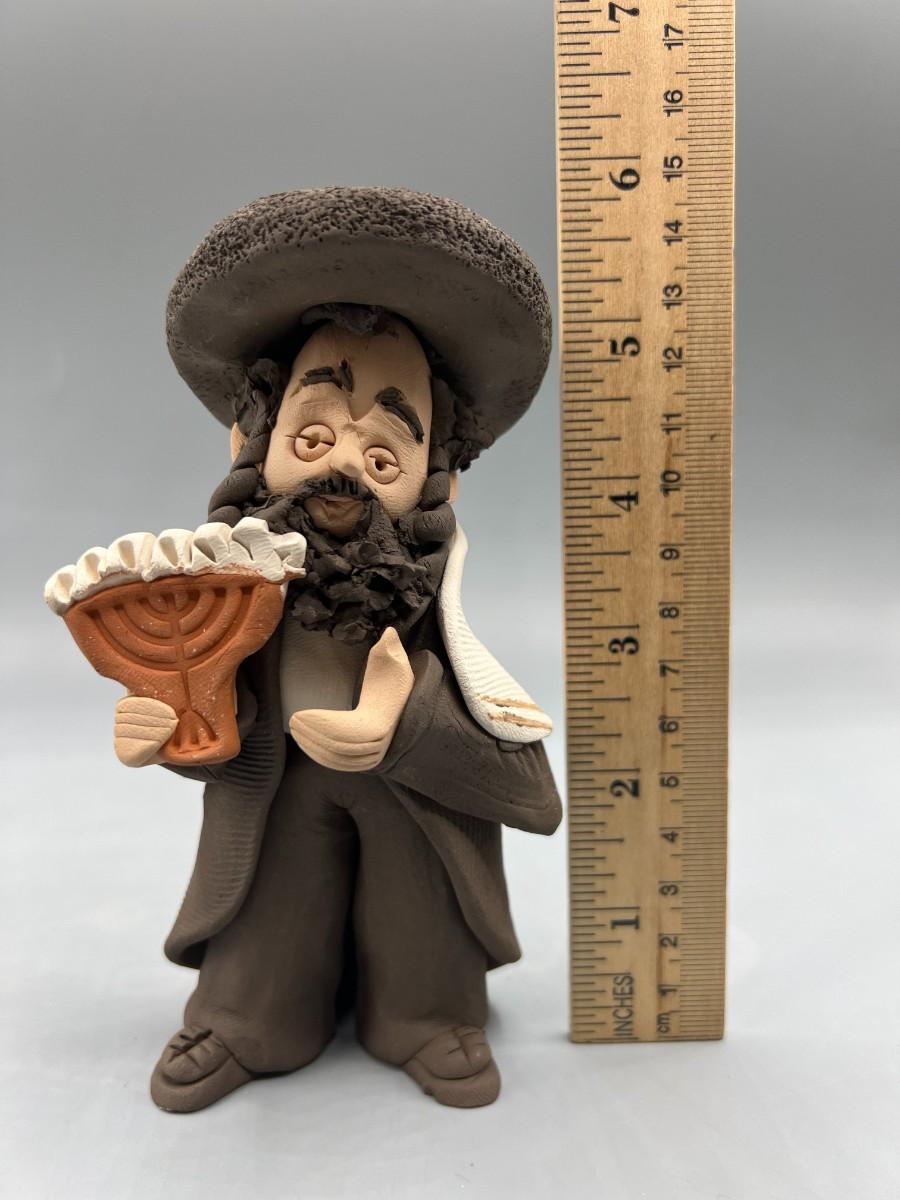 Vintage Clay Traditional Rabbi Holding Menorah with Artist Signature Religious Figurine