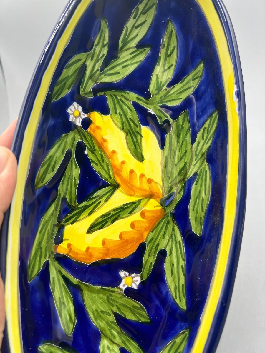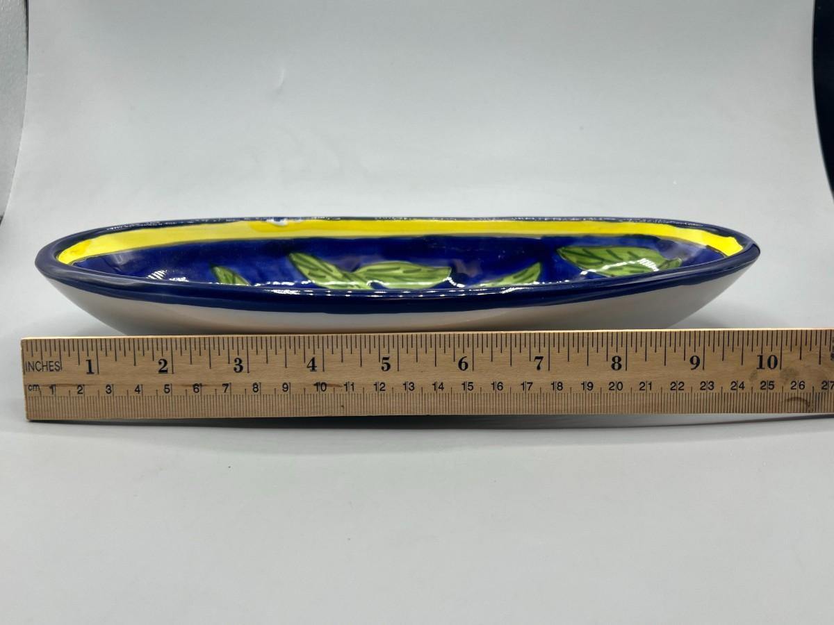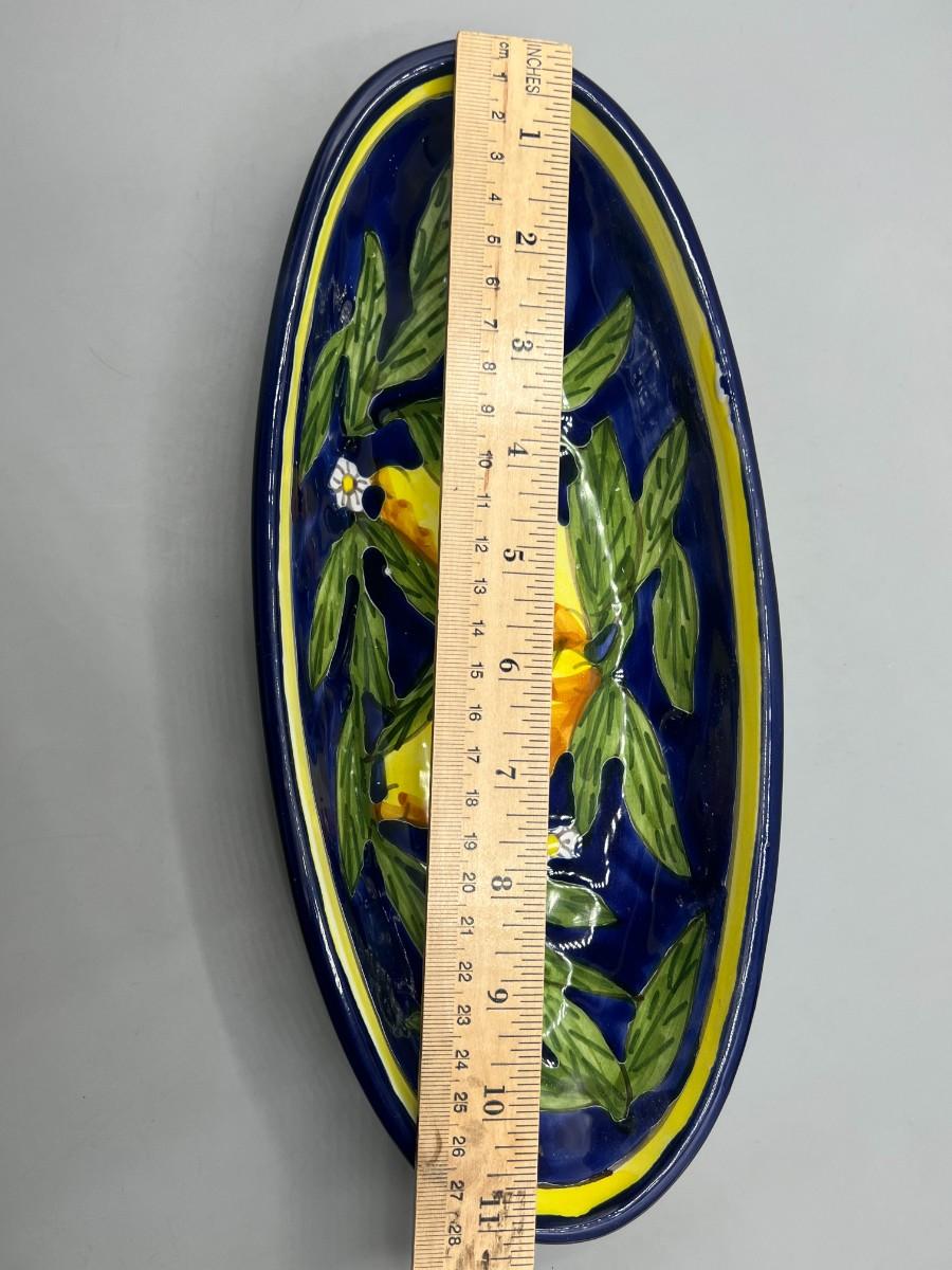 Hand Painted Oblong Serving Dish Cobalt with Yellow Lemons Tunisia. In good condition. Signed on the bottom. About 10" size.