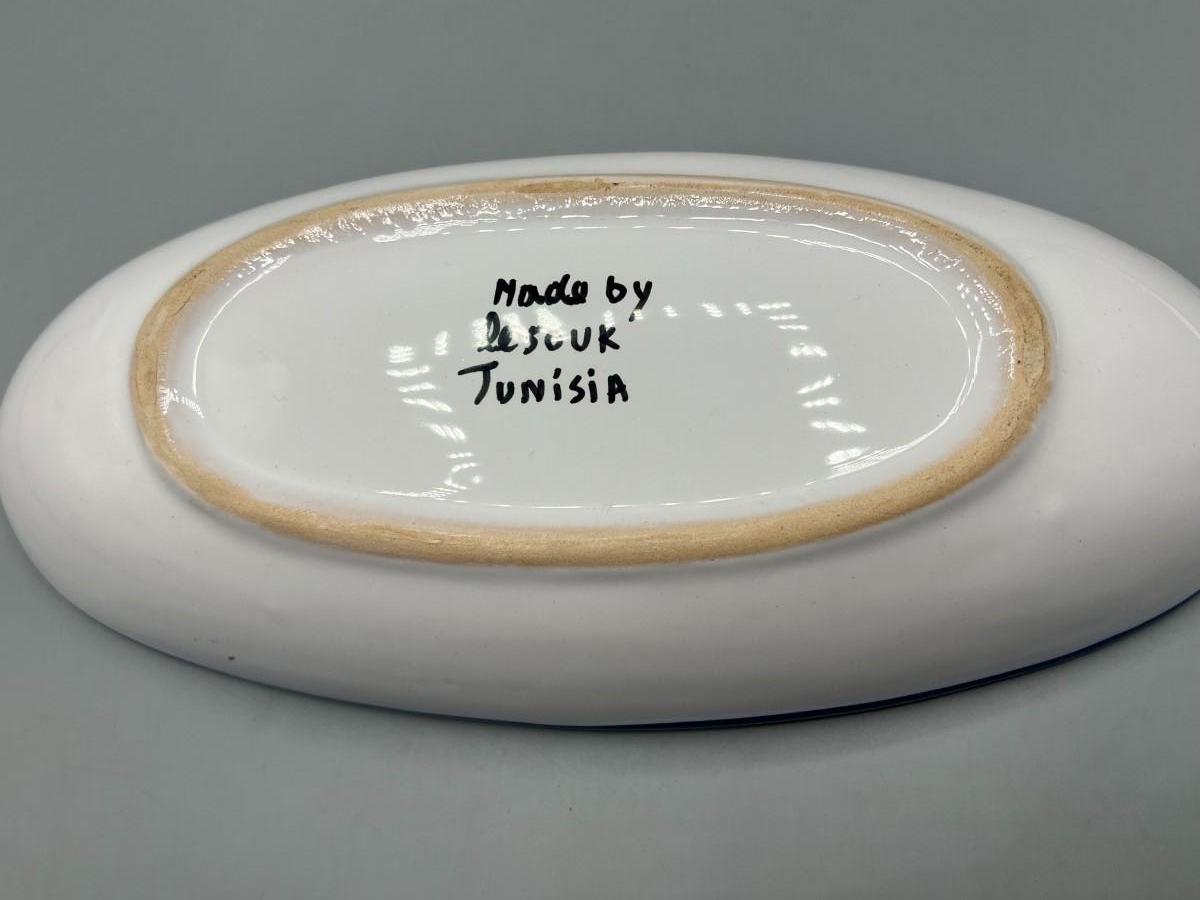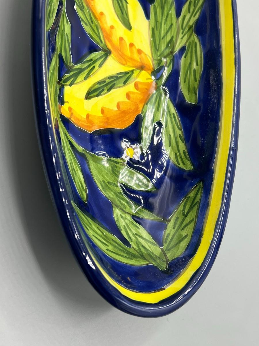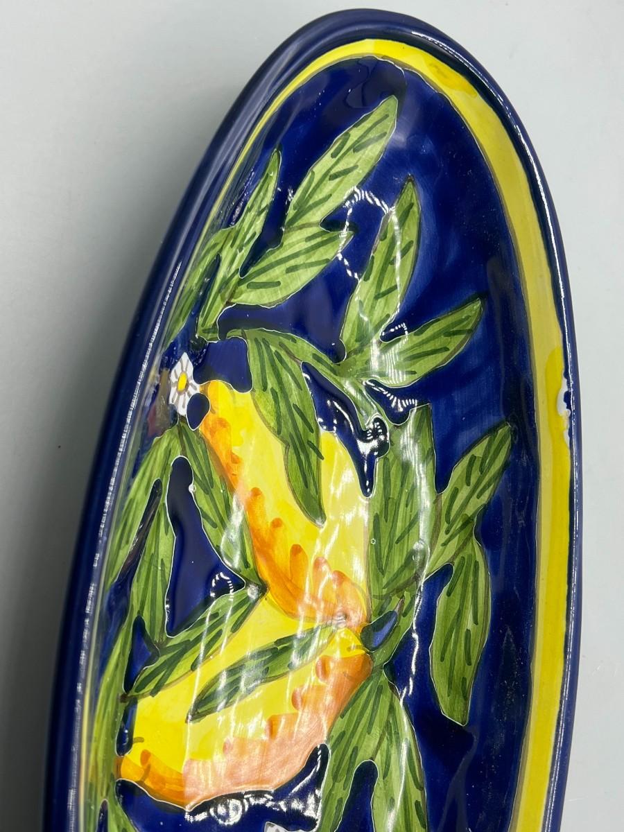 Hand Painted Oblong Serving Dish Cobalt with Yellow Lemons Tunisia. In good condition. Signed on the bottom. About 10" size.