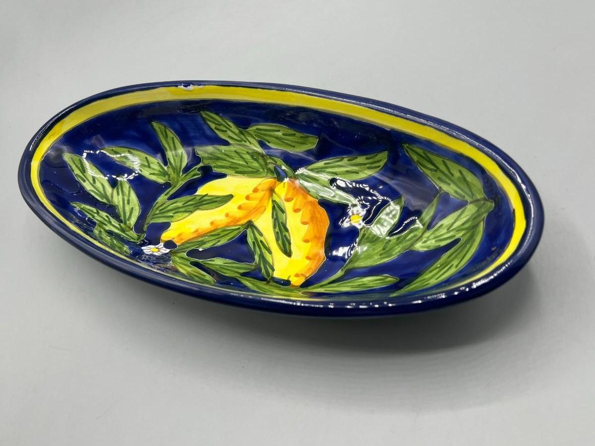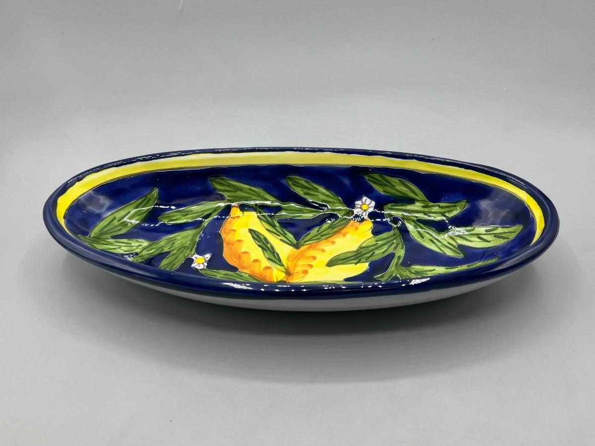 Hand Painted Oblong Serving Dish Cobalt with Yellow Lemons Tunisia