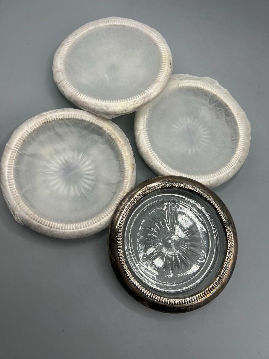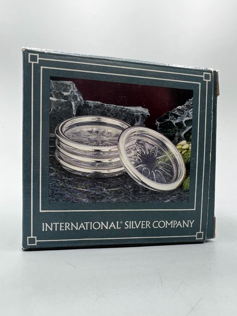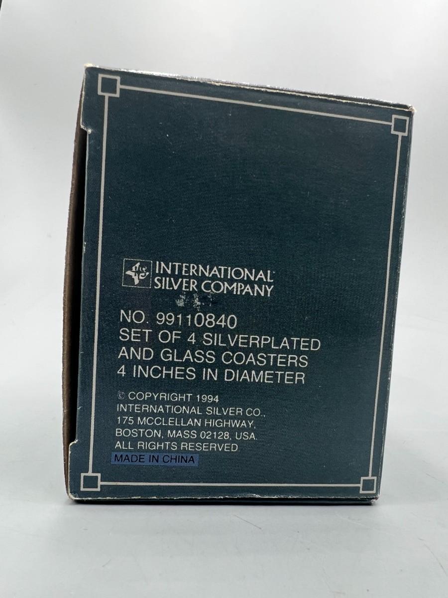 International Silver Company Set of 4 Drink Coasters with Box. In good condition, need to be polished. Silver plated edge on glass coaster. 4" size.