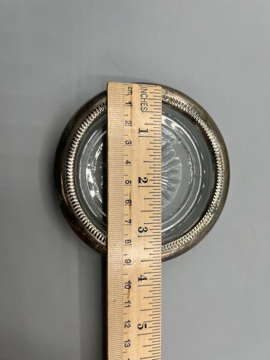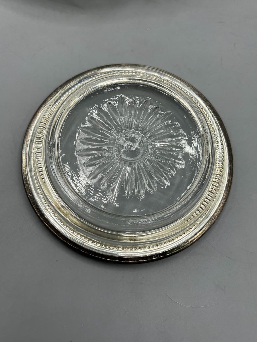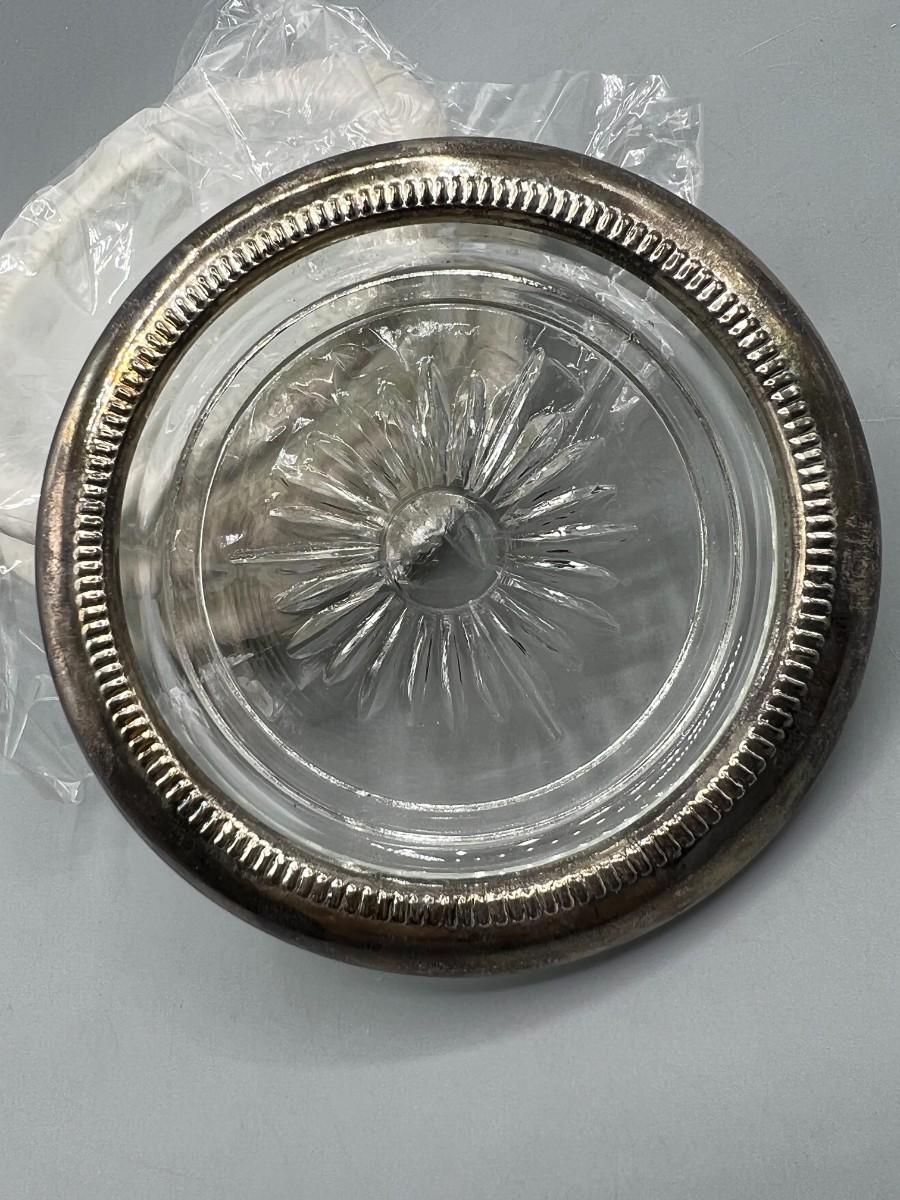 International Silver Company Set of 4 Drink Coasters with Box. In good condition, need to be polished. Silver plated edge on glass coaster. 4" size.