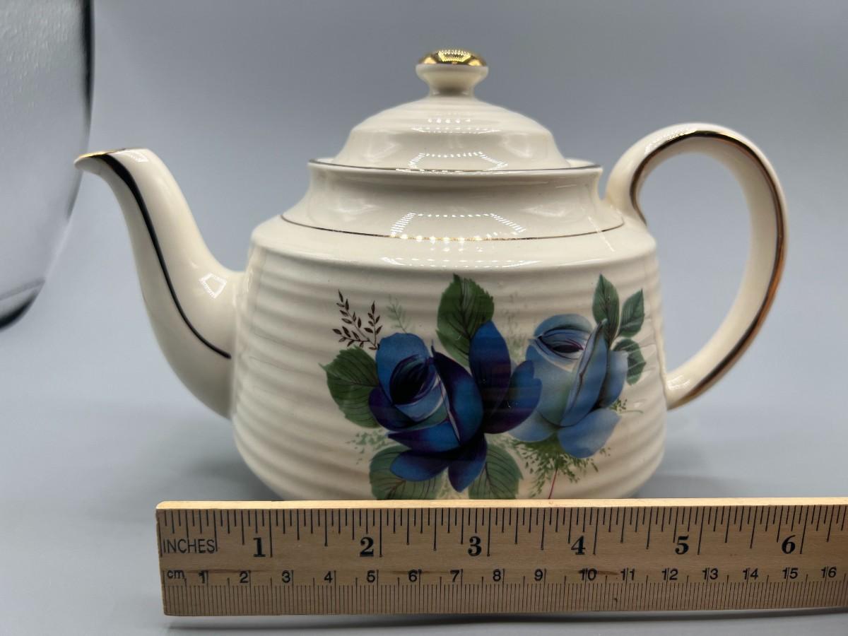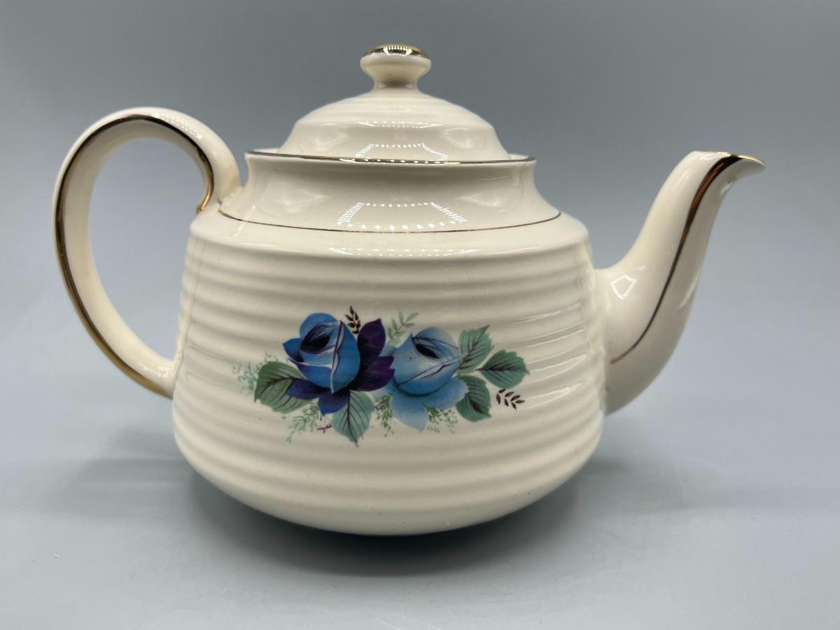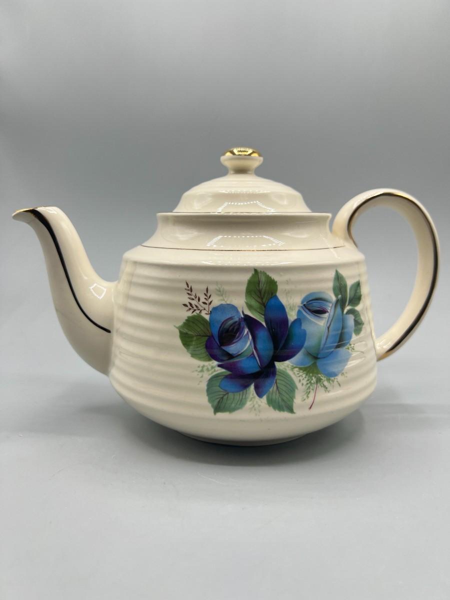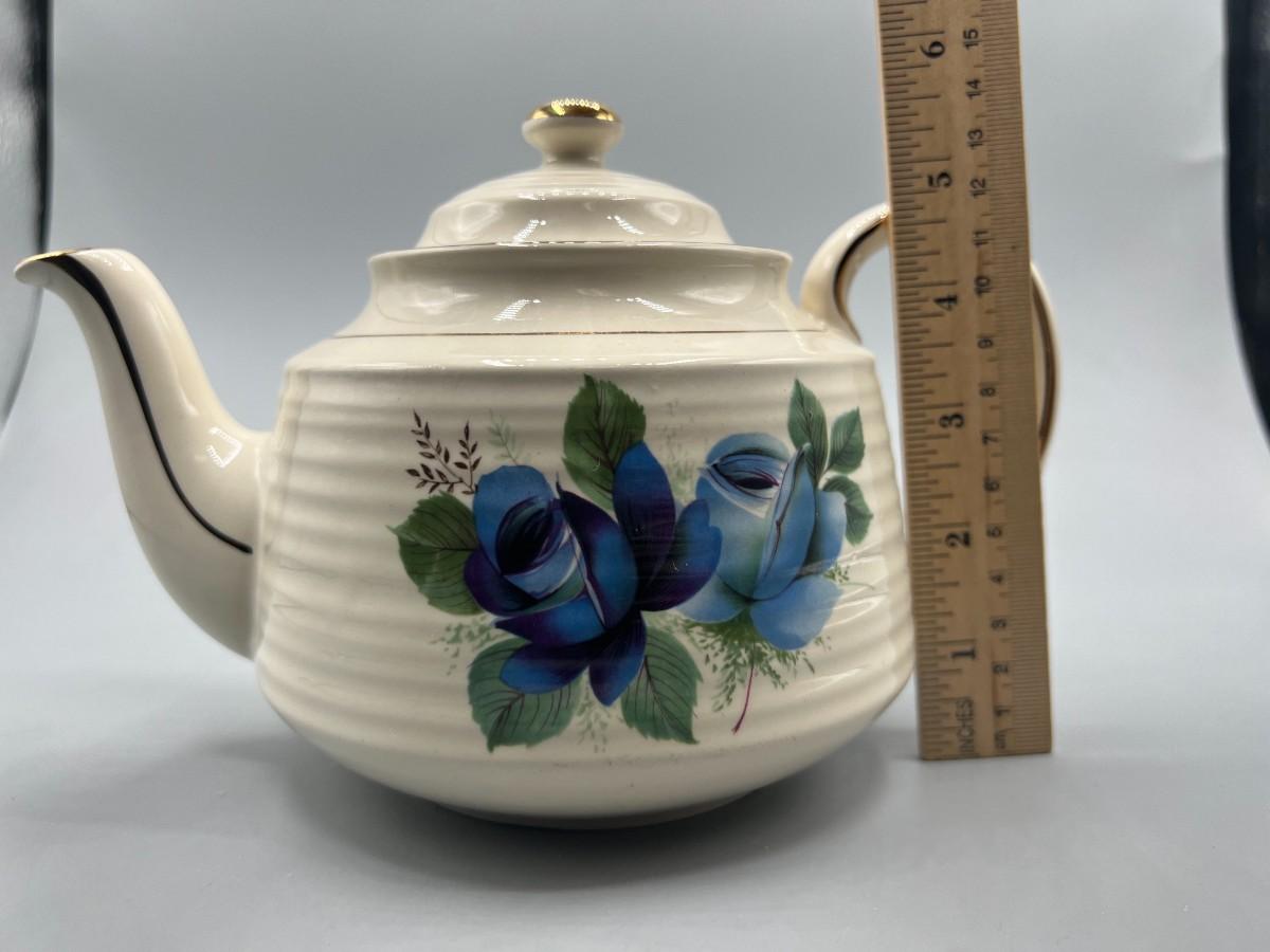 Vintage Ribbed Ceramic Blue Roses Tea Pot. In good vintage condition. Beautiful blue floral design. Stamped and numbers on the bottom.