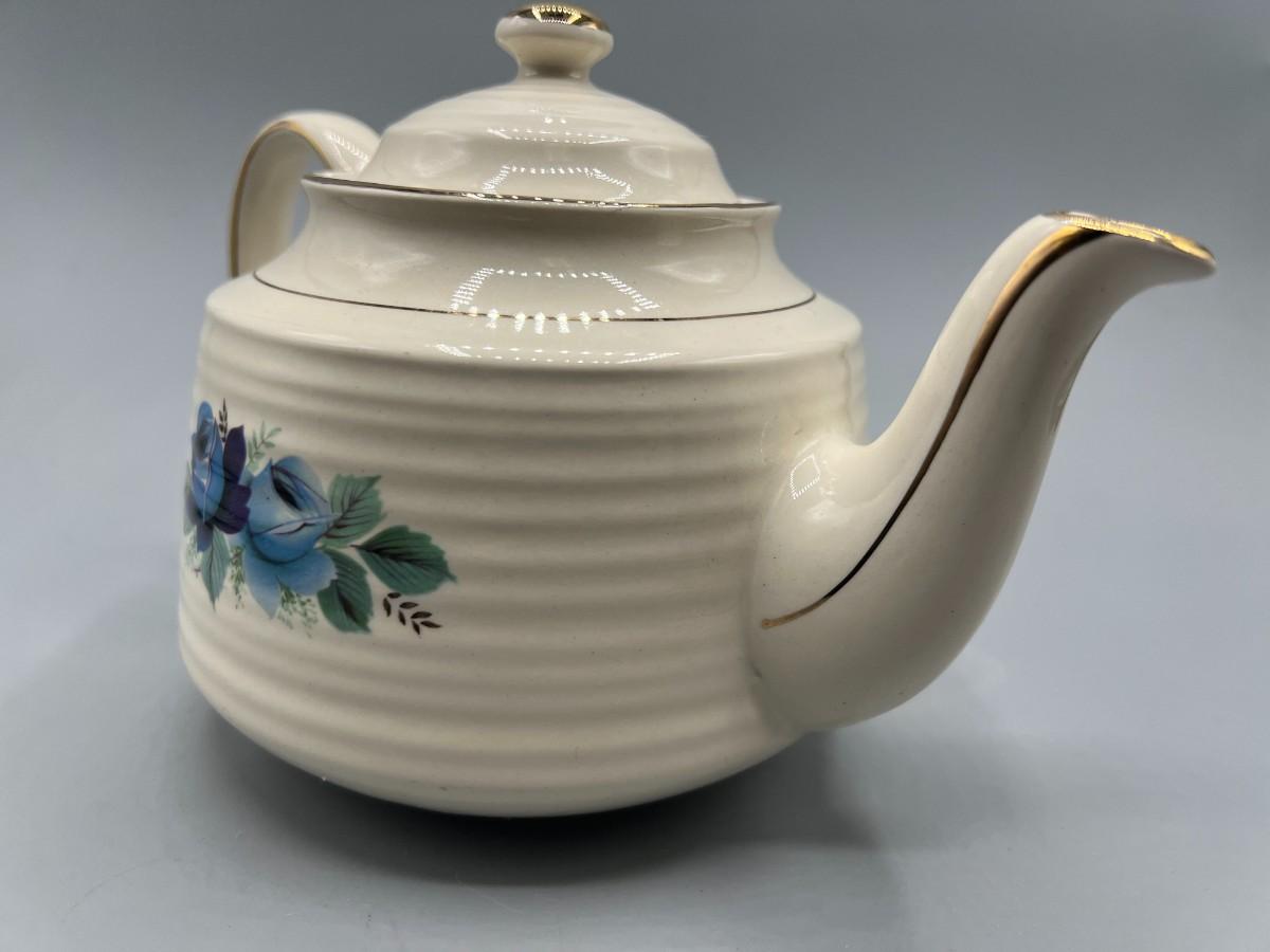 Vintage Ribbed Ceramic Blue Roses Tea Pot