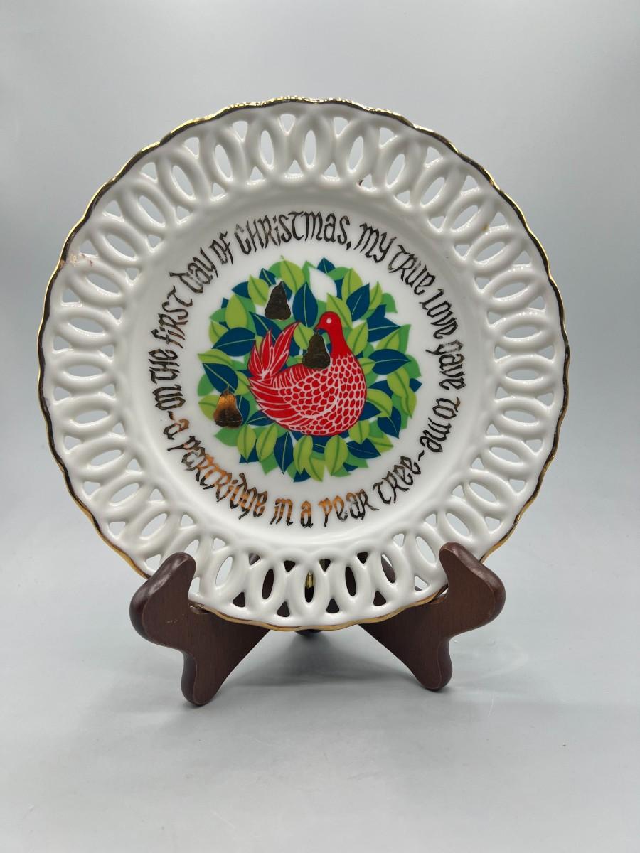 Vintage Midcentury Fred Roberts Co. First Day of Christmas Collector Plate. in good vintage condition. Some light wear from use and display. Original sticker still attached to the back.