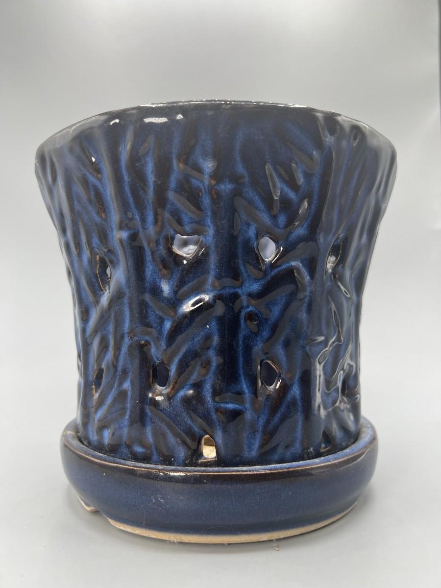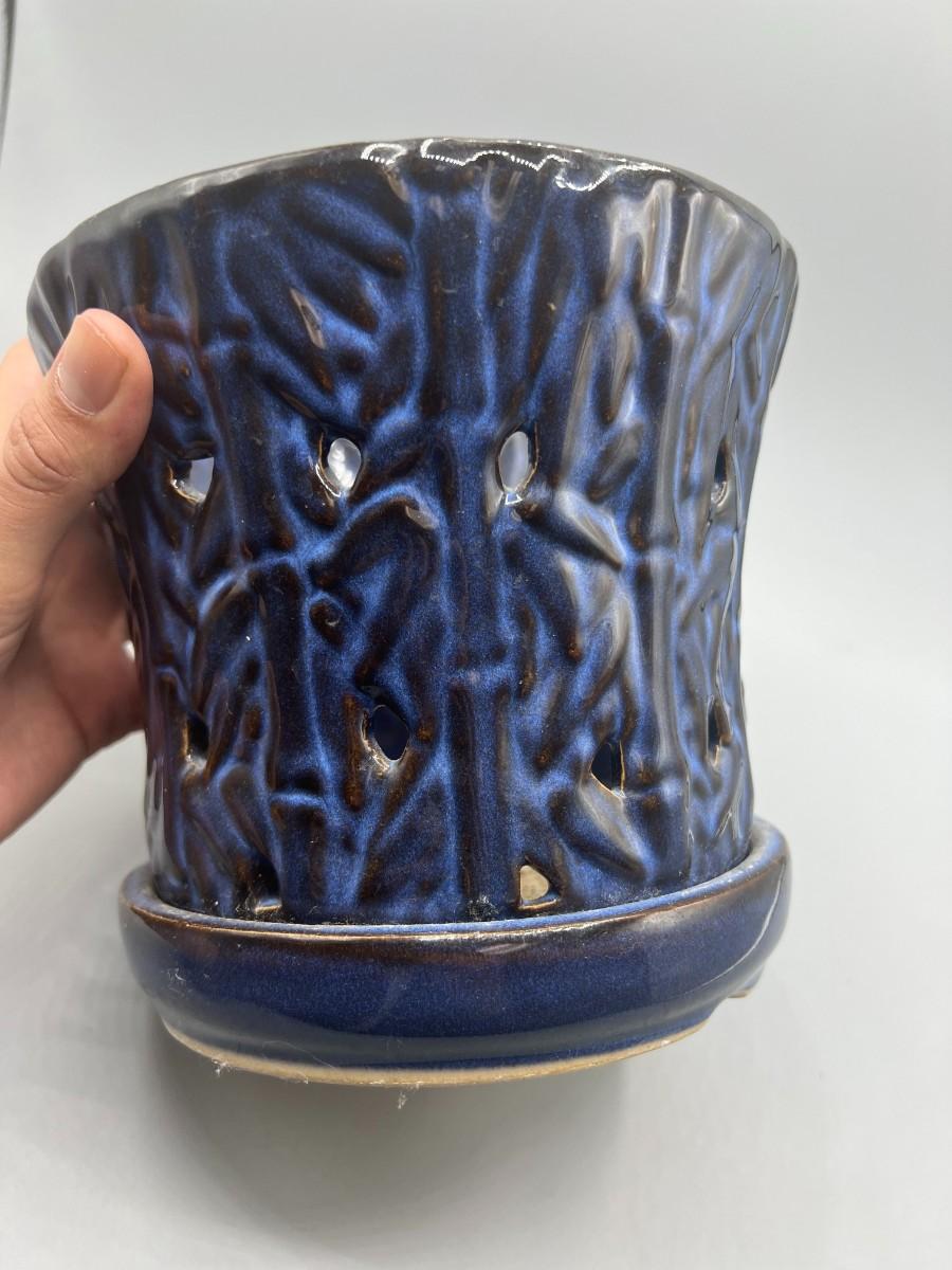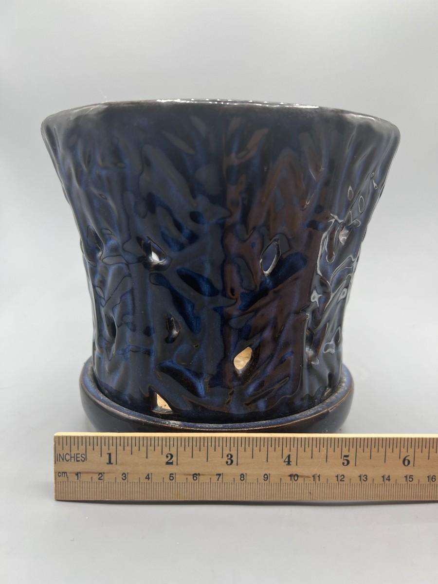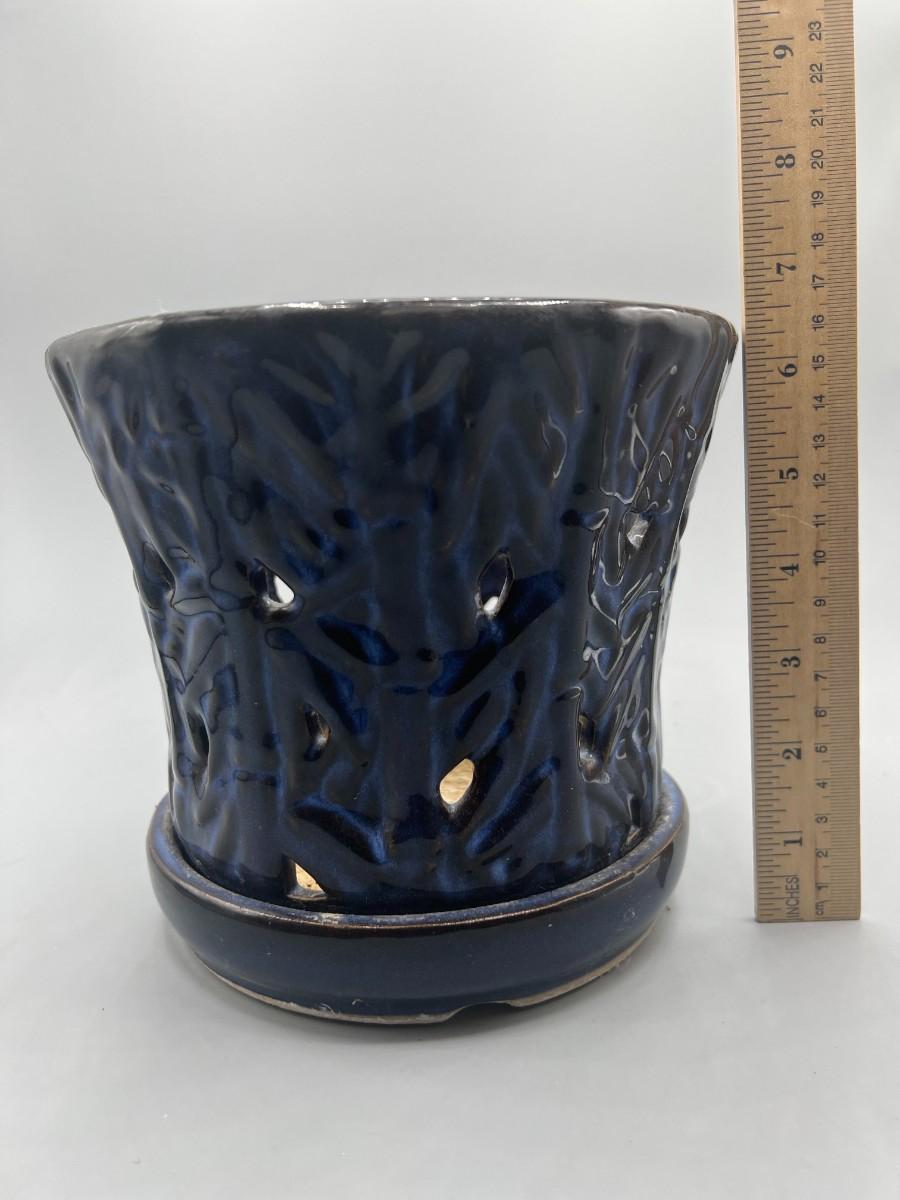 Dark Blue Bamboo Embossed Planter Pot. Planter has an embossed bamboo stock design with open work all over. In good used condition. About 6" tall.