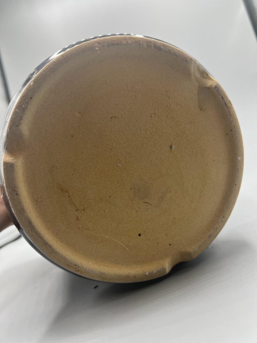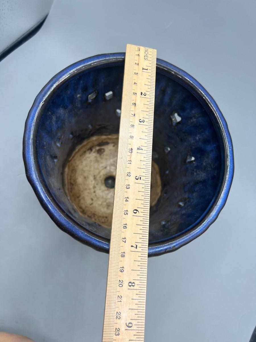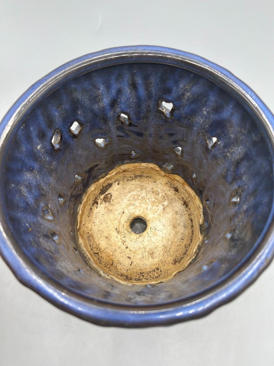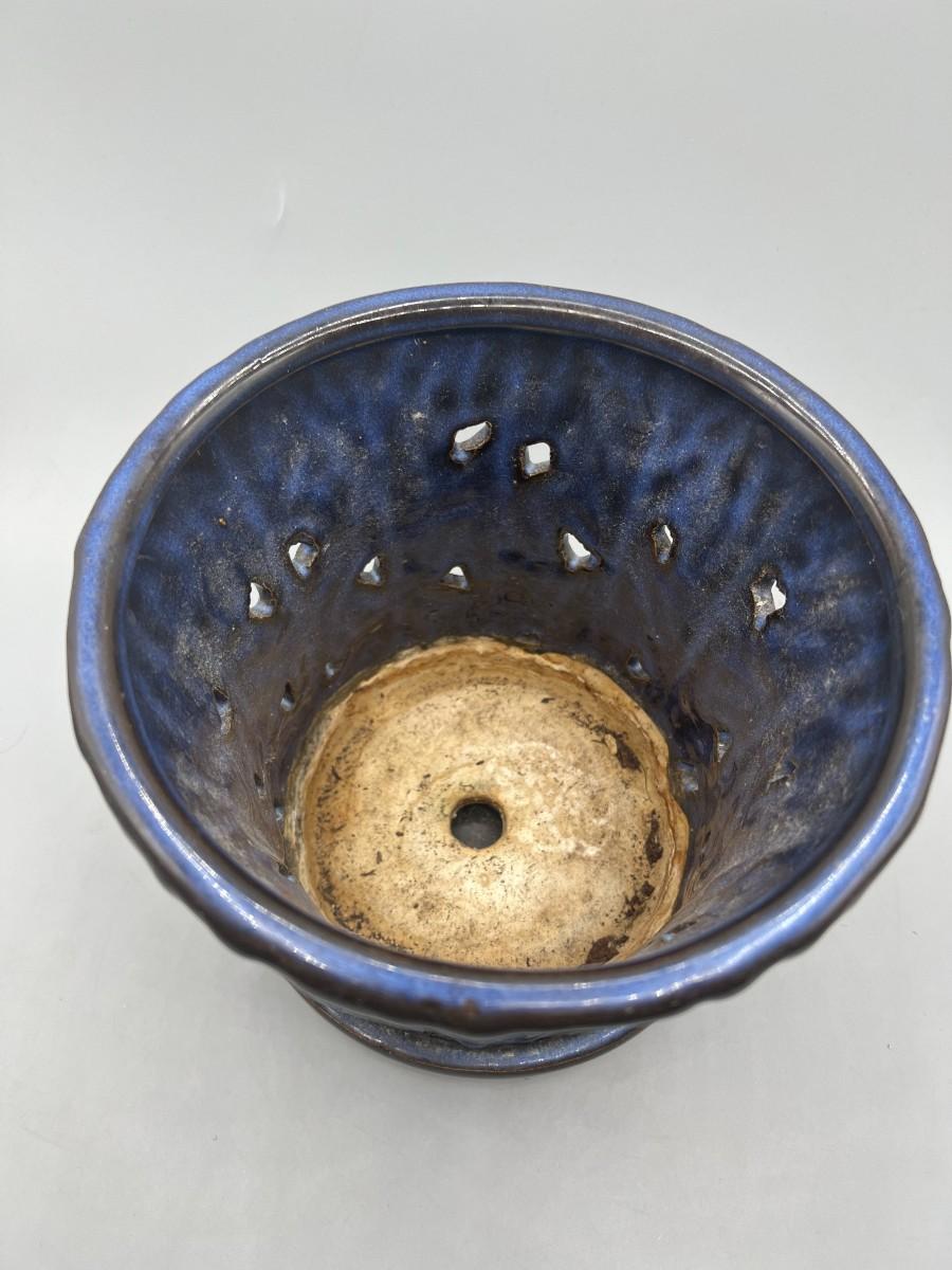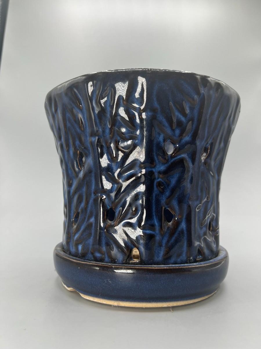 Dark Blue Bamboo Embossed Planter Pot. Planter has an embossed bamboo stock design with open work all over. In good used condition. About 6" tall.