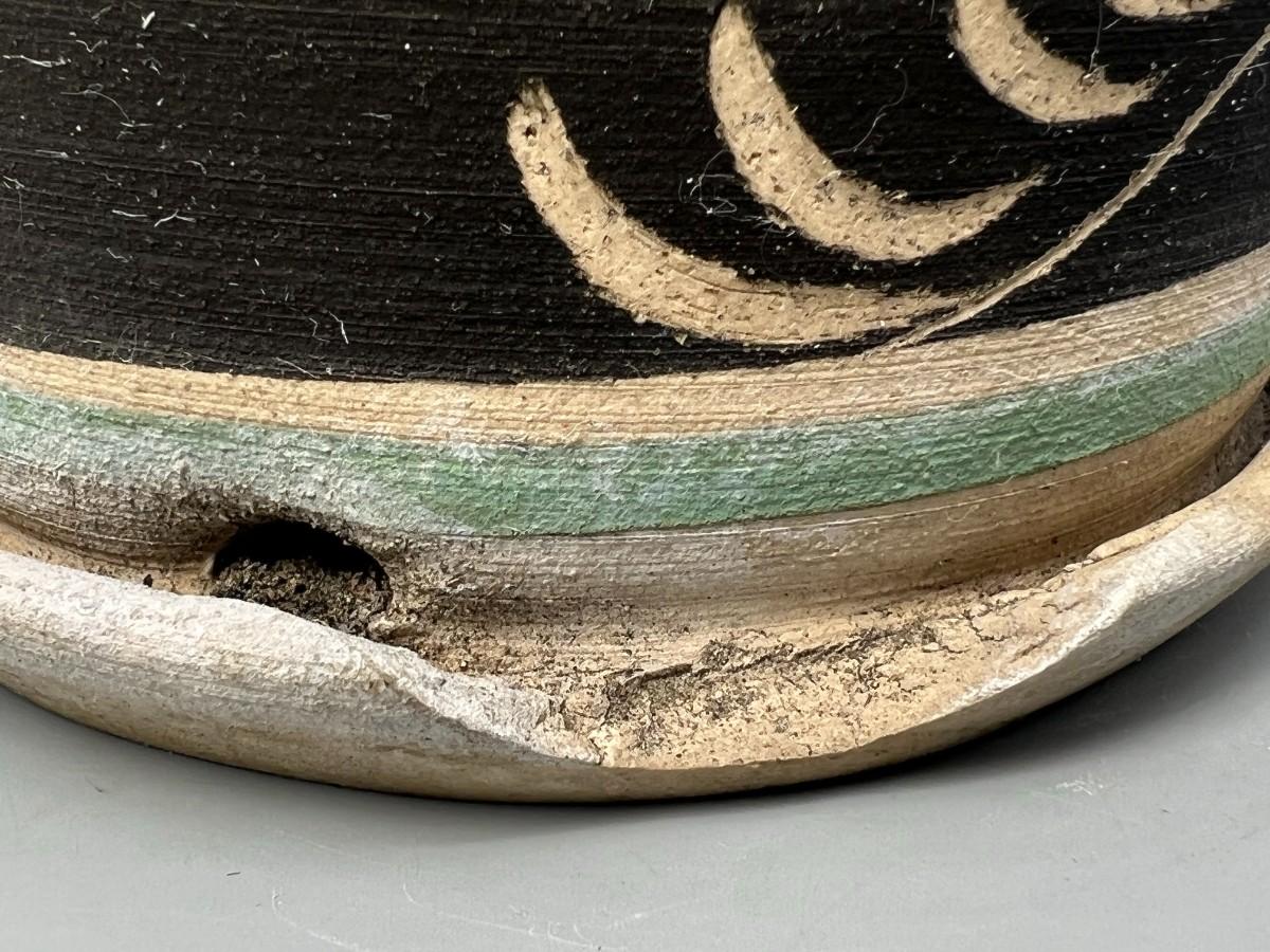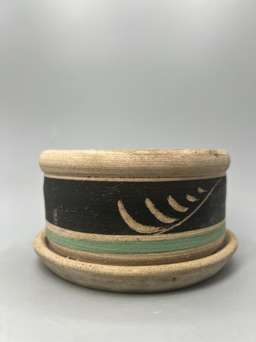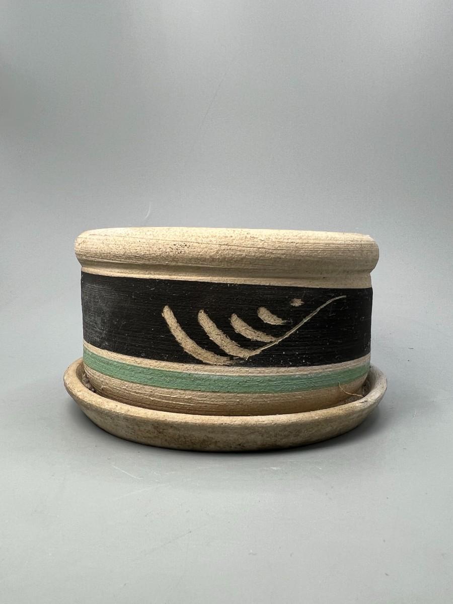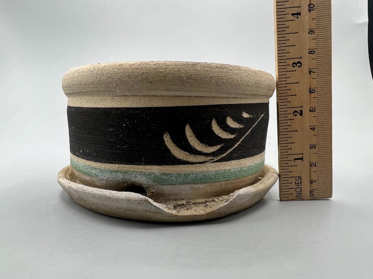 Small Thrown Pottery Clay Flower Planter Pot. Black and green color detail. There is a chip along the bottom edge on one side but can still be displayed nicely. 4.5" diameter.