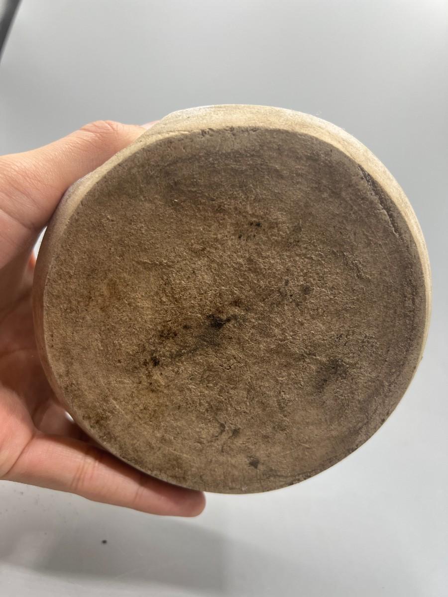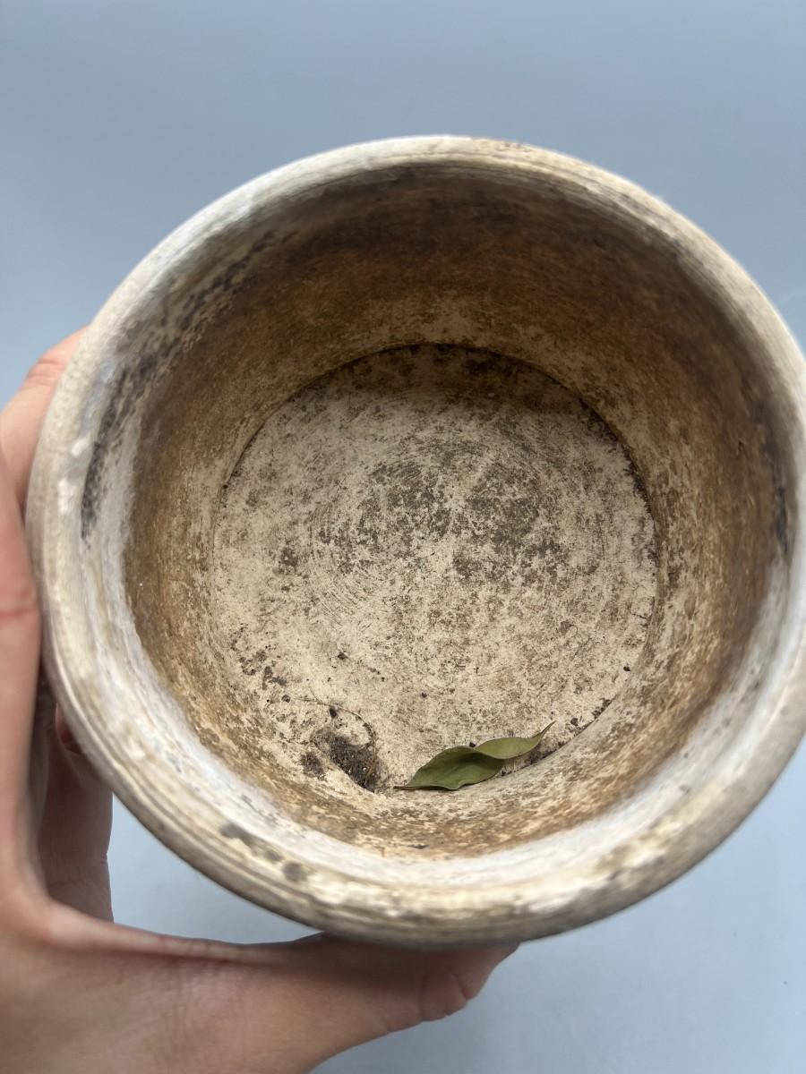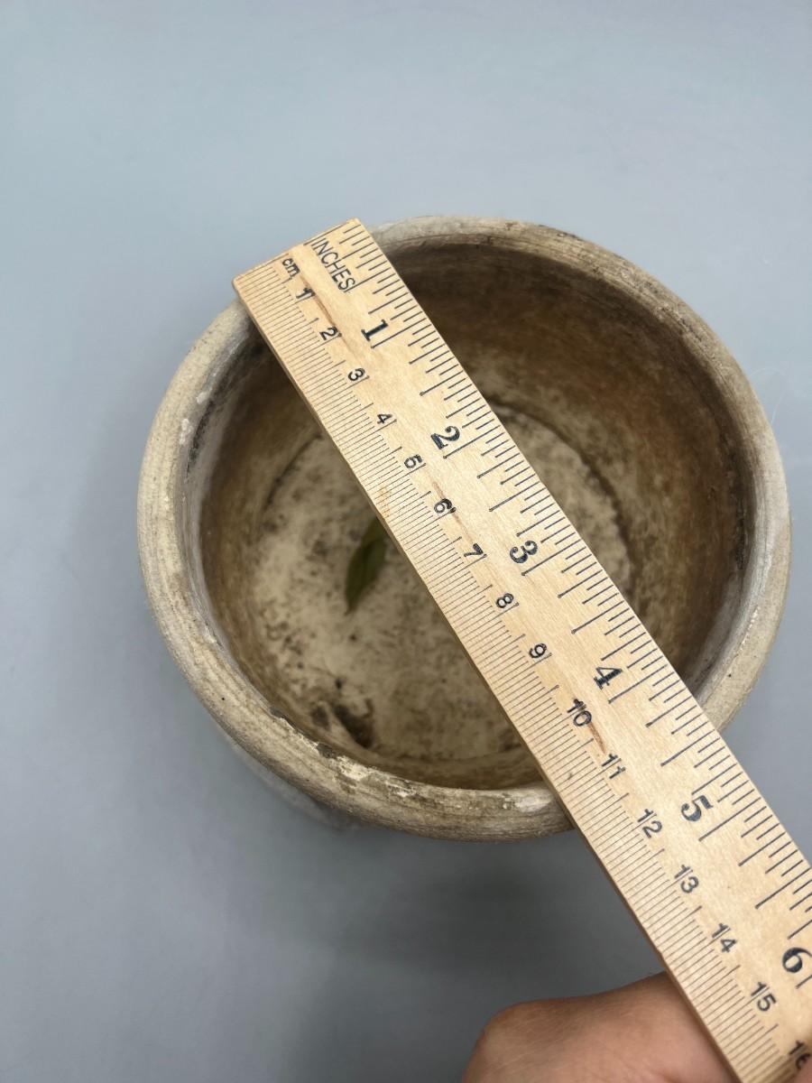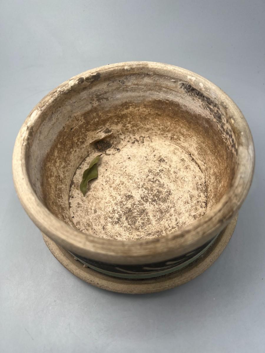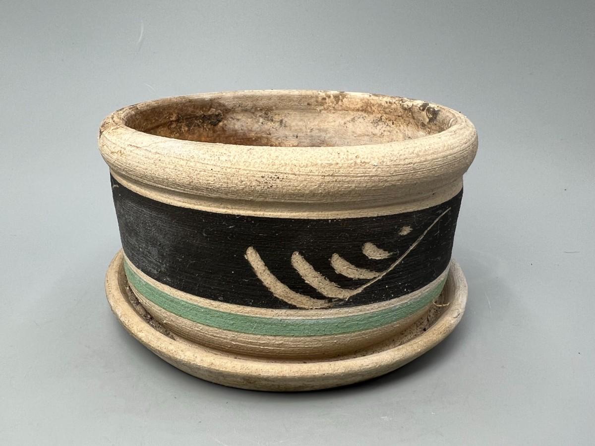Small Thrown Pottery Clay Flower Planter Pot. Black and green color detail. There is a chip along the bottom edge on one side but can still be displayed nicely. 4.5" diameter.