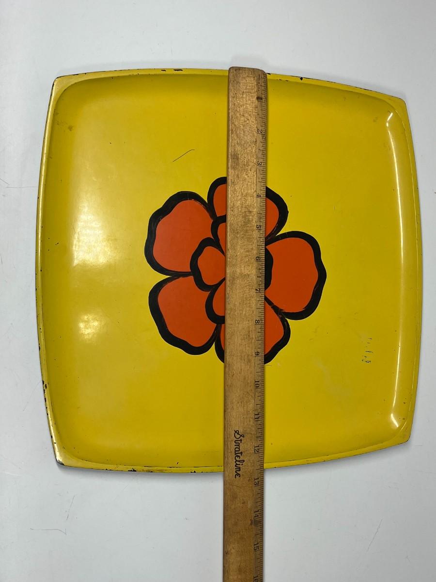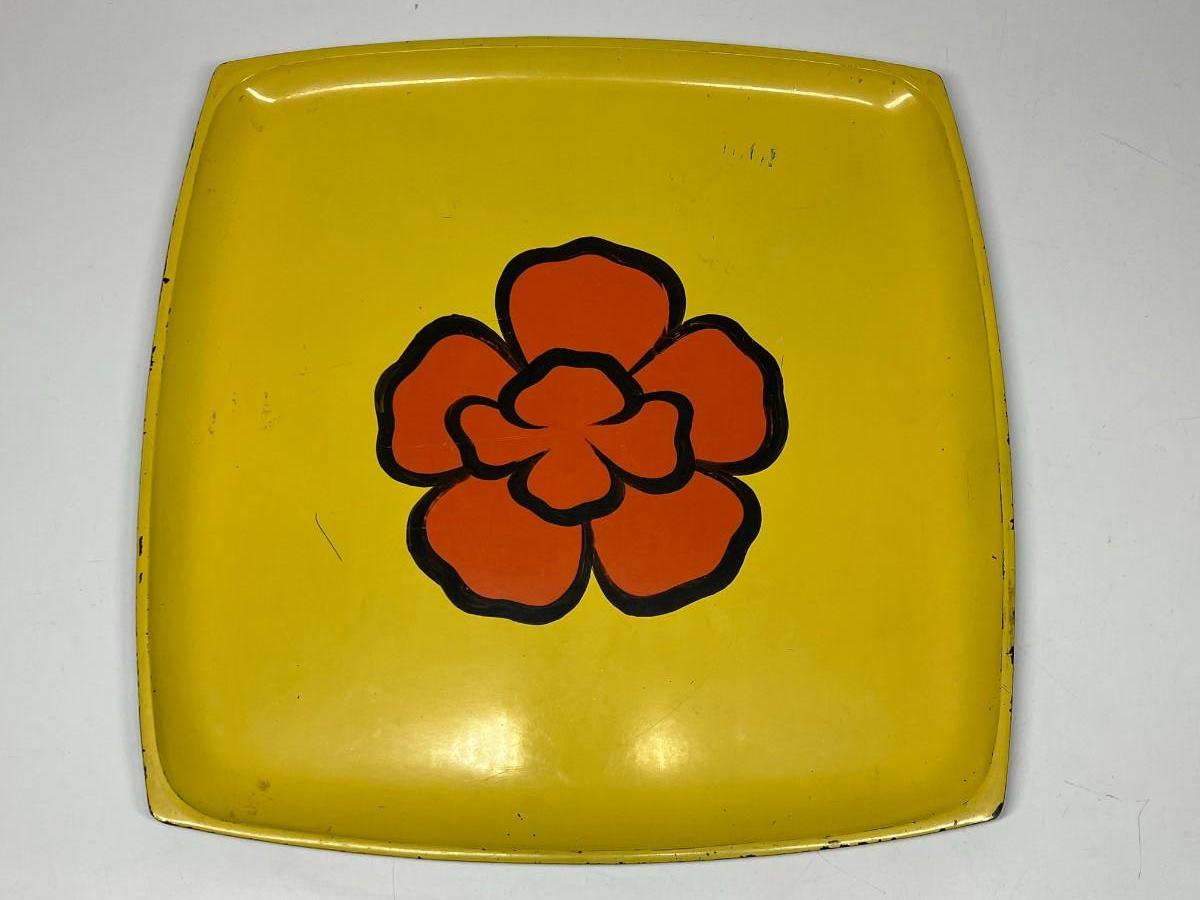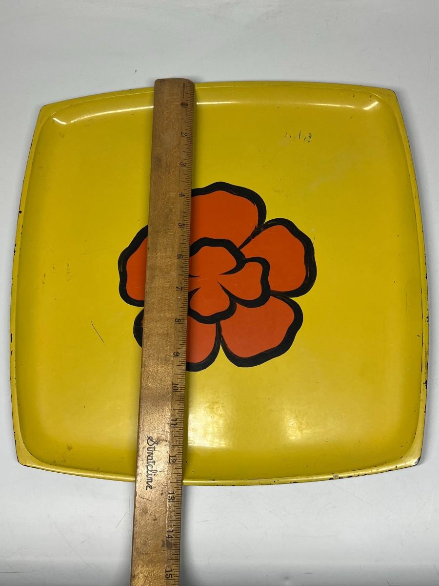 Vintage Mod Yellow and Orange Flower Center Square Serving Plate Tray. In vintage previously used condition. Some light scratches. About 13" diameter. Partial sticker on the back.