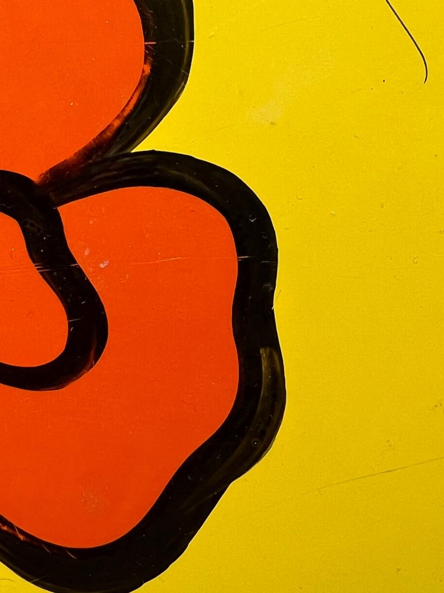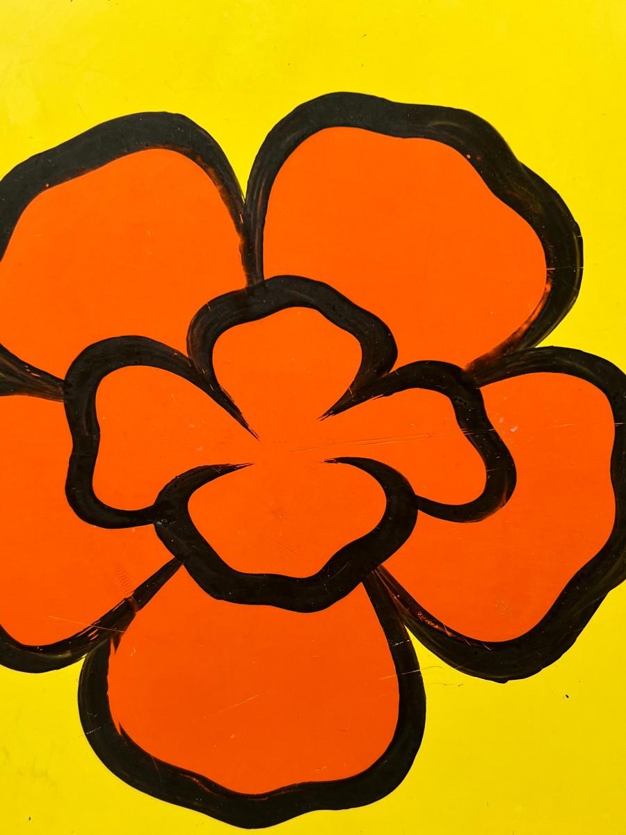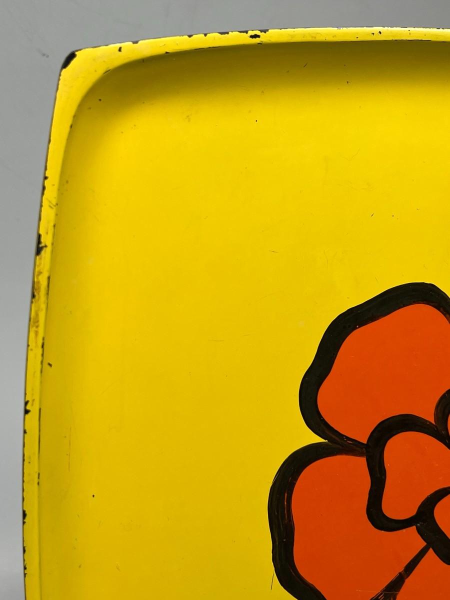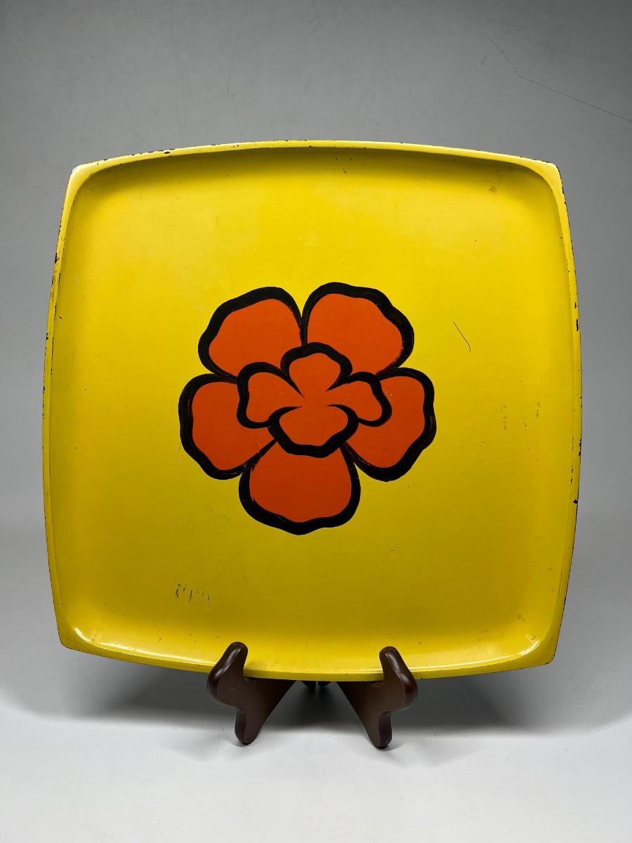 Vintage Mod Yellow and Orange Flower Center Square Serving Plate Tray. In vintage previously used condition. Some light scratches. About 13" diameter. Partial sticker on the back.