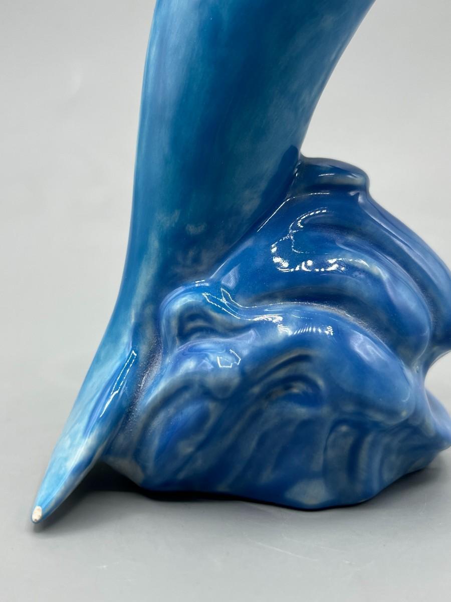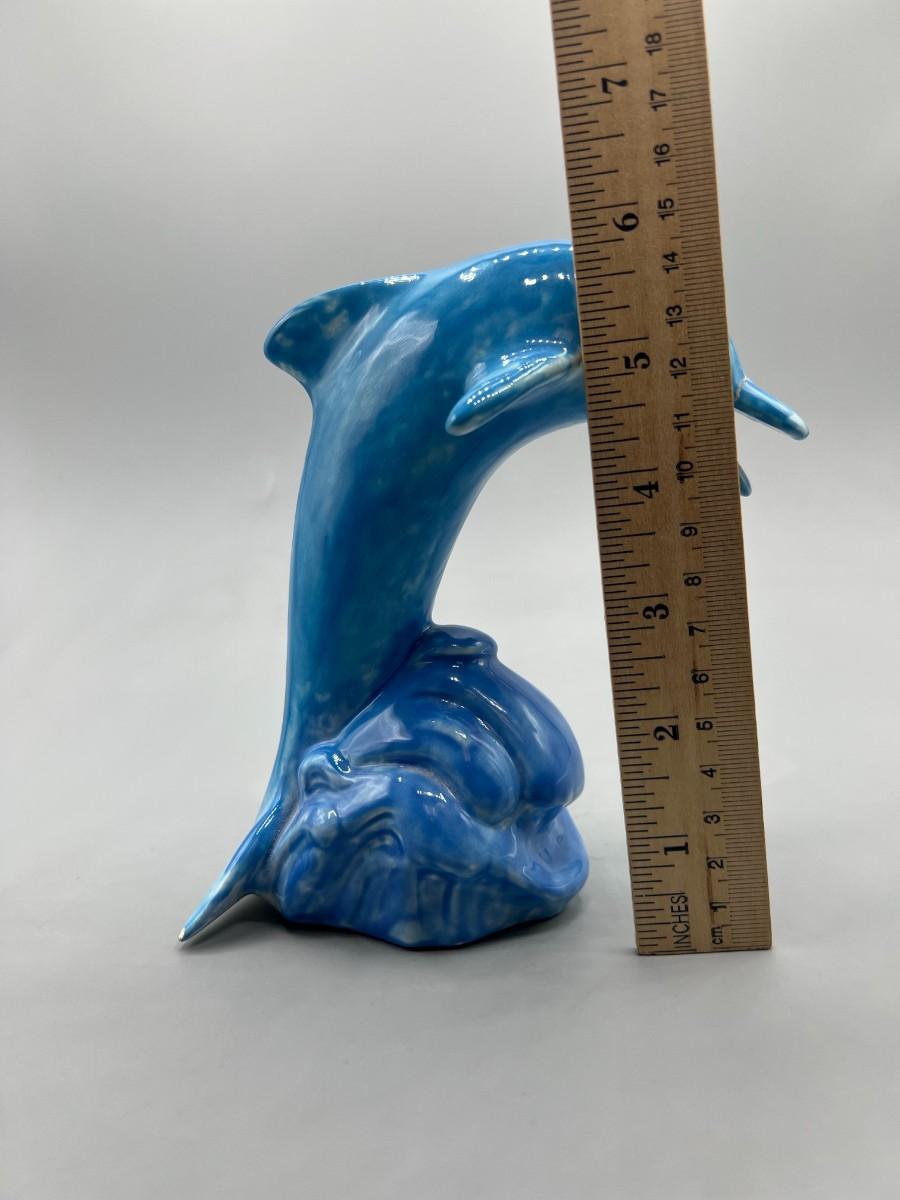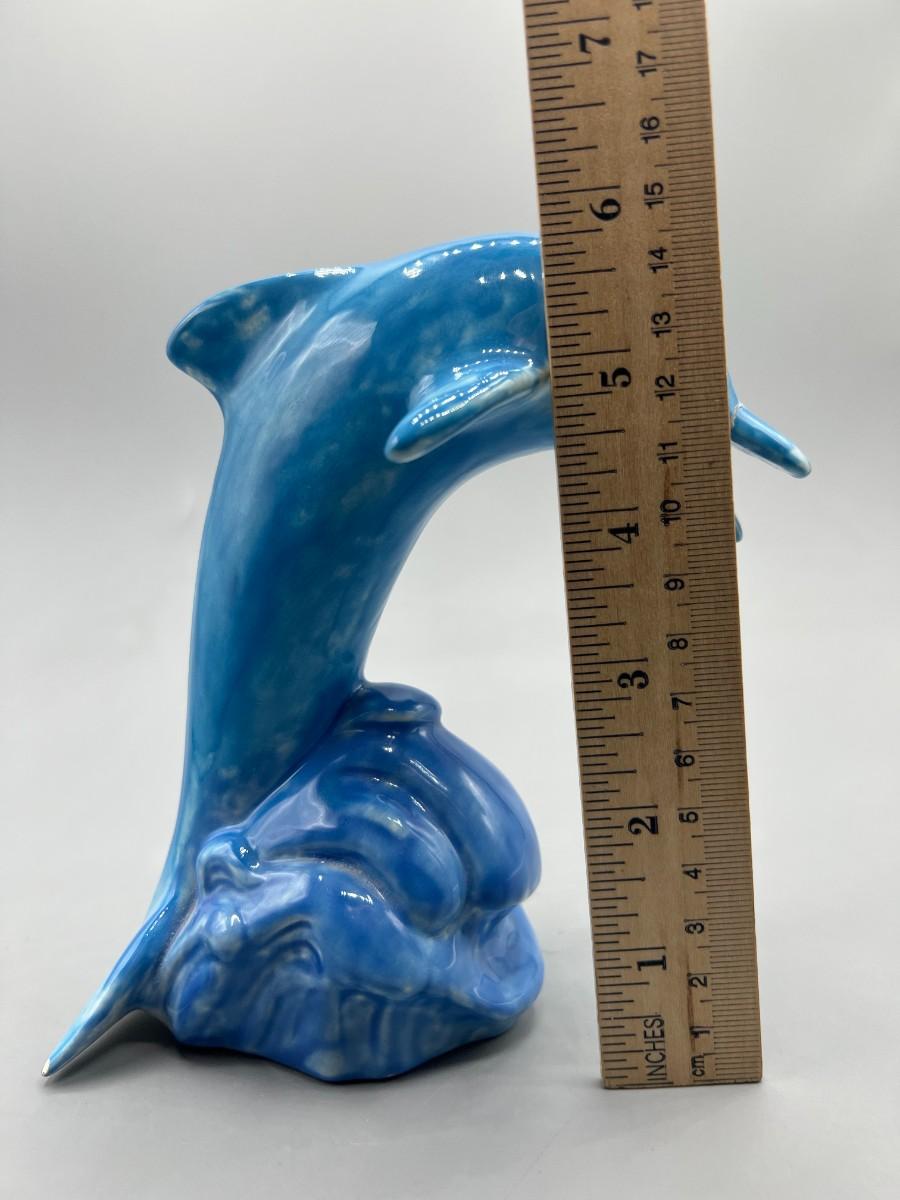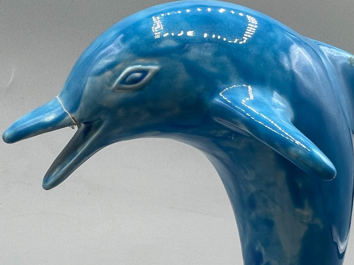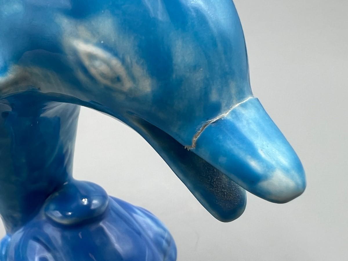 Swirled Blotchy Blue Painted Ceramic Dolphin Figurine. The blue paint is uneven on the entire piece. The nose has been repaired.