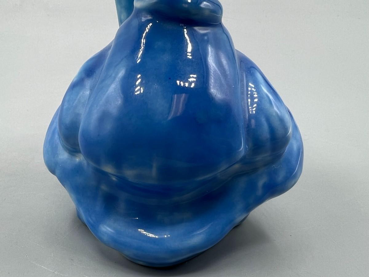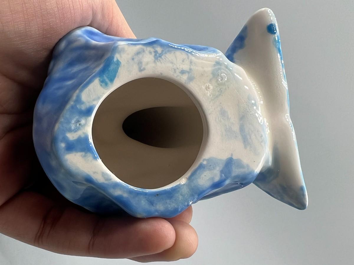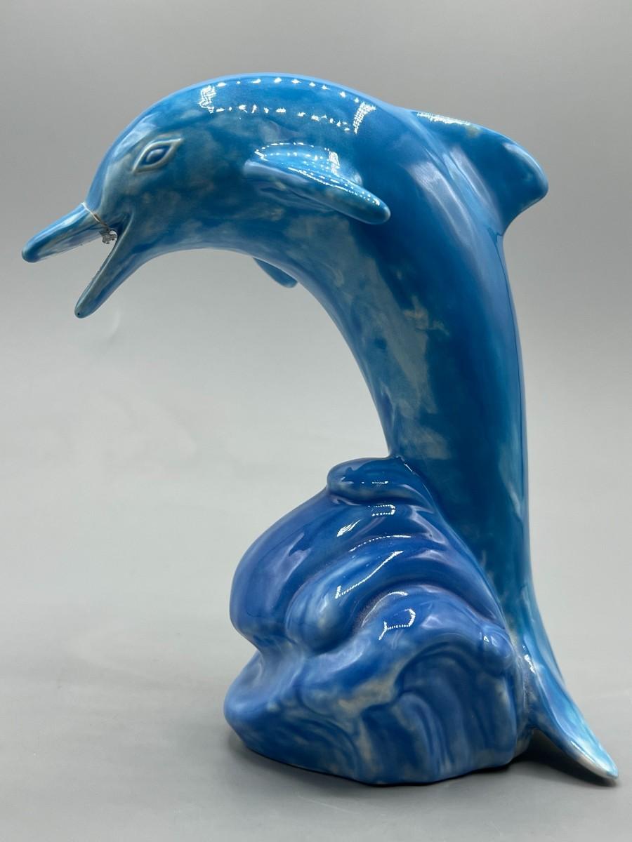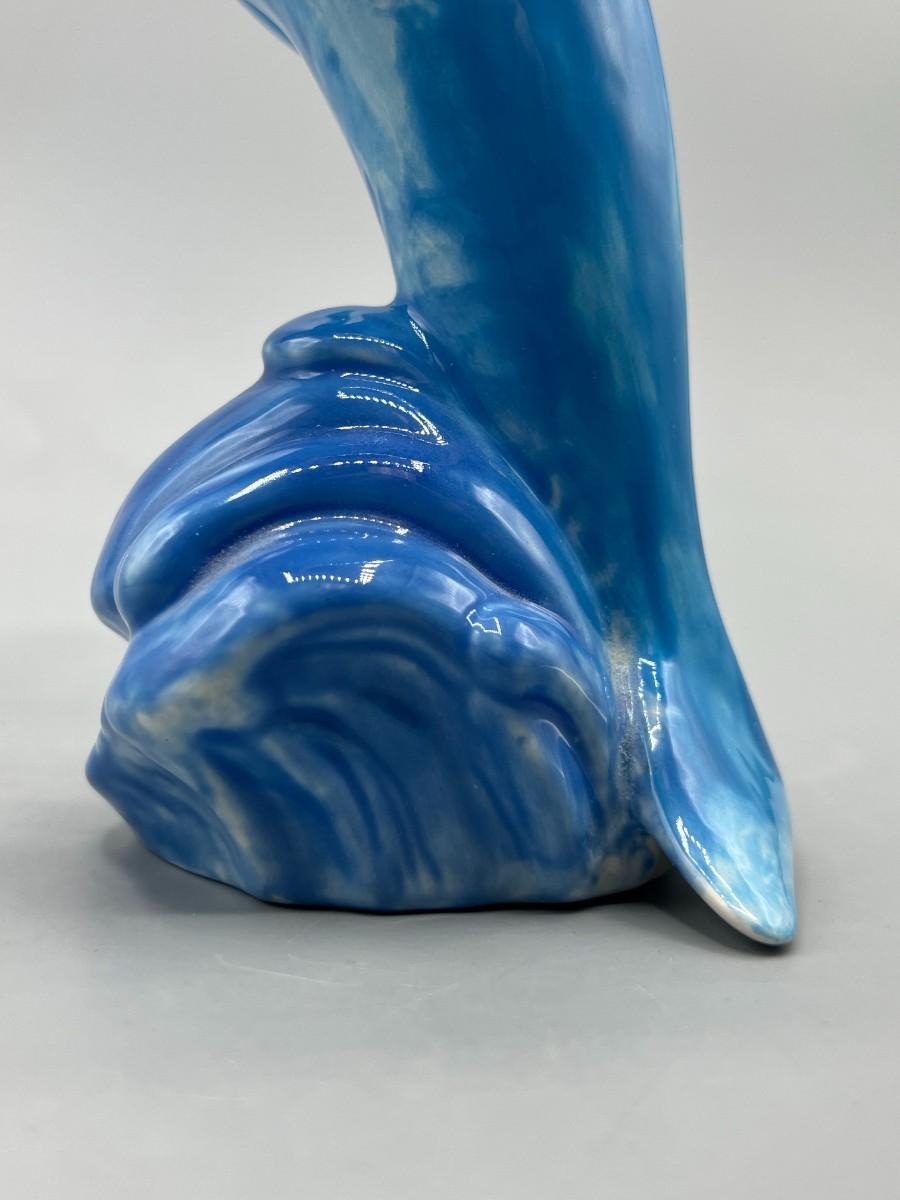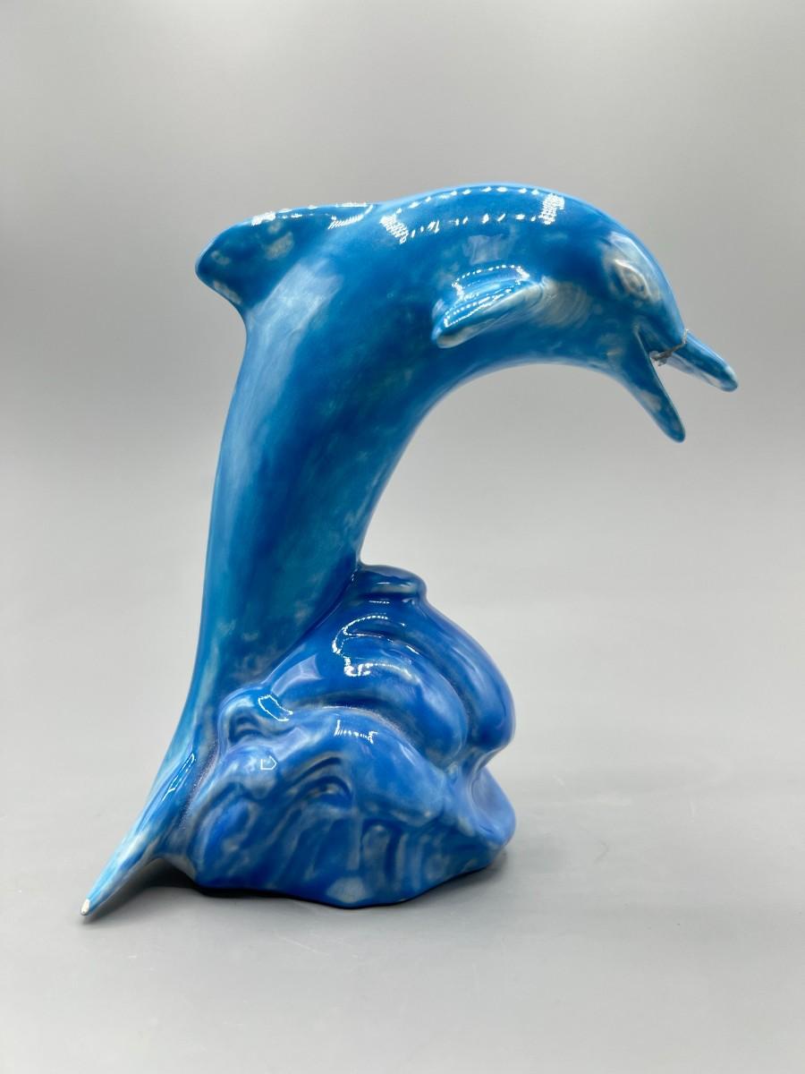 Swirled Blotchy Blue Painted Ceramic Dolphin Figurine. The blue paint is uneven on the entire piece. The nose has been repaired.