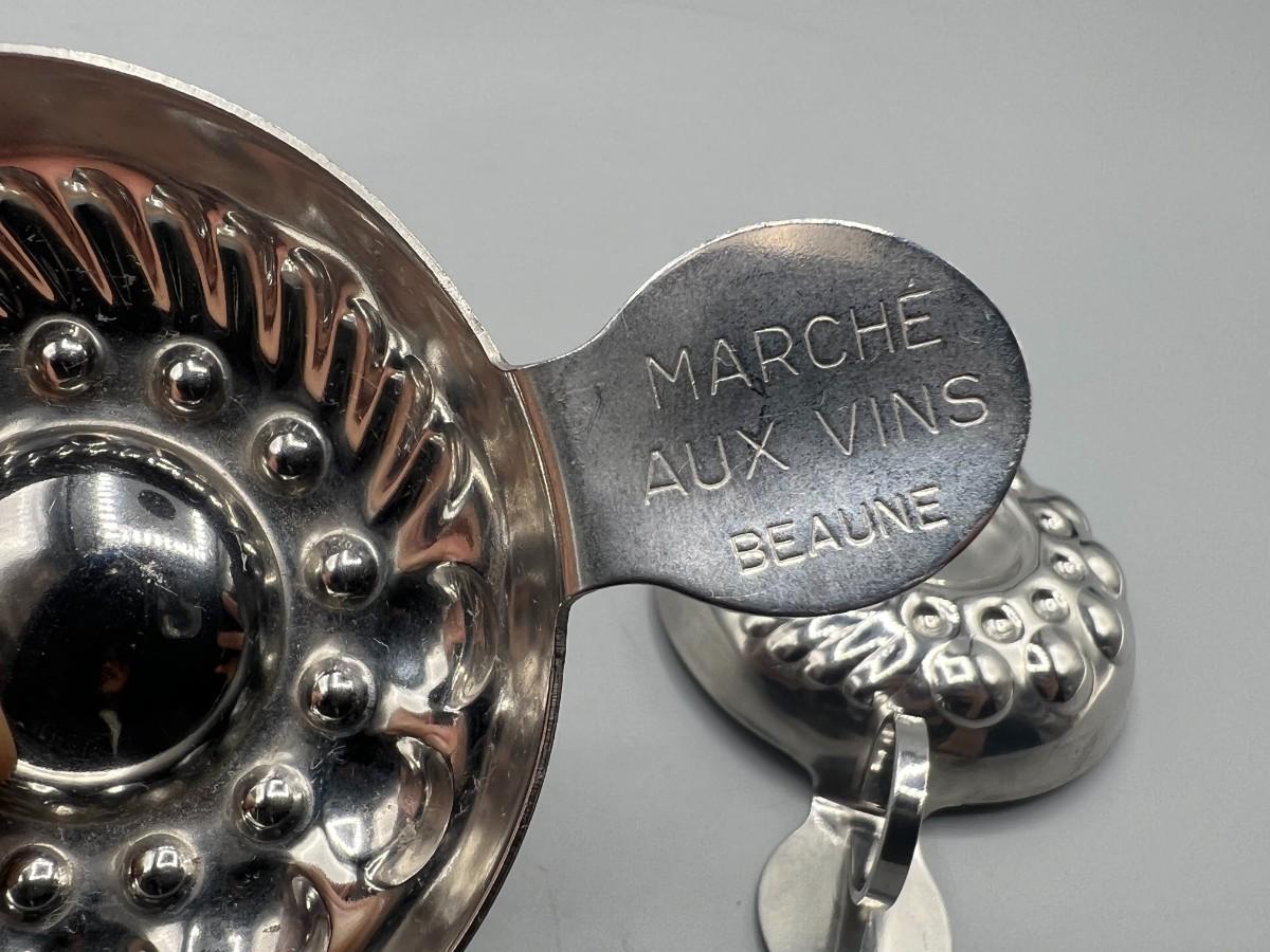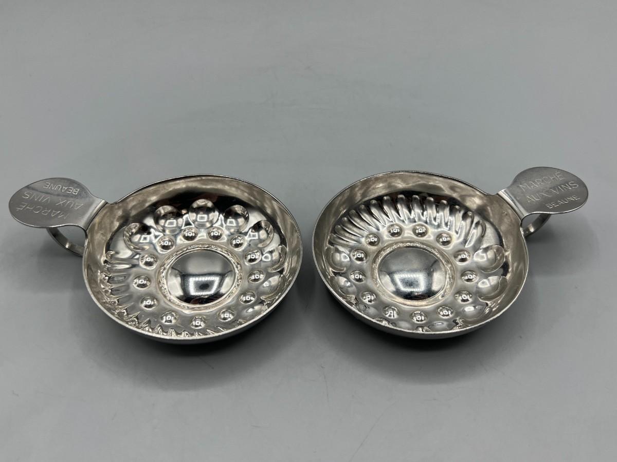 Pair of Vintage Silver Plated Wine Tasting Cups Marche Aux Vins Beaune. In good condition. Shallow tasting cups, probably souvenirs. About 3" diameter.
