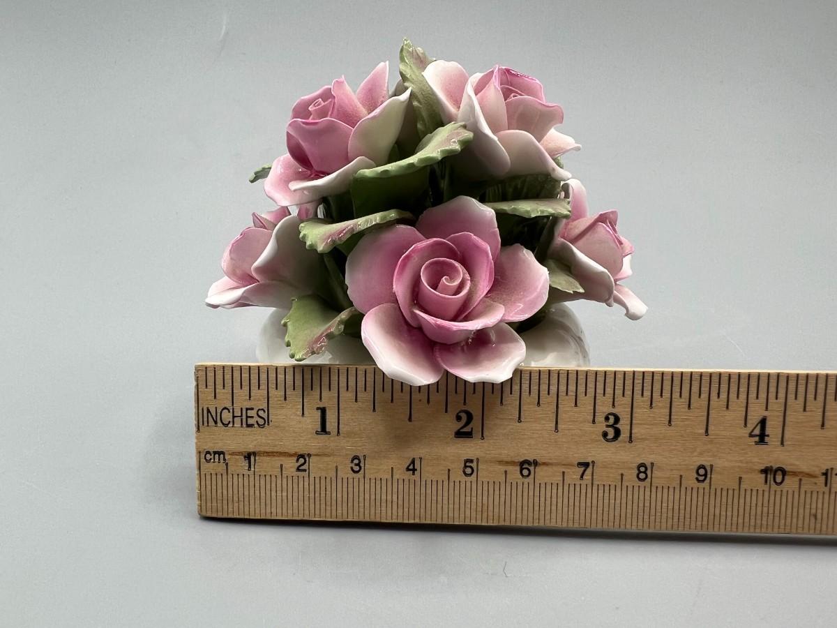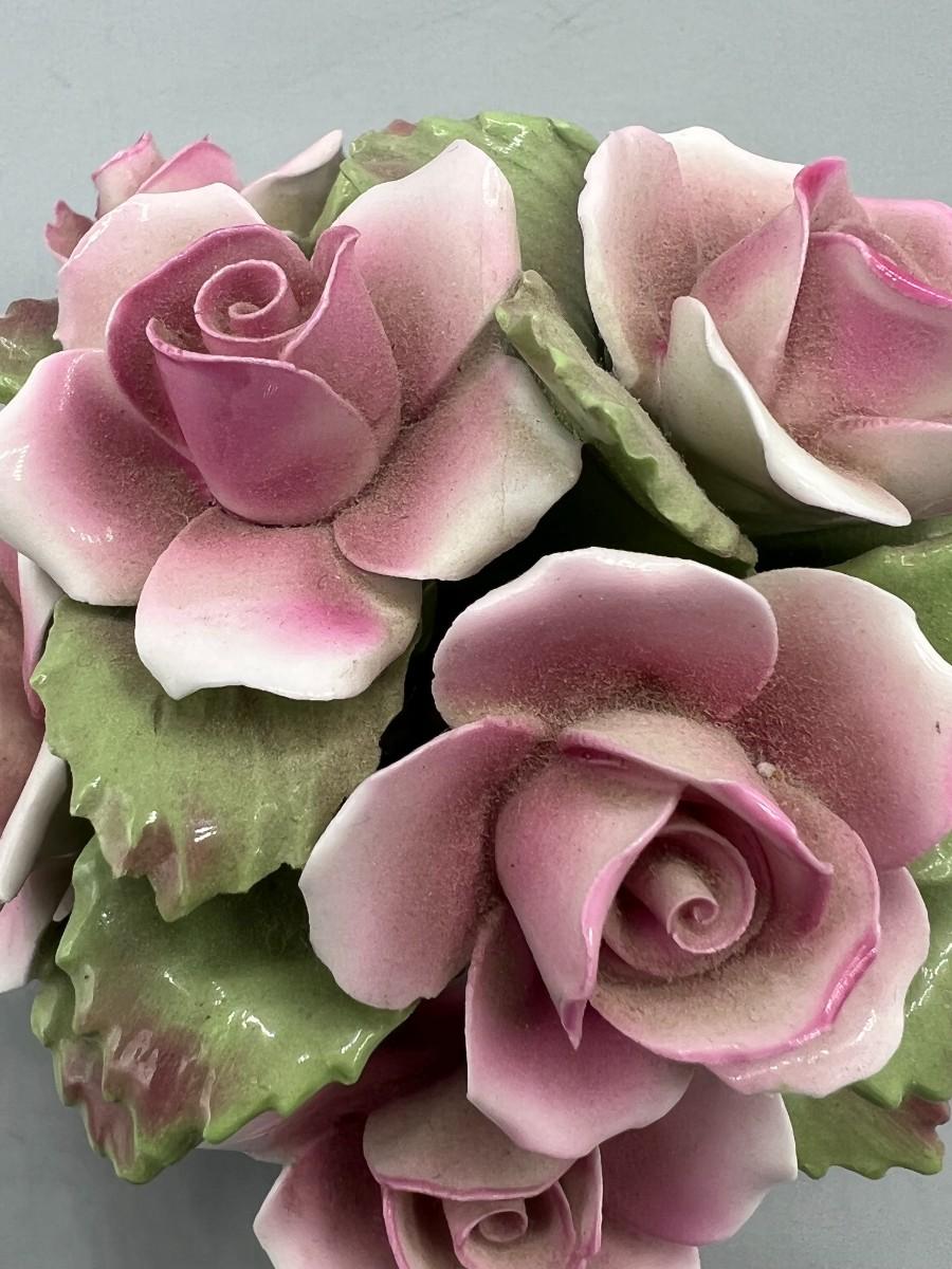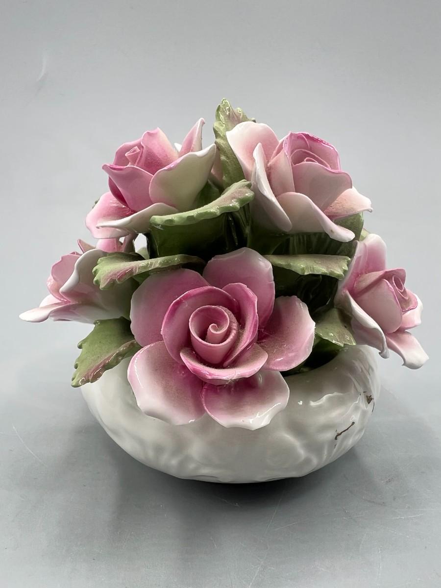 Vintage Aynsley Porcelain Pink Roses China Flower Figurine. In good condition. May have flea bite chips in petal edges but no major chips or damage noted. Needs to be cleaned, dusty from display. About 3" size.