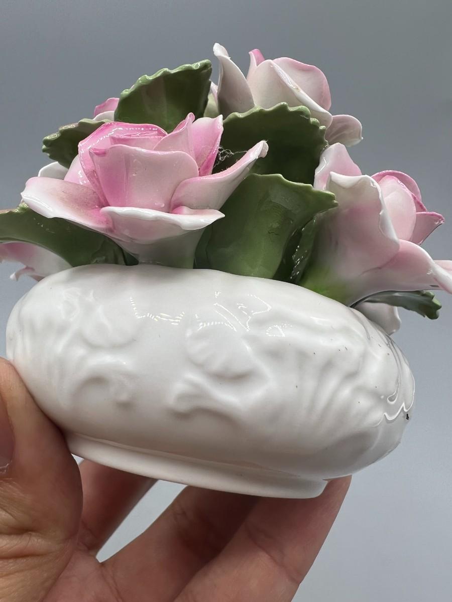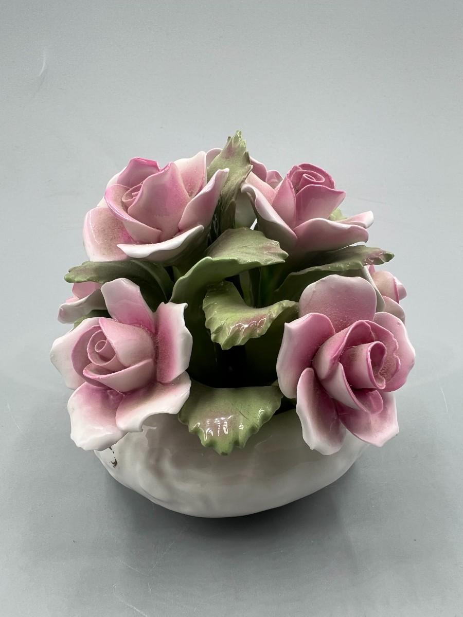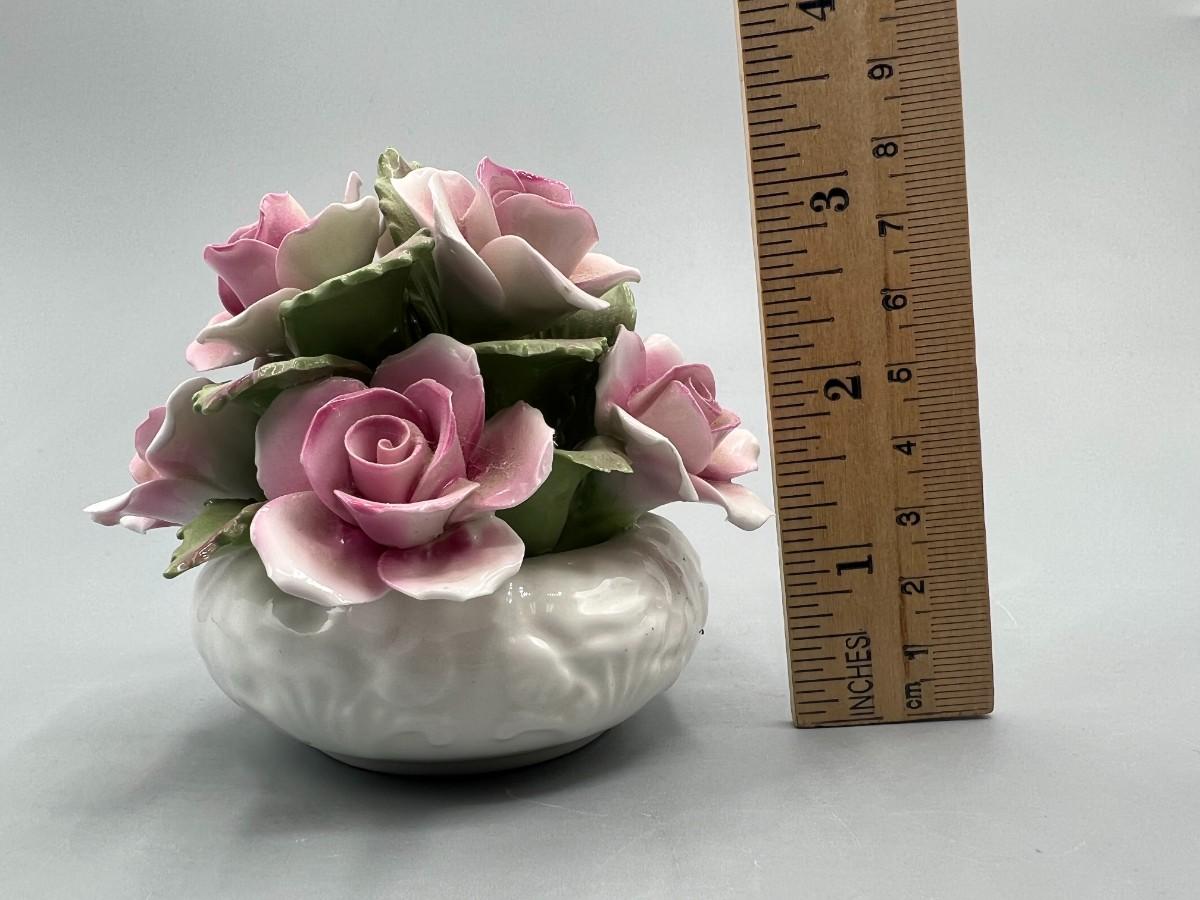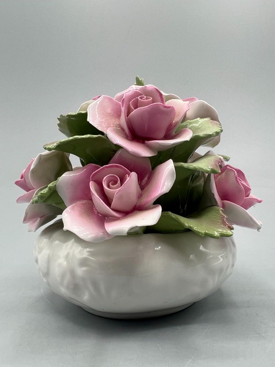 Vintage Aynsley Porcelain Pink Roses China Flower Figurine. In good condition. May have flea bite chips in petal edges but no major chips or damage noted. Needs to be cleaned, dusty from display. About 3" size.