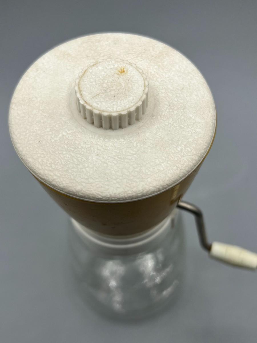 There is some retro wear to the nut grinder, but there is no significant damage and is in overall good collectible or useable condition. Check pictures for more details and for sizing.