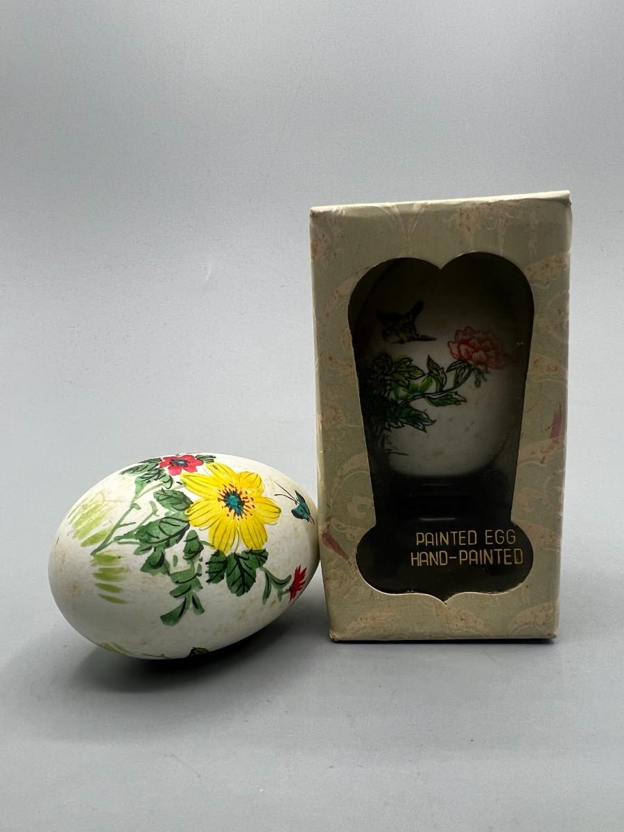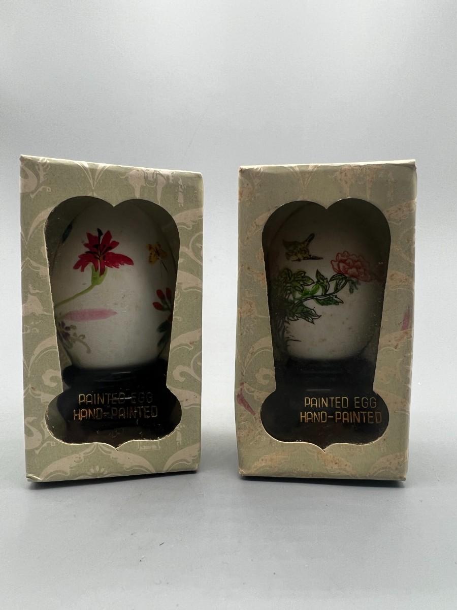 Retro Pair of Hand Painted Delicate Floral Real Eggs with Display Stands