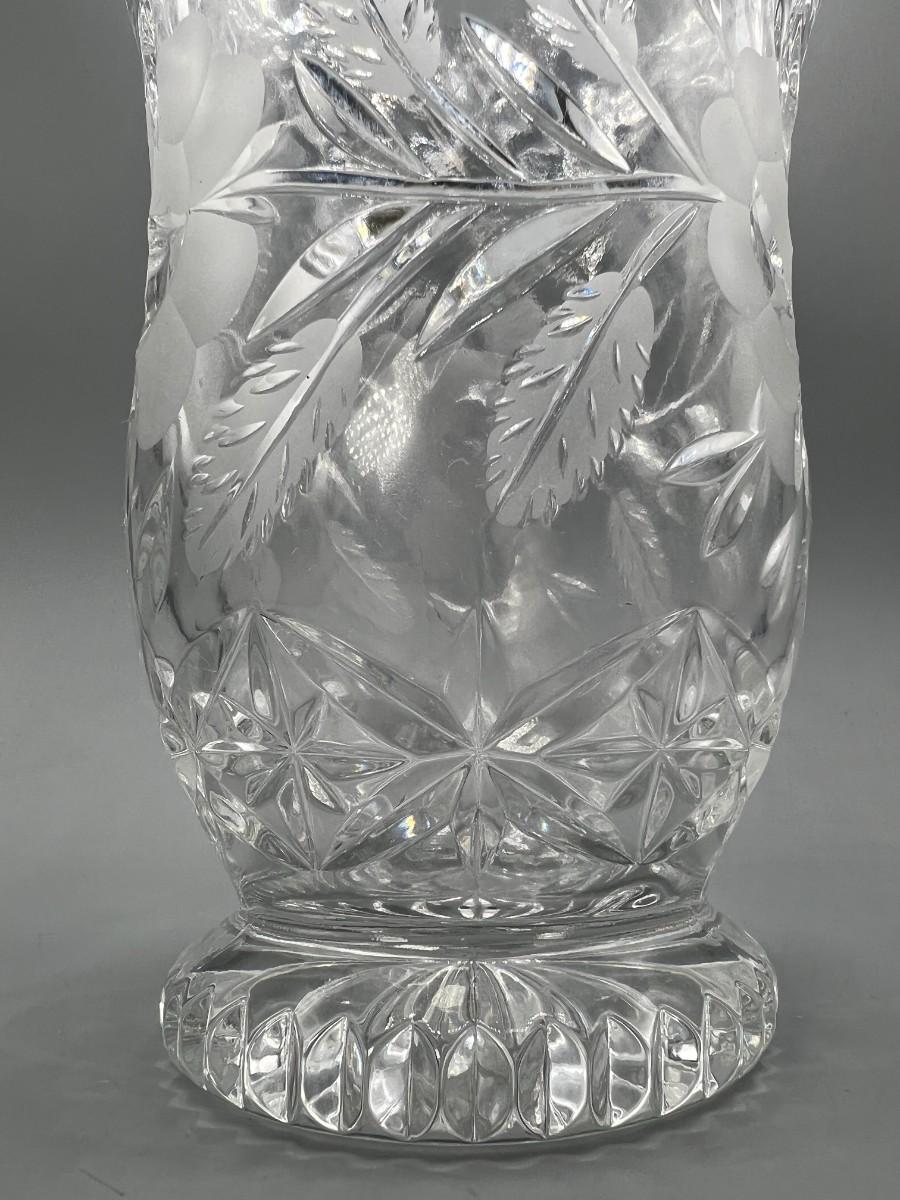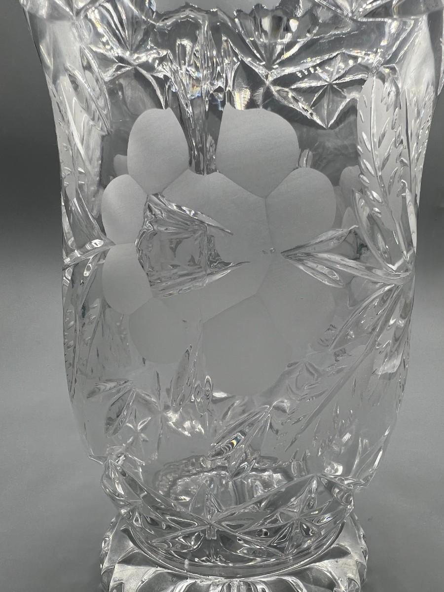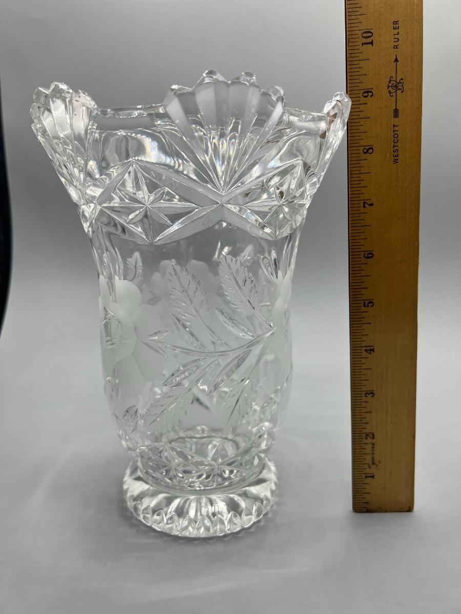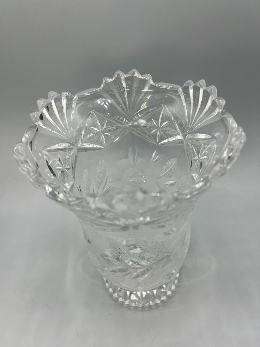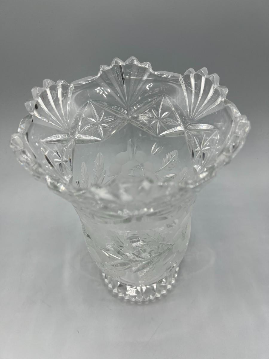 Vintage Crystal Glass Sawtooth Etched Flower Motif Bouquet MCM Vase