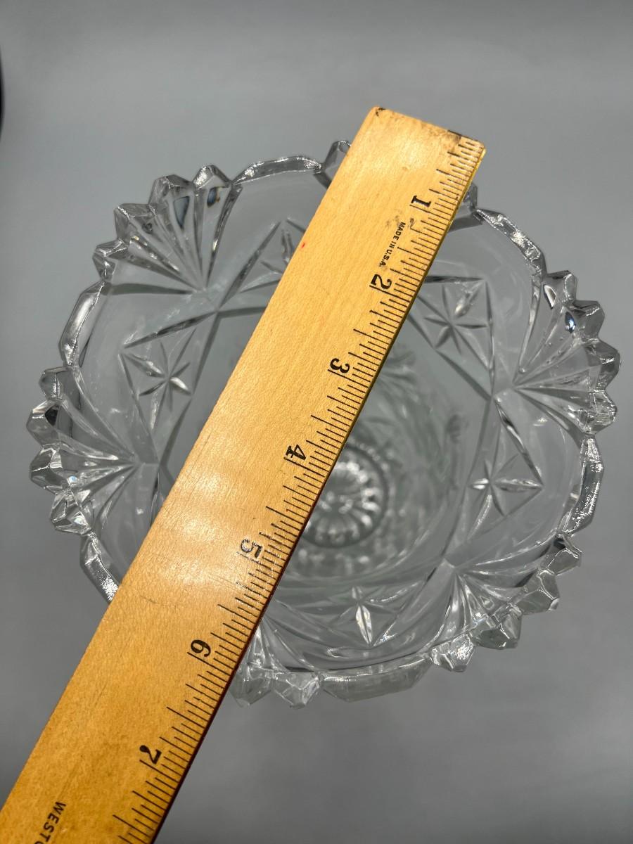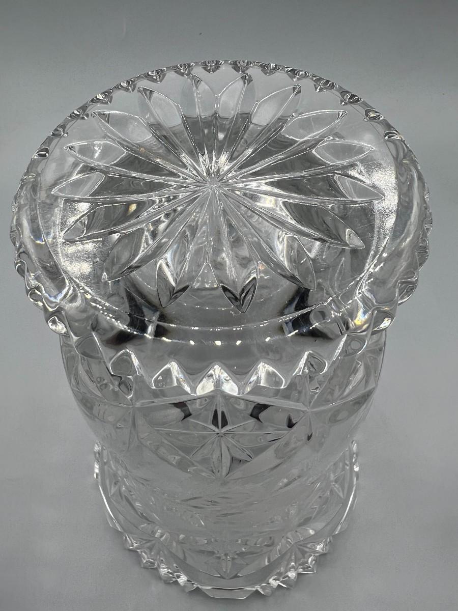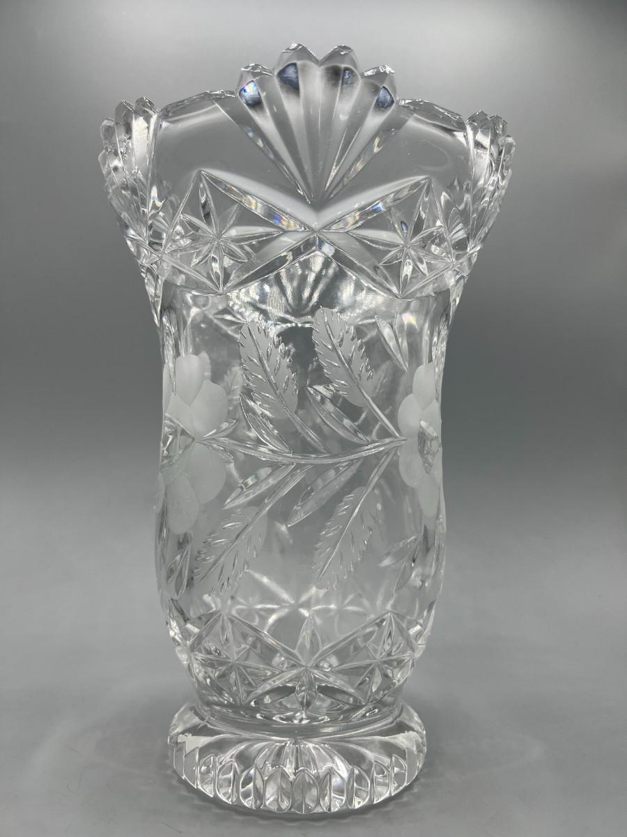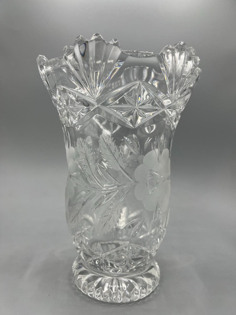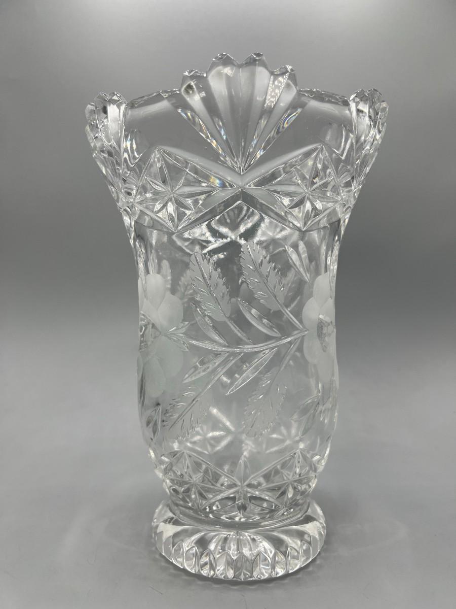 Vintage Crystal Glass Sawtooth Etched Flower Motif Bouquet MCM Vase