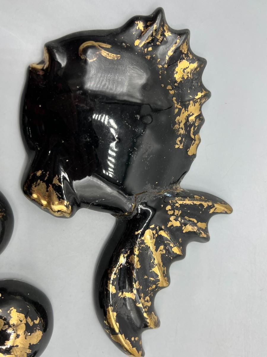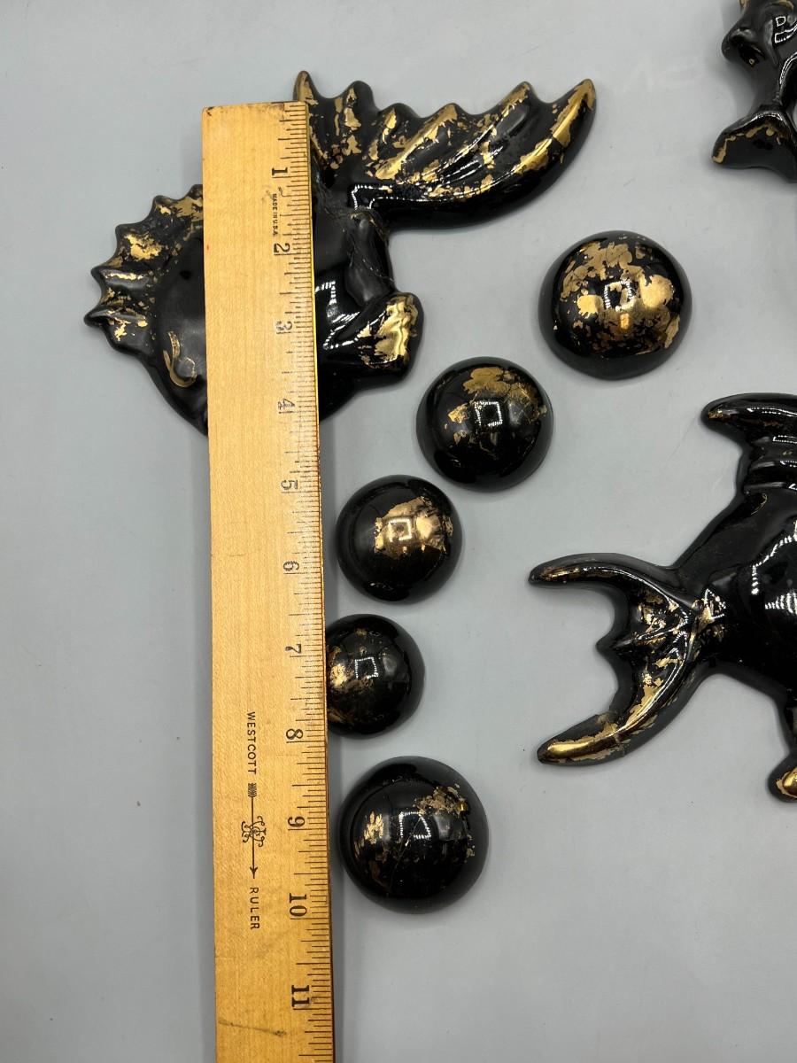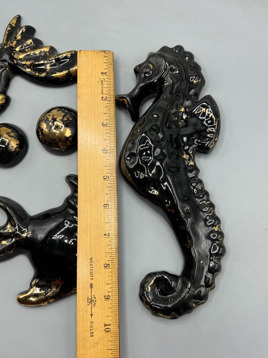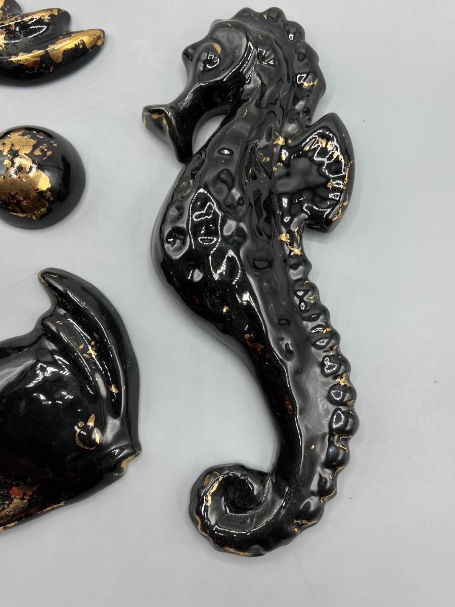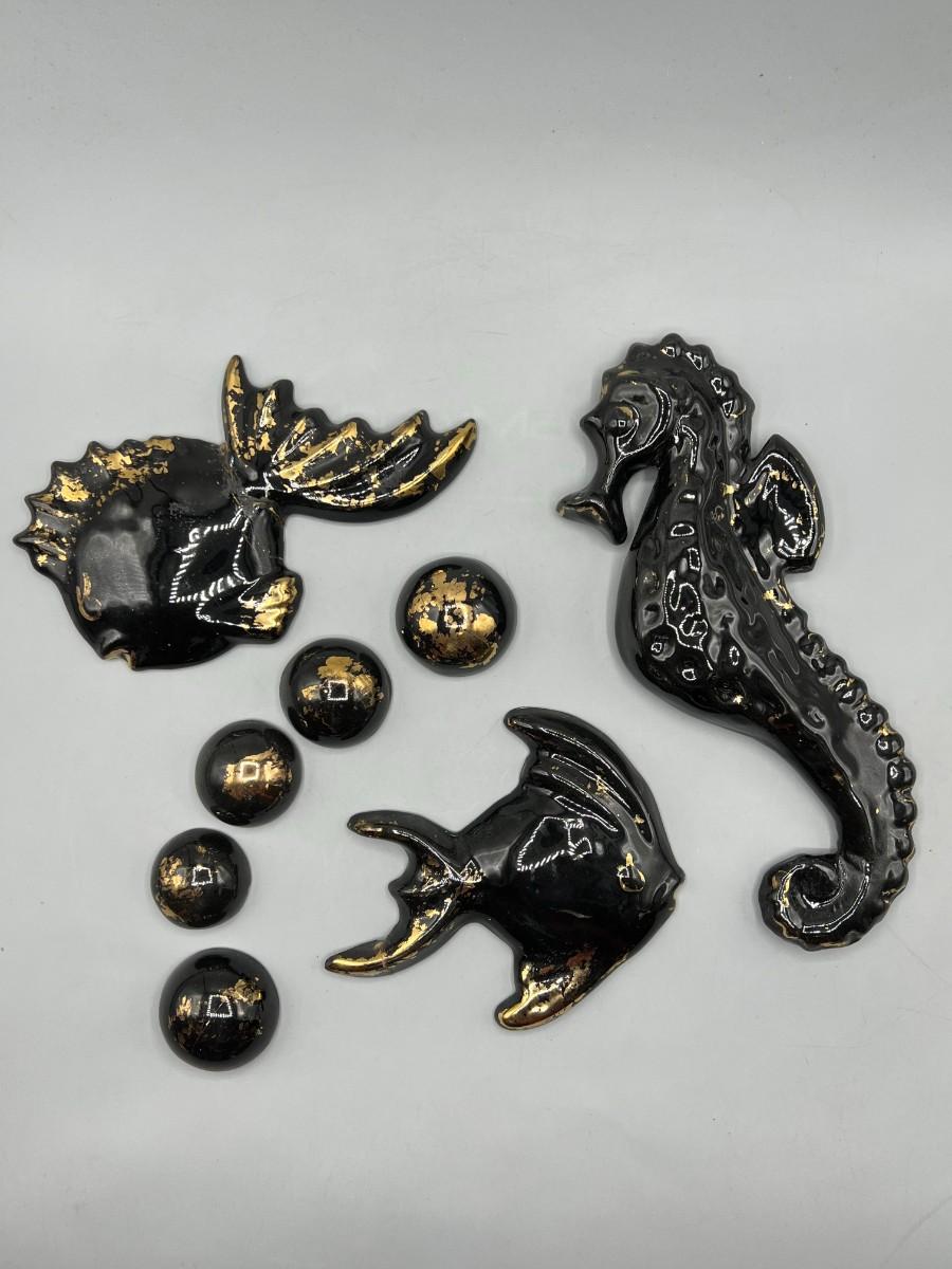 Vintage Set of Art Deco Black & Gold Splatter Ceramic Nautical Seahorse Fish Bubble Wall Hanging Decor