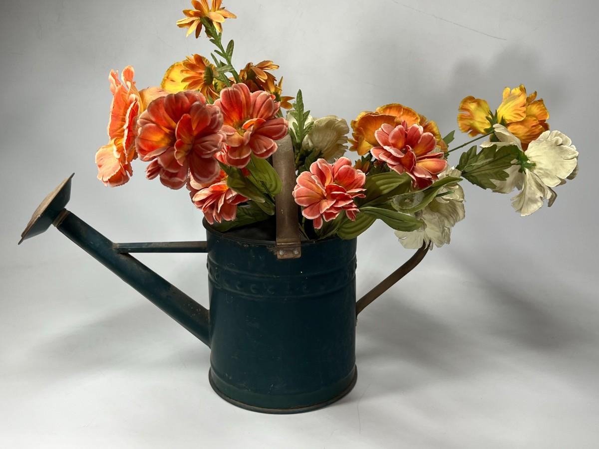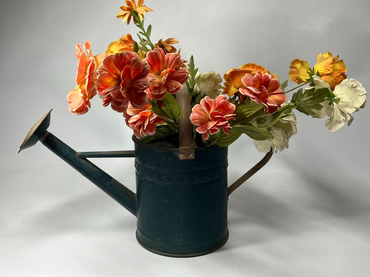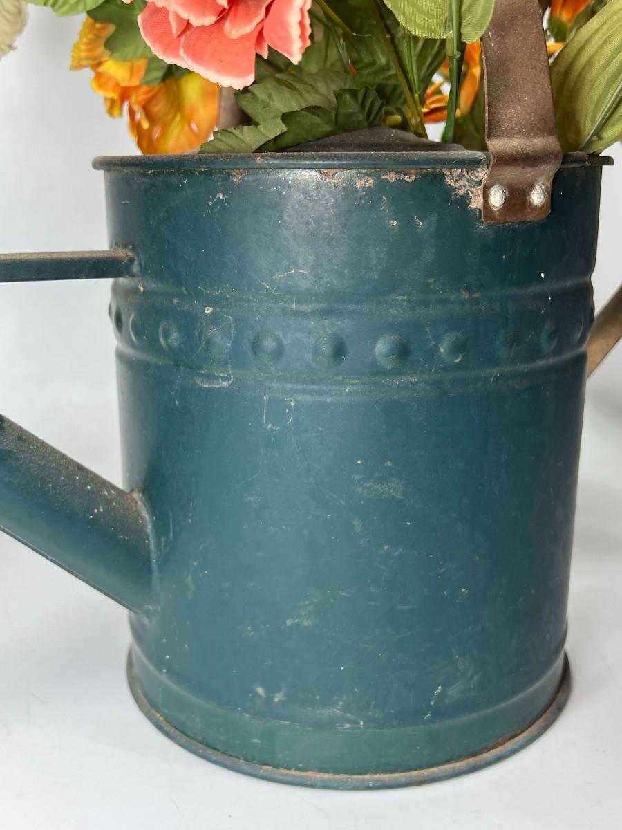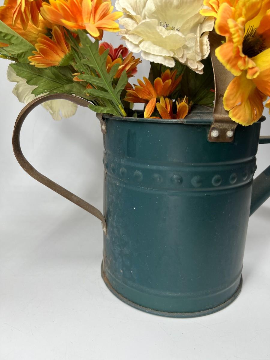 Retro Metal Gardening Watering Can with Colorful Faux Flowers Rustic Cottagcore Decor