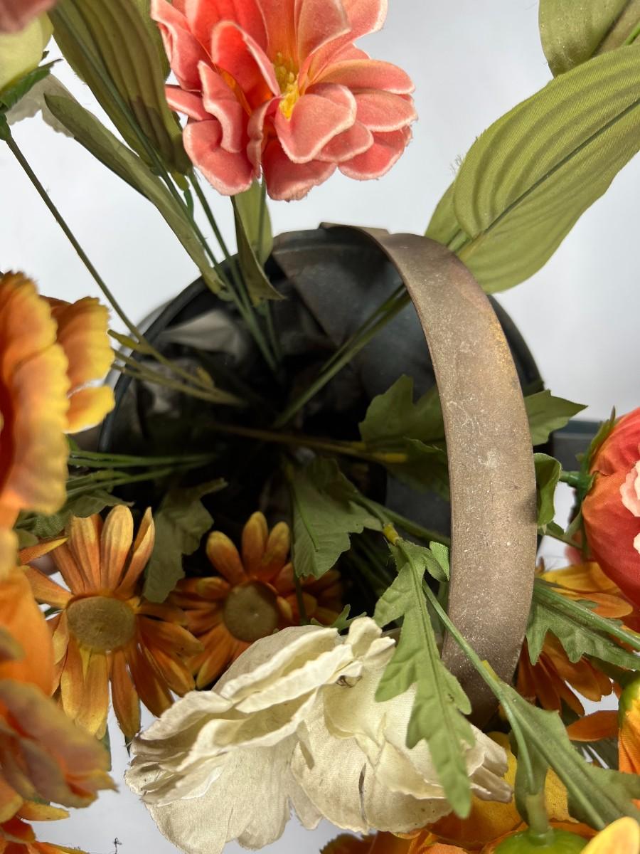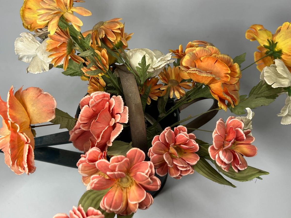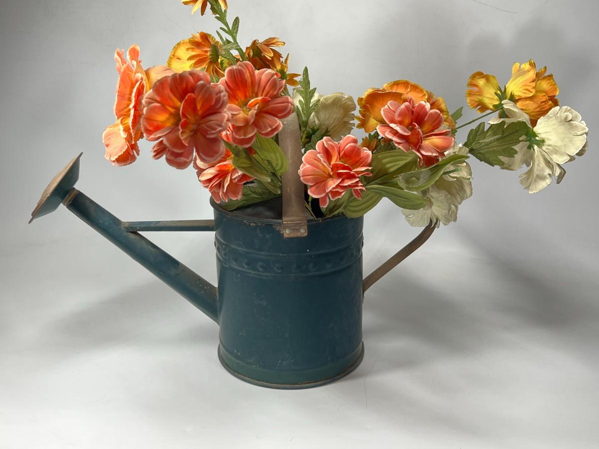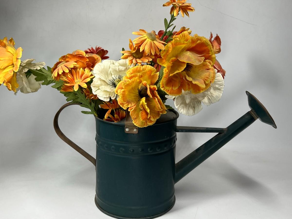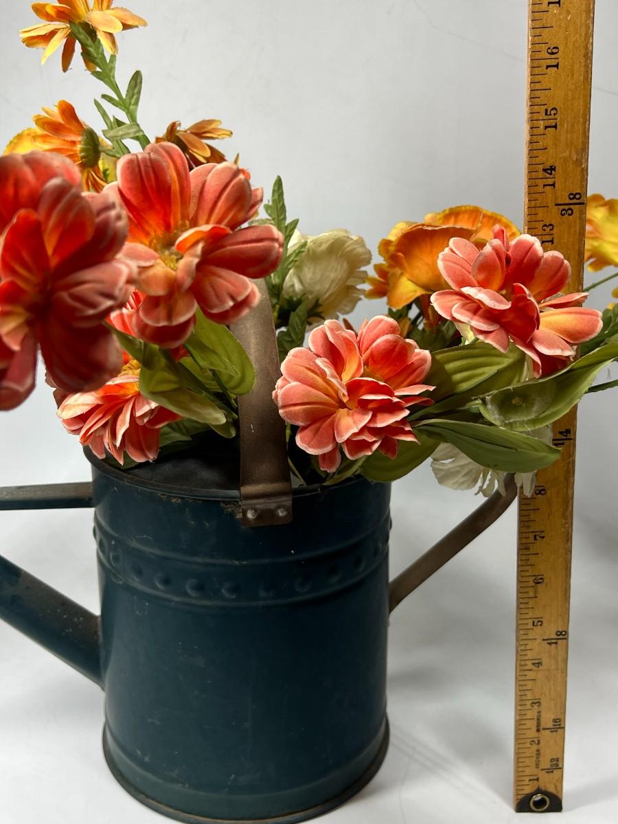 Retro Metal Gardening Watering Can with Colorful Faux Flowers Rustic Cottagcore Decor