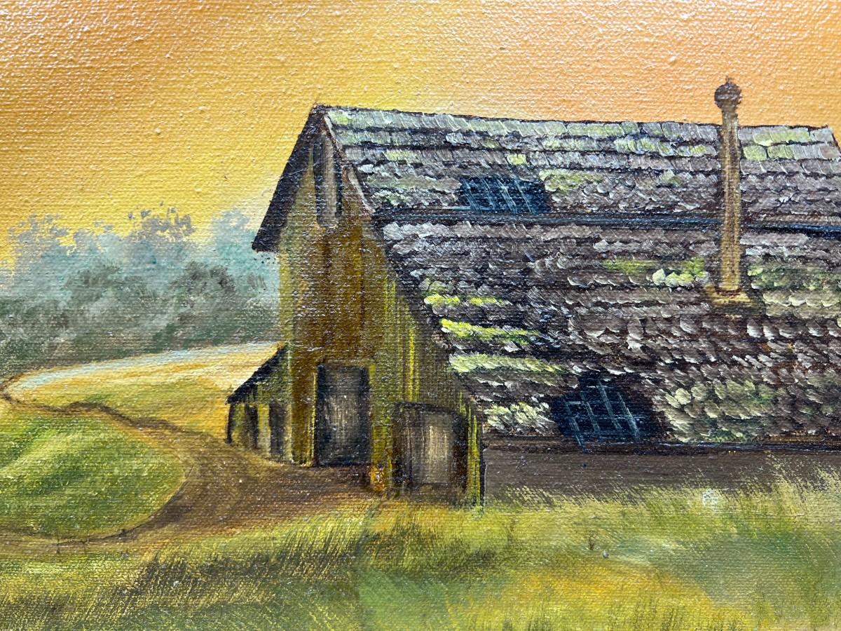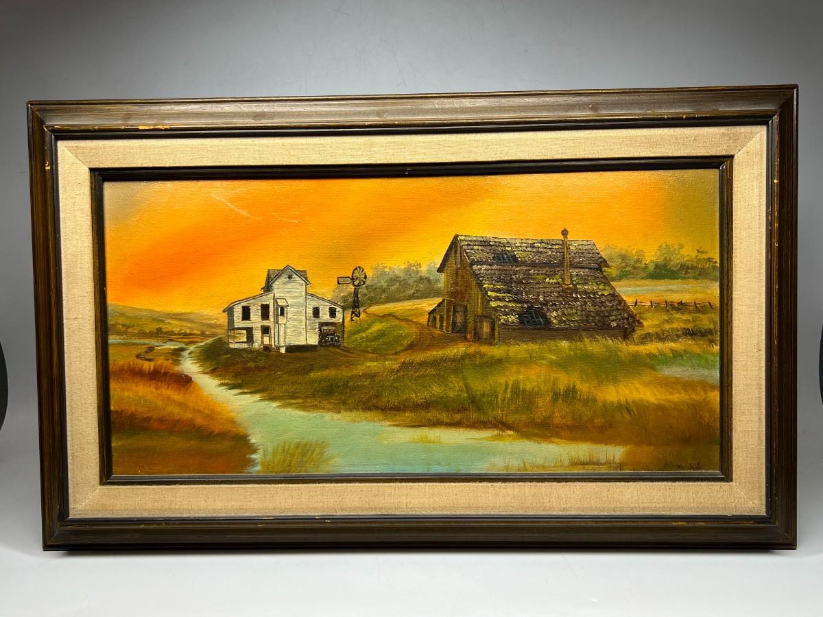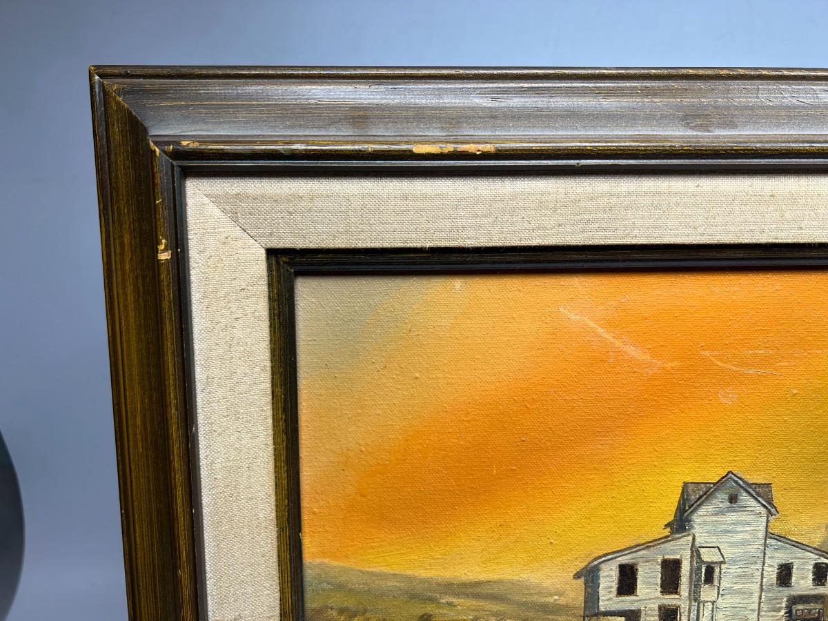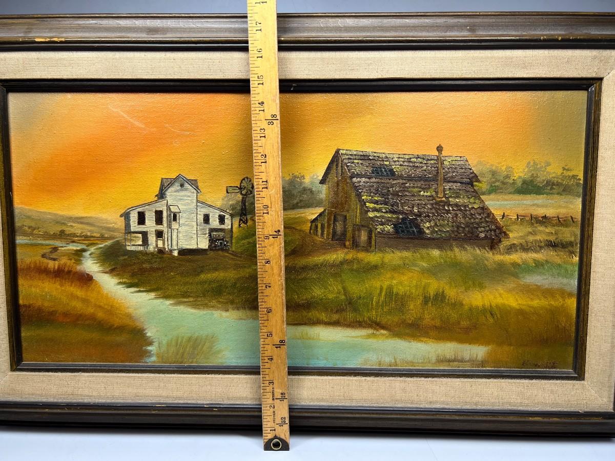 Vintage Framed Amateur Artist Oil Painting Sunset Farm Scene