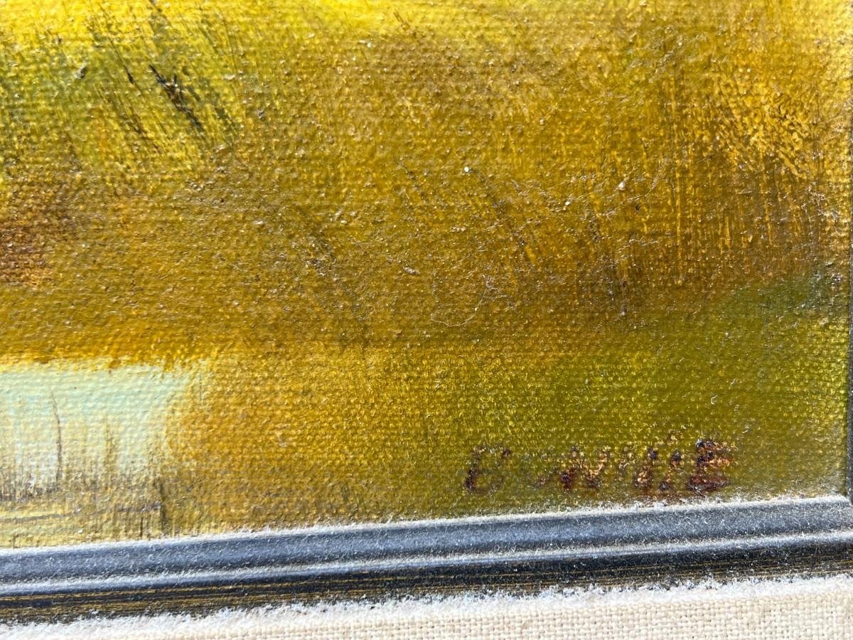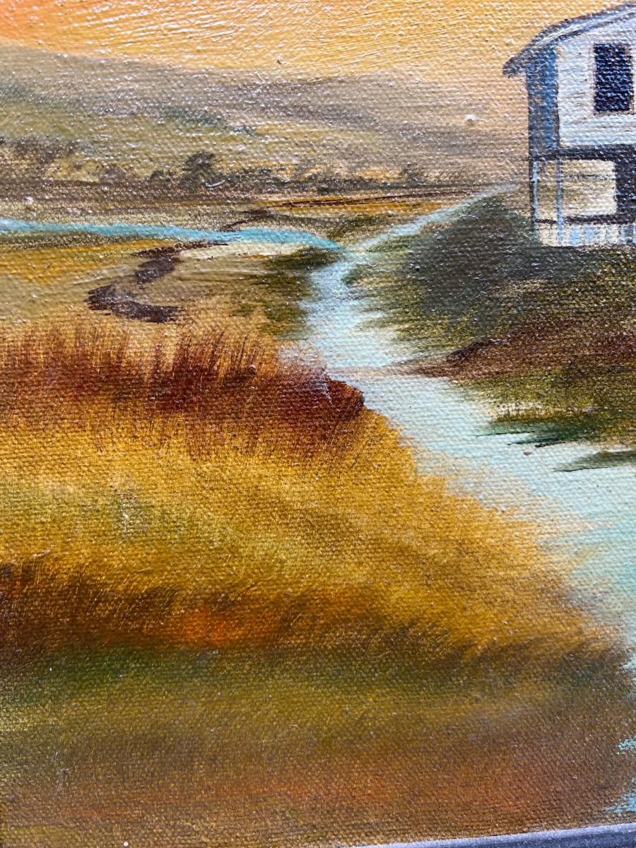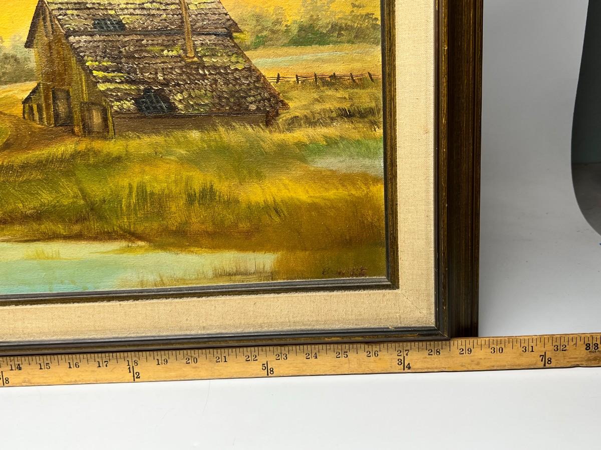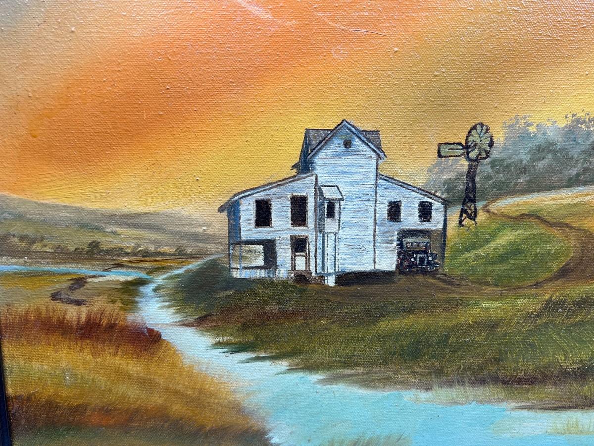 Vintage Framed Amateur Artist Oil Painting Sunset Farm Scene