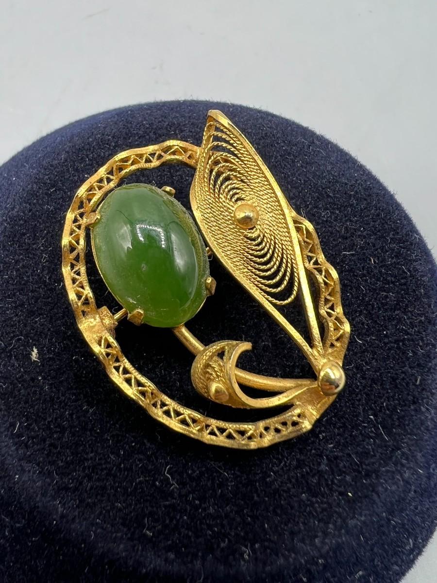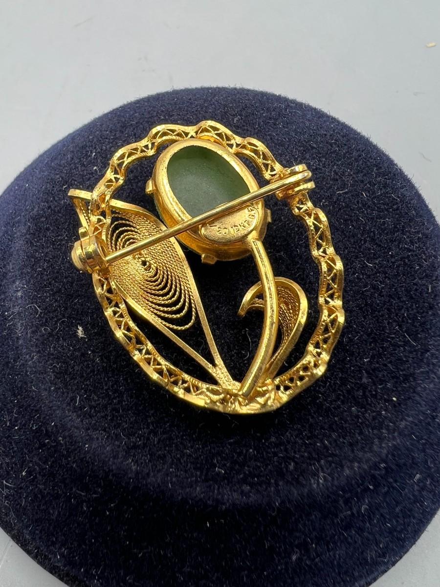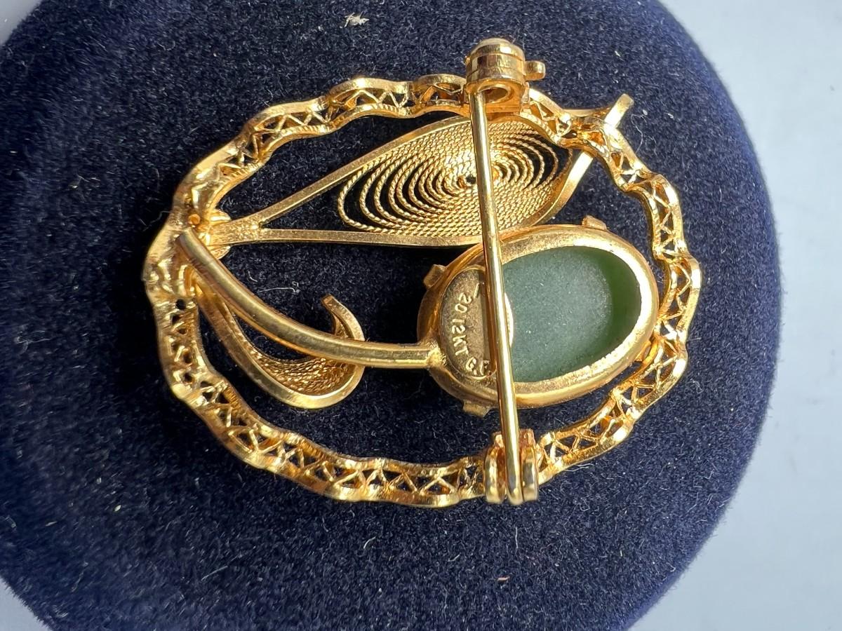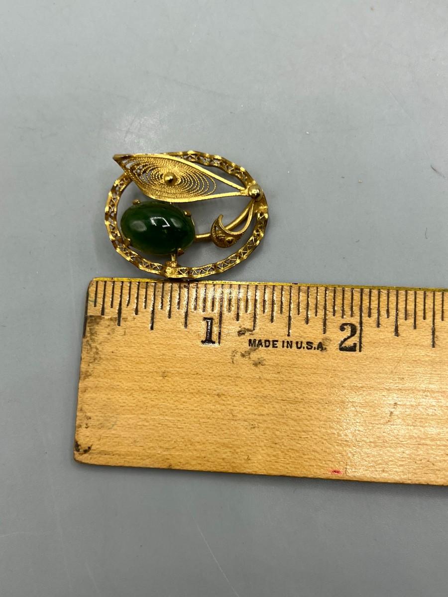 Vintage Gold Tone 20 12KT G.F. Jade Jewel Filigree Brooch Pin