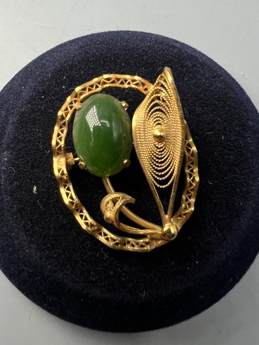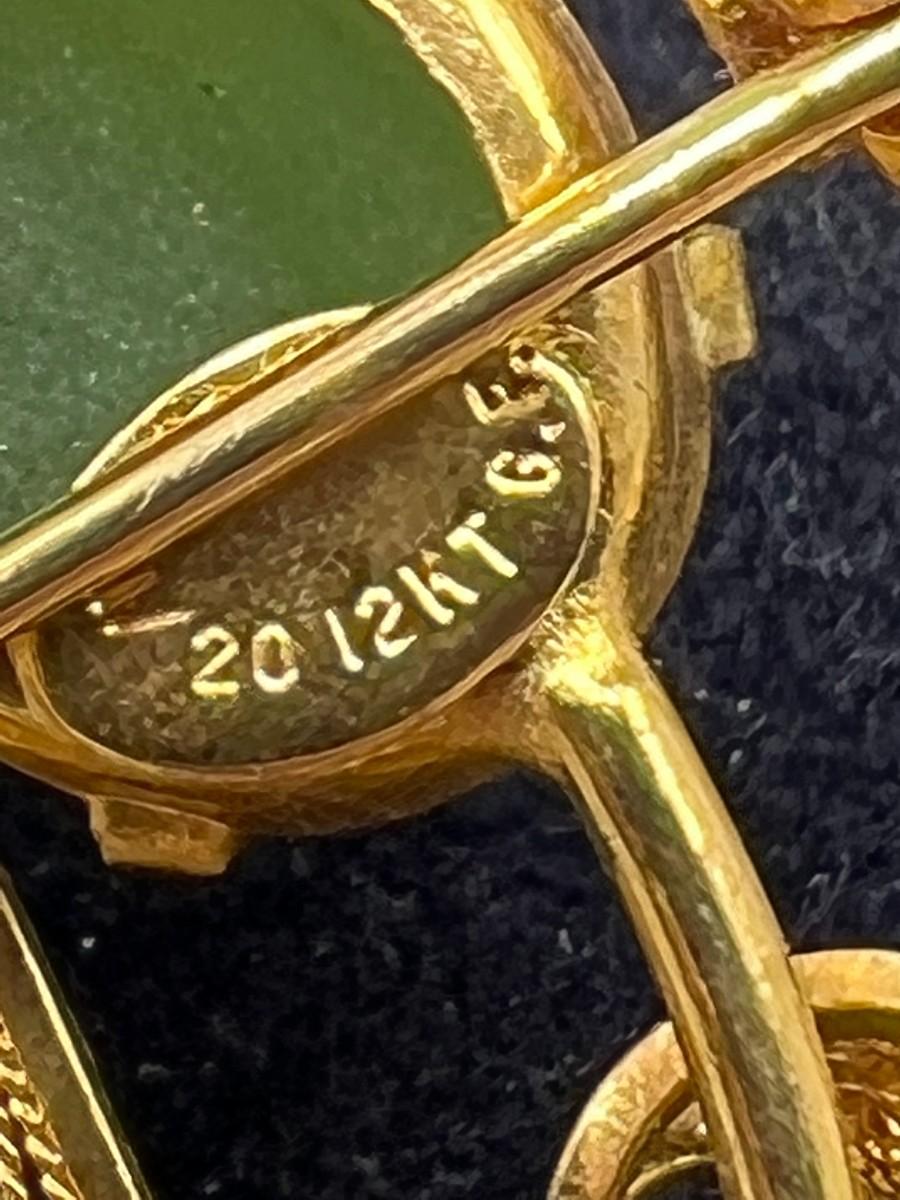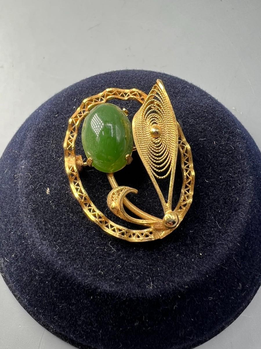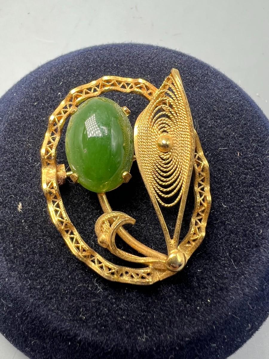 Vintage Gold Tone 20 12KT G.F. Jade Jewel Filigree Brooch Pin