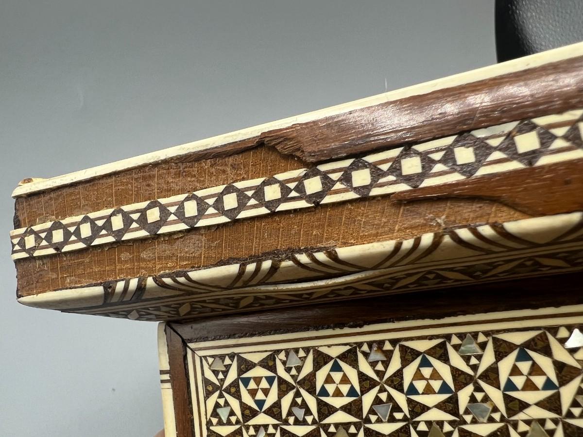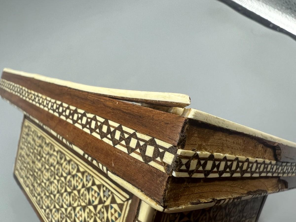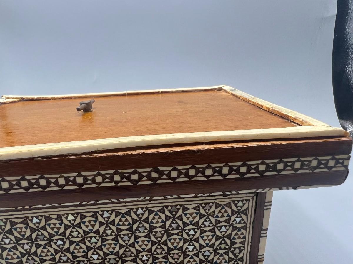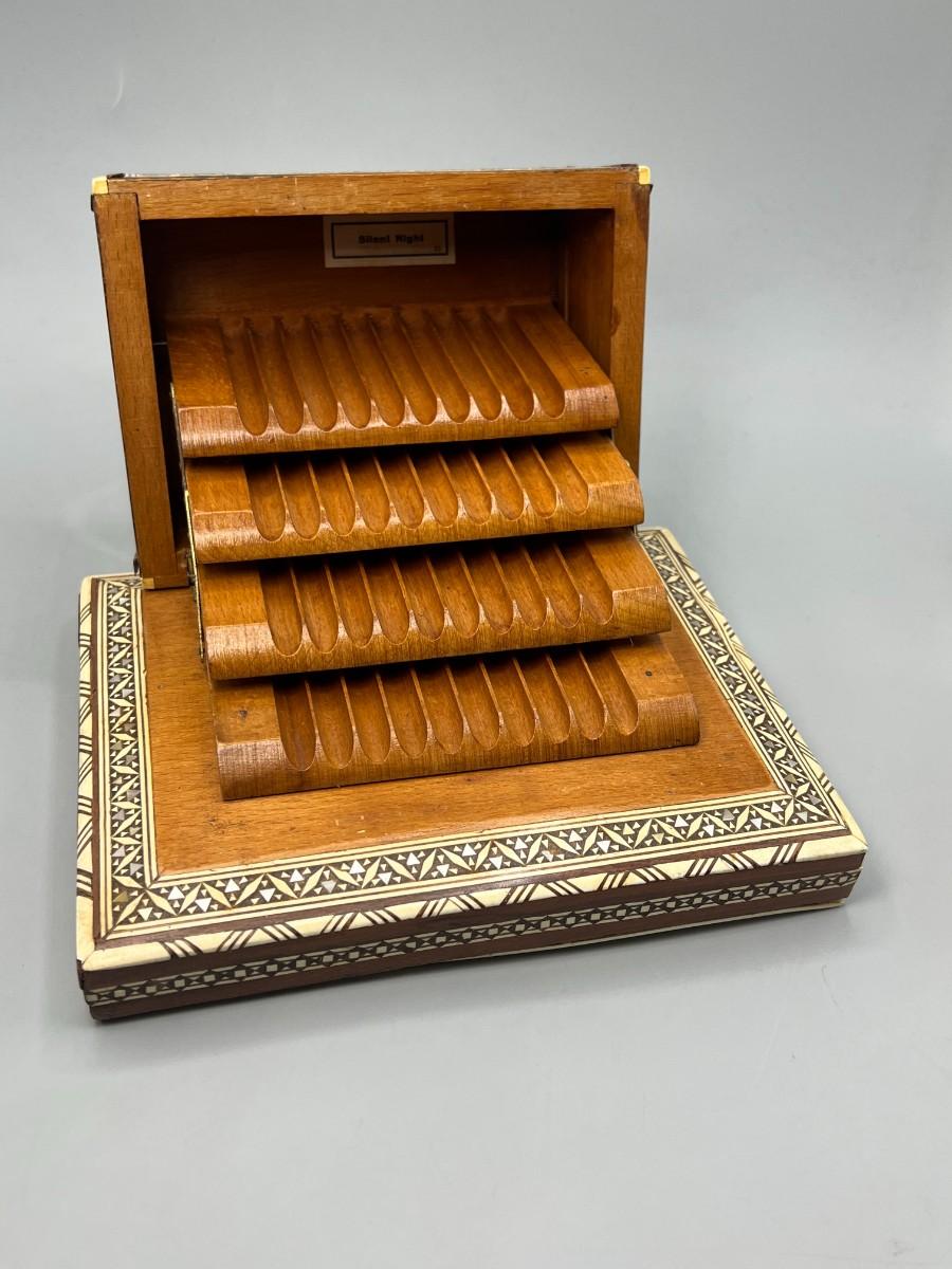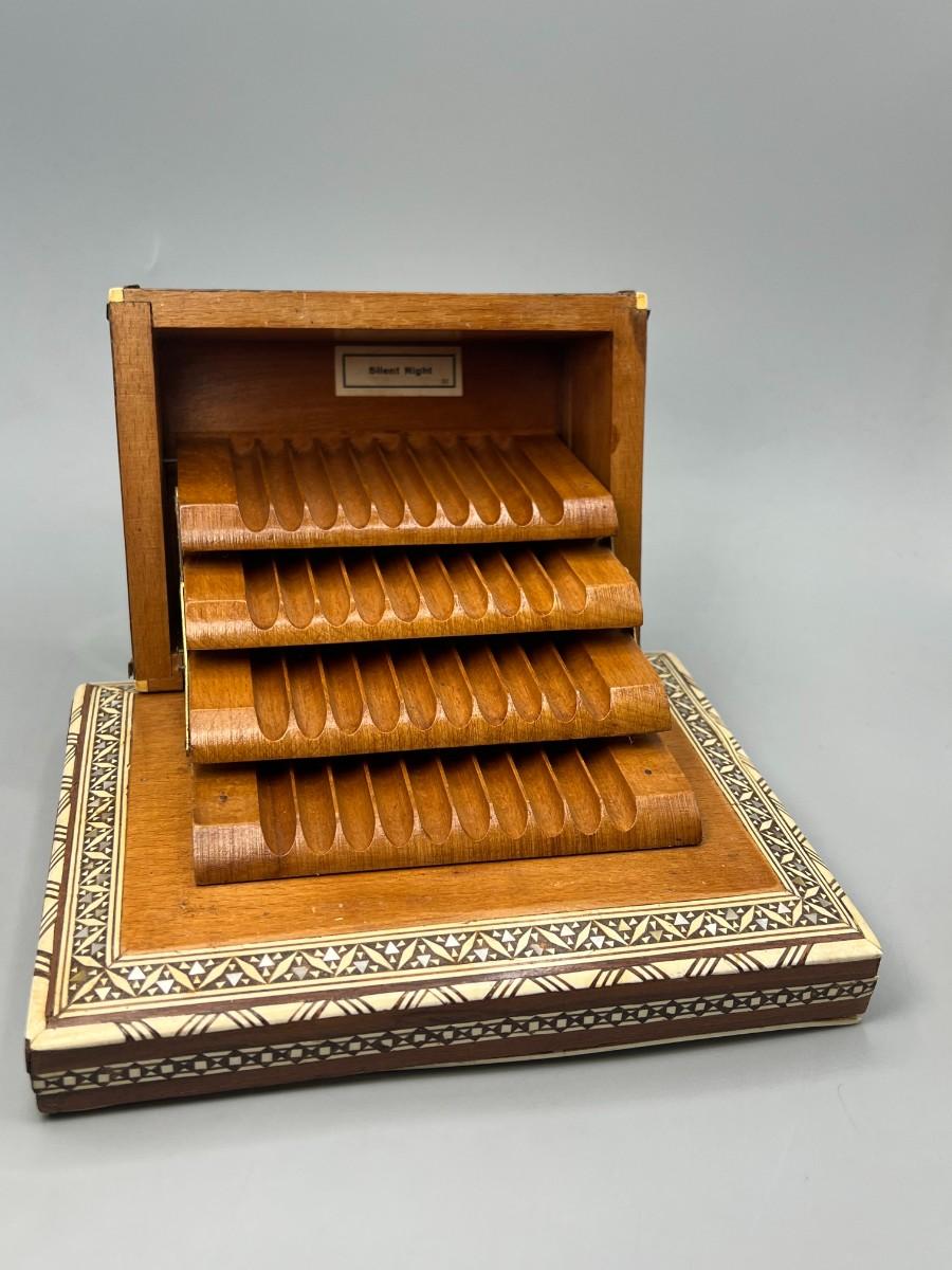 Antique Handmade Wood Cigarette Box Carved Inlaid Mother of Pearl Art Deco Starry Night Music Box