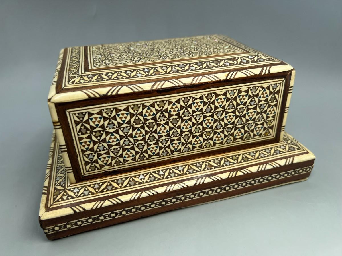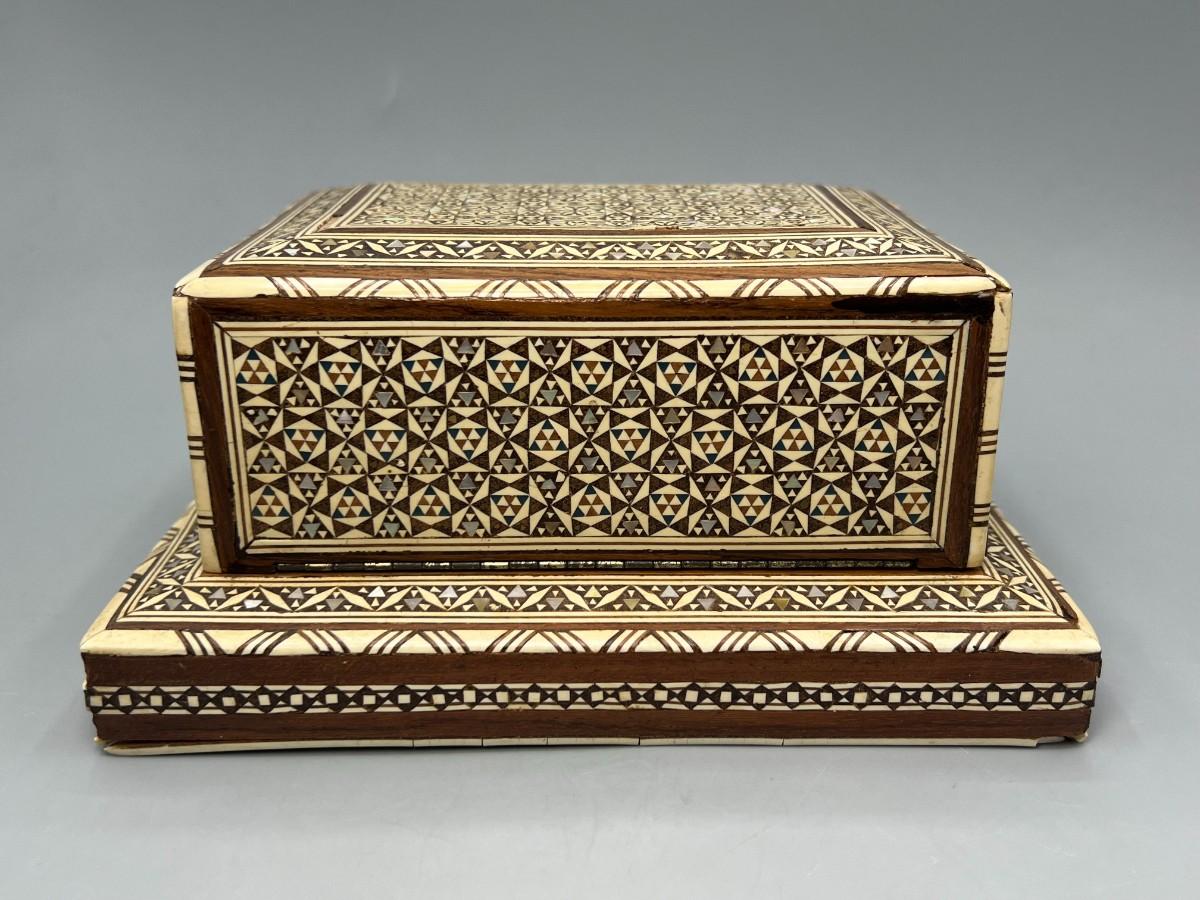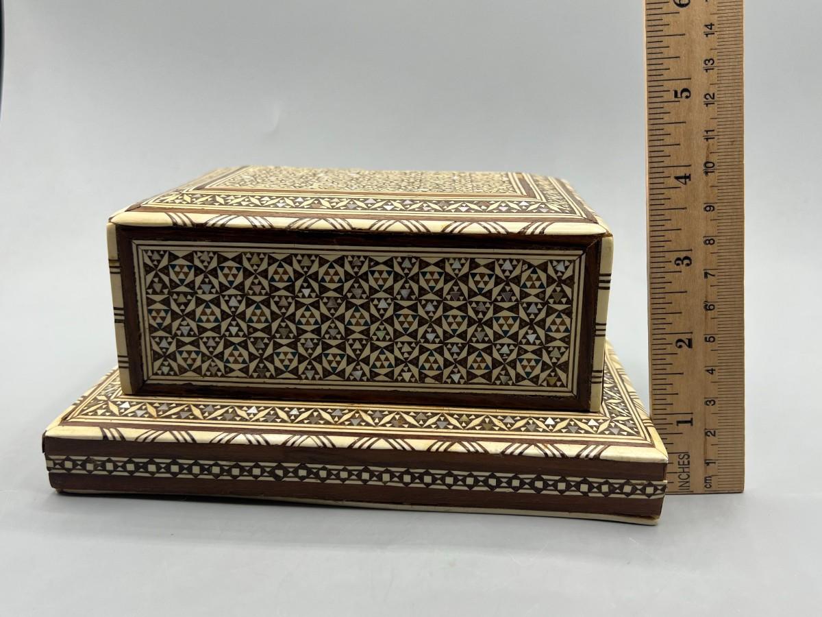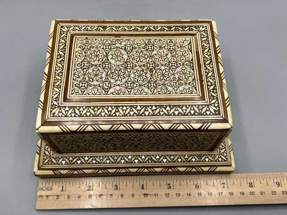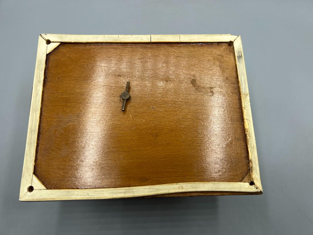 Antique Handmade Wood Cigarette Box Carved Inlaid Mother of Pearl Art Deco Starry Night Music Box