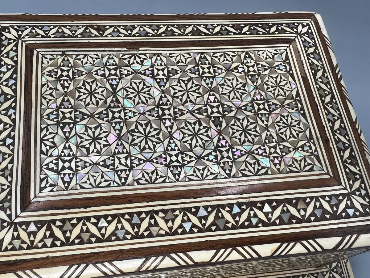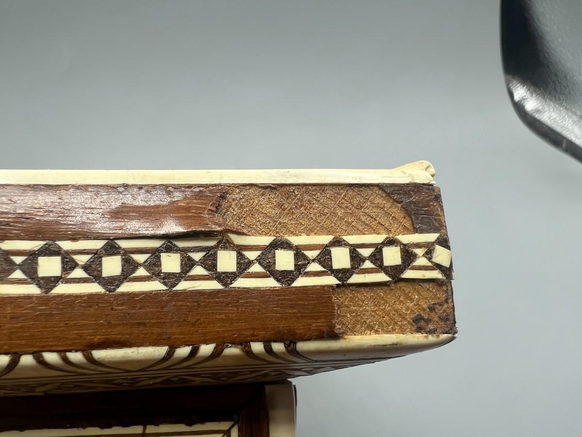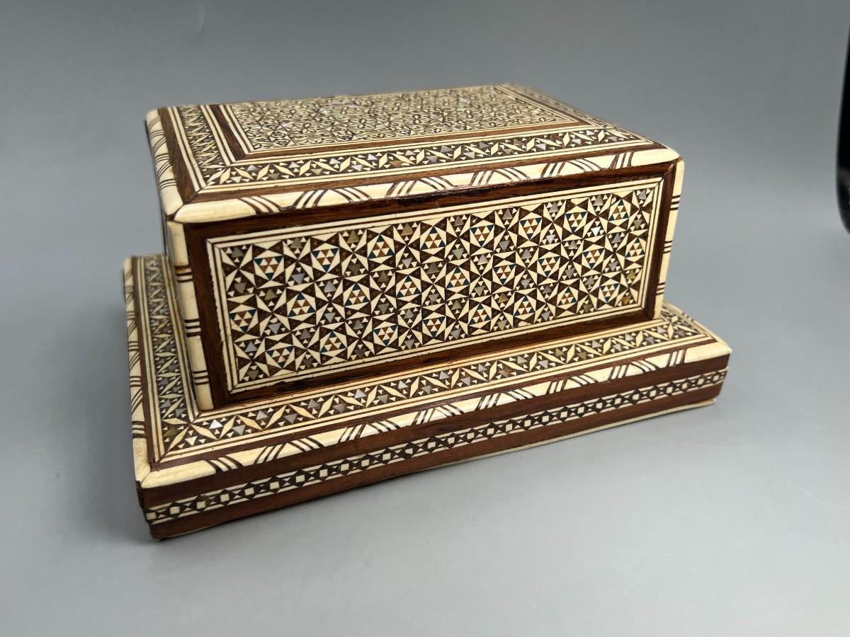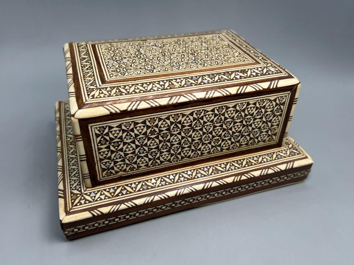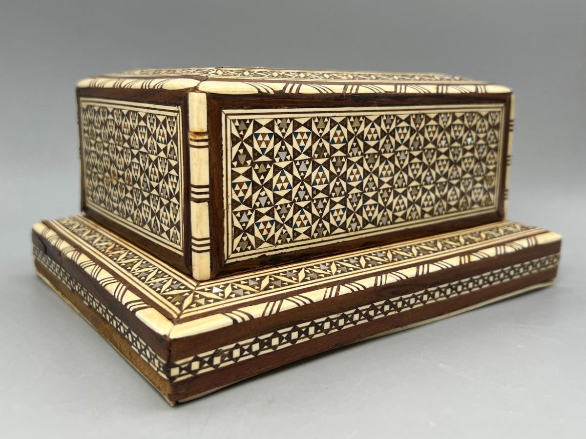 Antique Handmade Wood Cigarette Box Carved Inlaid Mother of Pearl Art Deco Starry Night Music Box