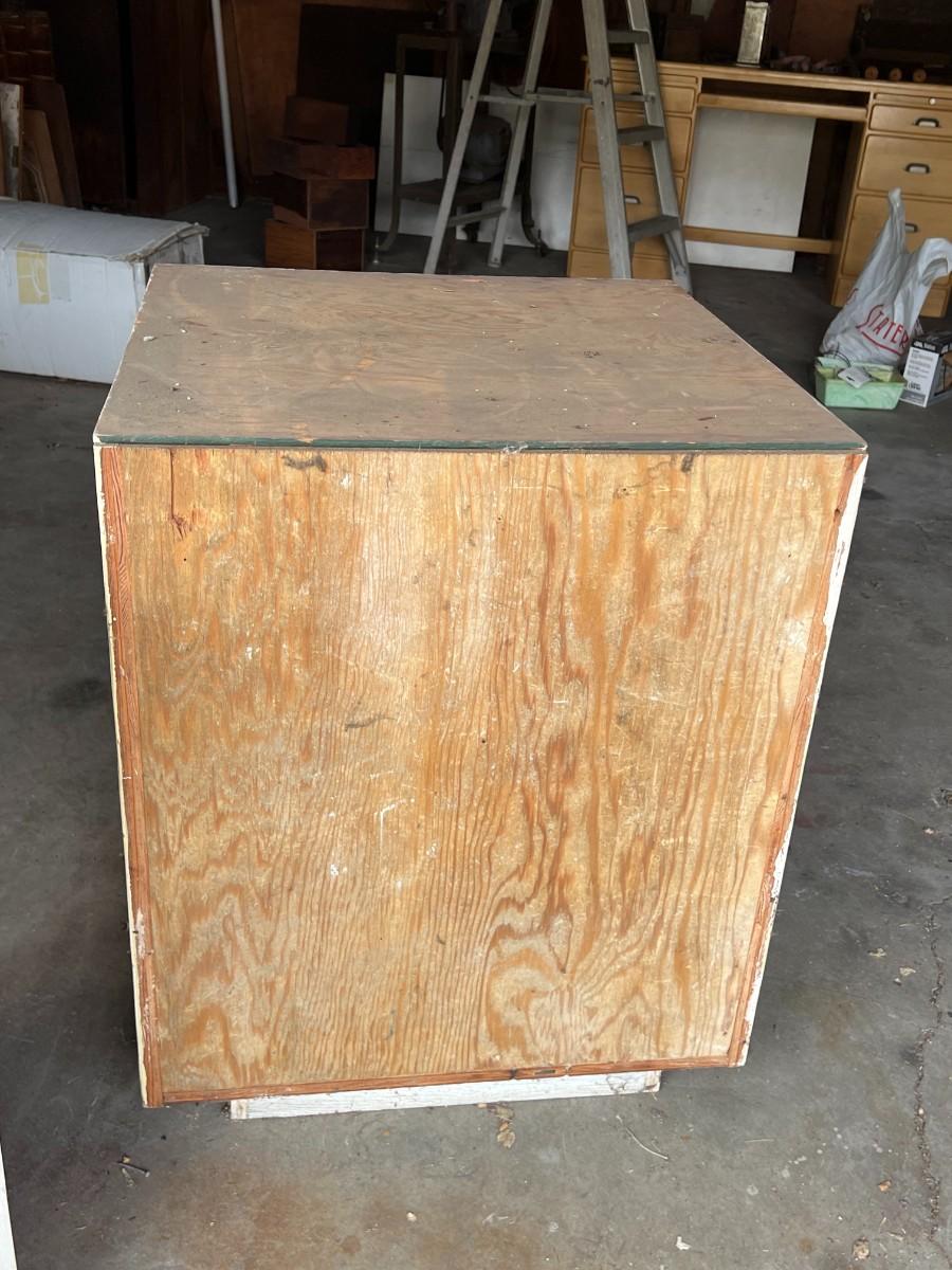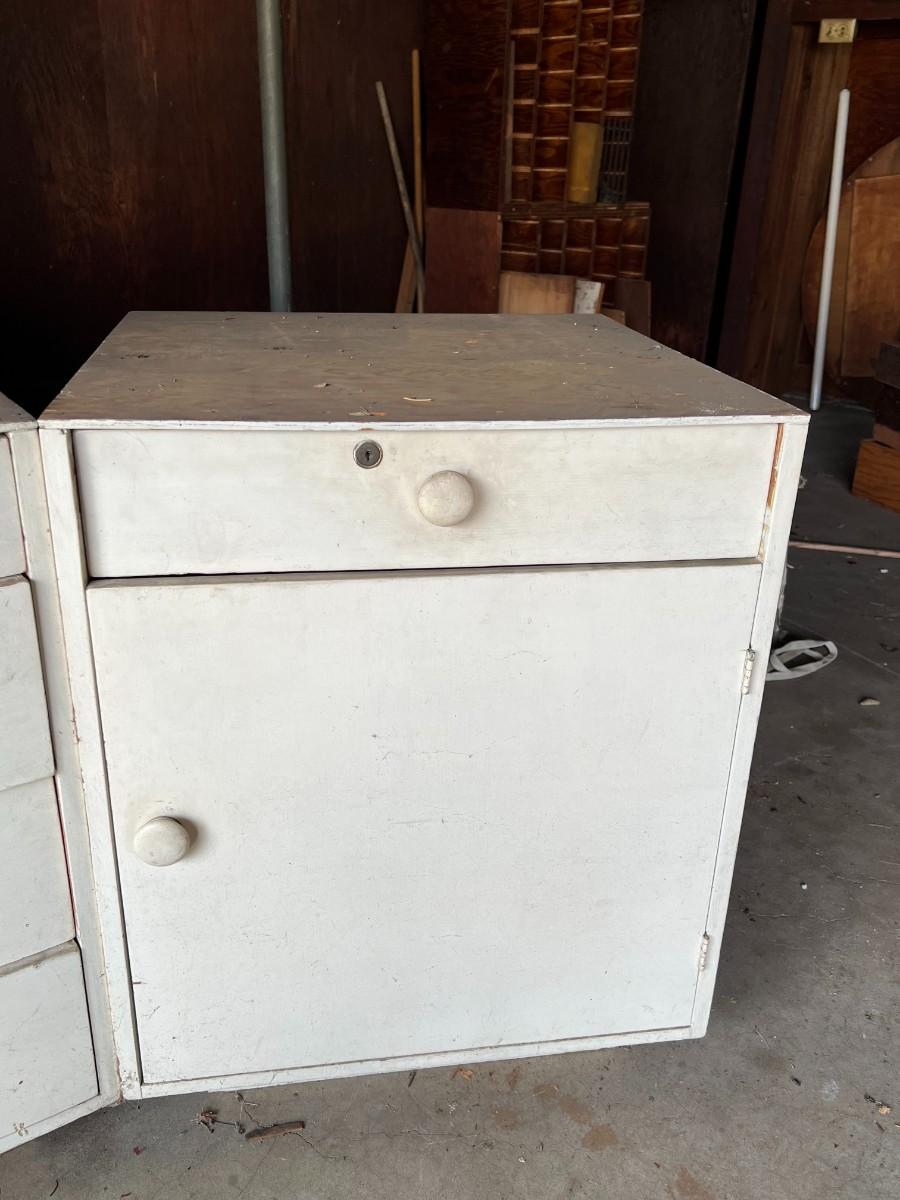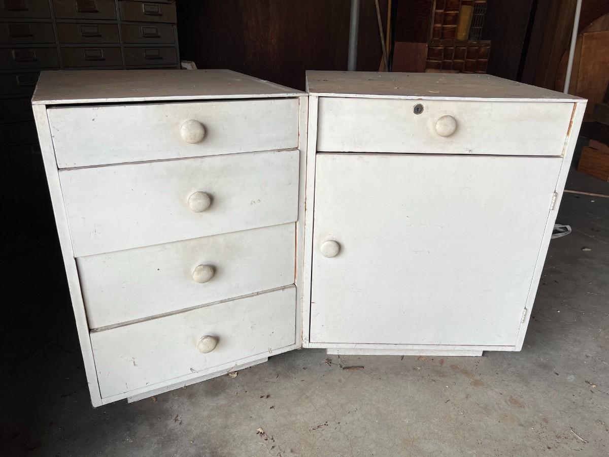 There is some noticeable vintage wear and use to both of the cabinets and is in overall in fair useable condition. Check pictures for more details and for sizing.