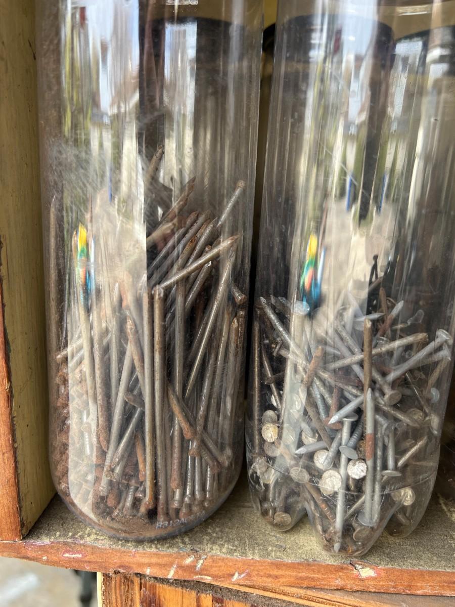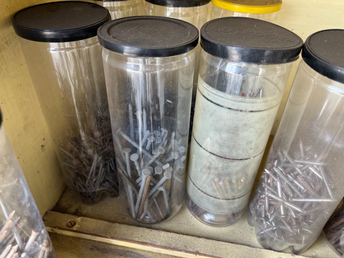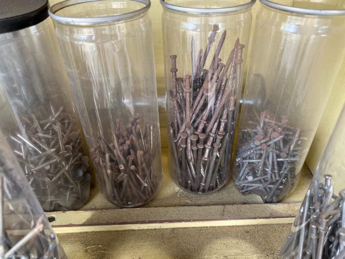 There is some vintage wear to the nails and noticeable wear to the crates. The nails are stored in plastic tennis ball containers. Check pictures for more details.