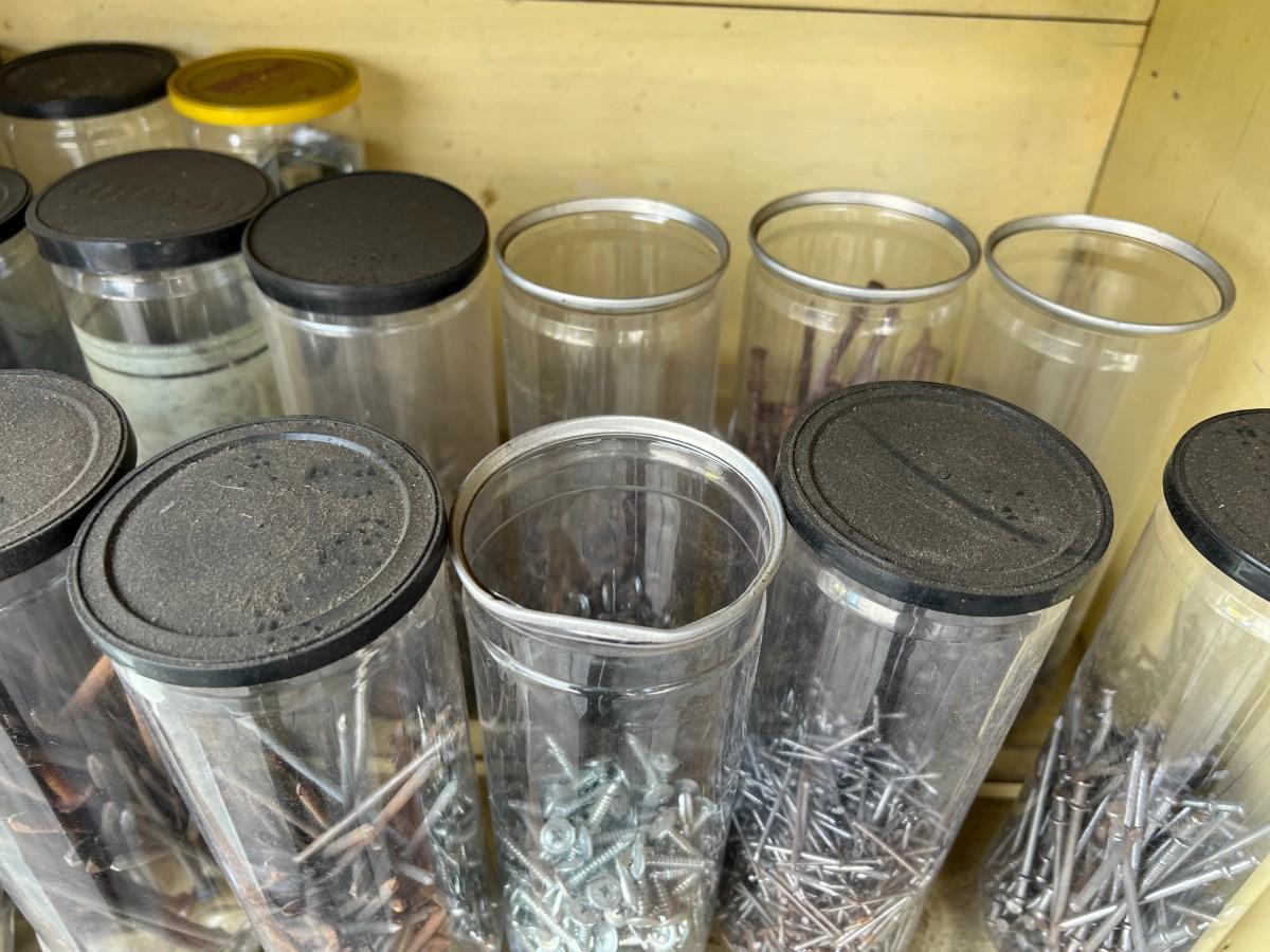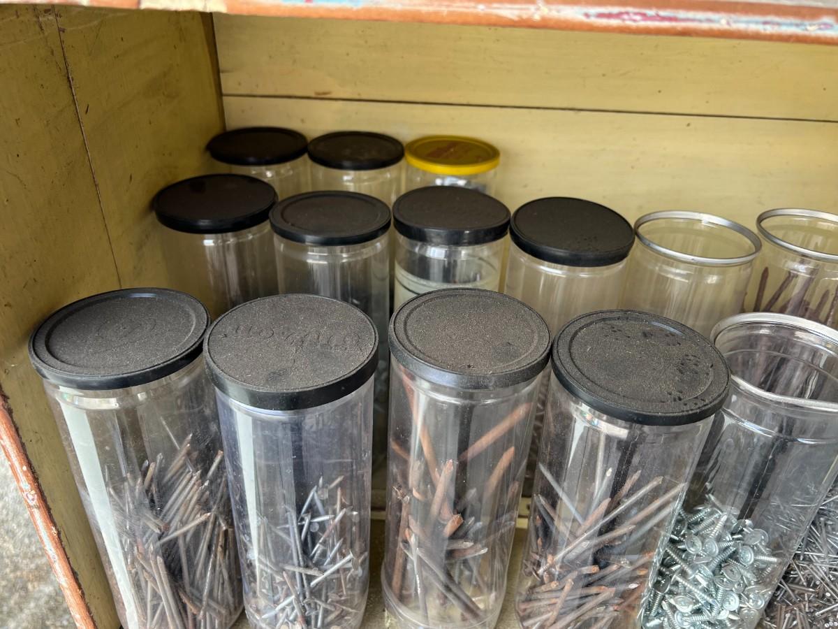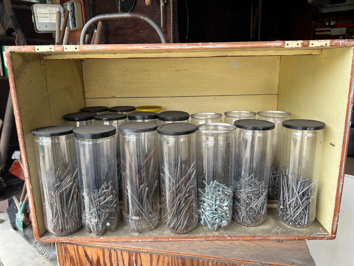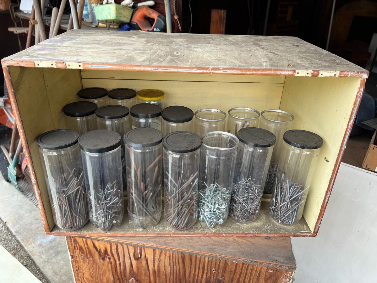 There is some vintage wear to the nails and noticeable wear to the crates. The nails are stored in plastic tennis ball containers. Check pictures for more details.