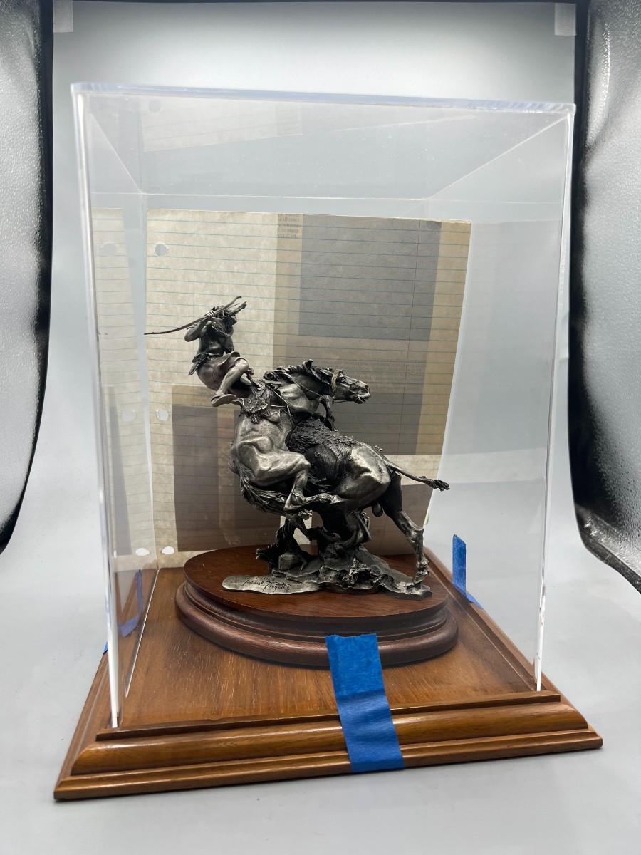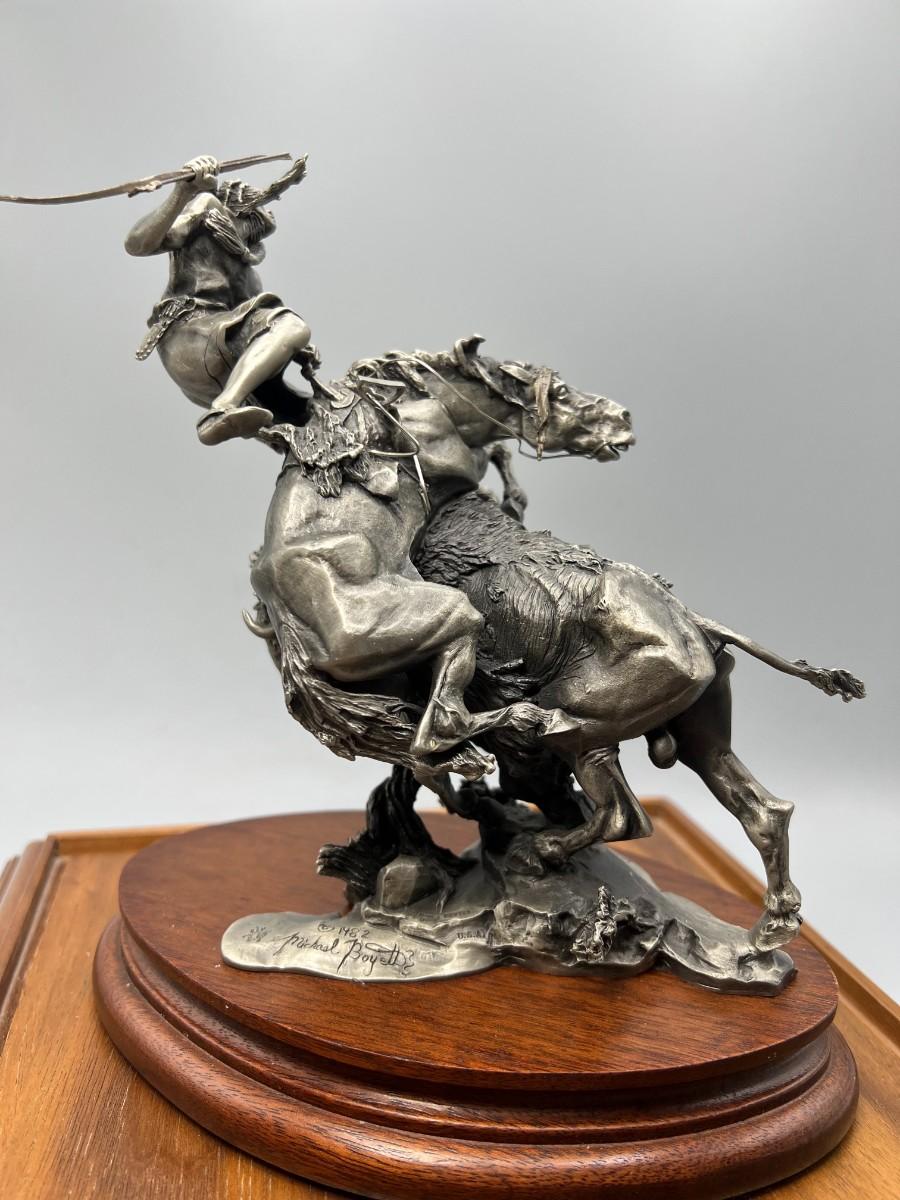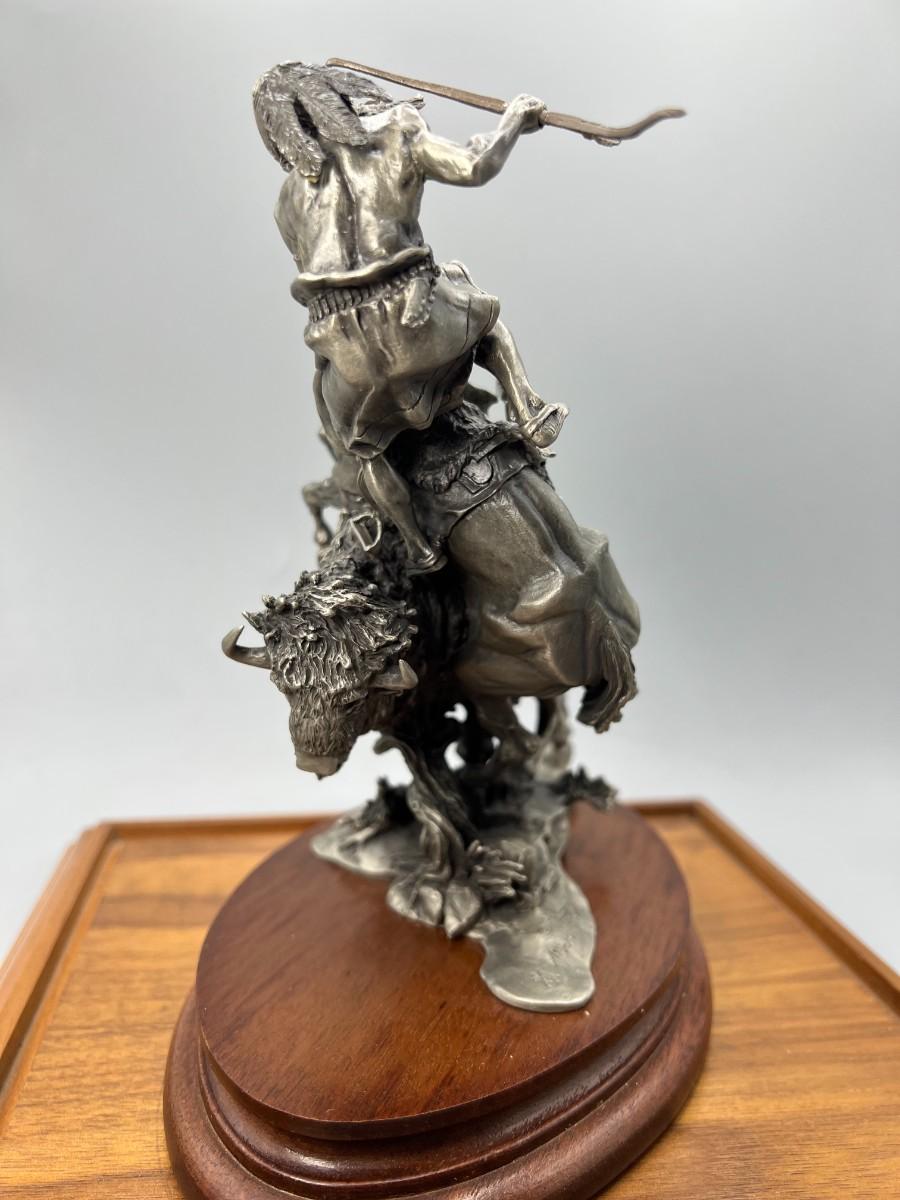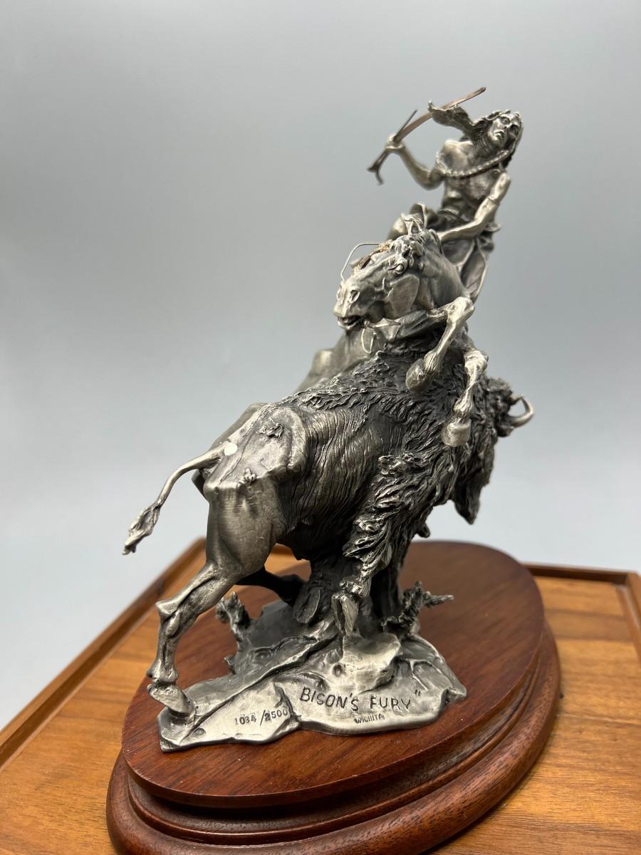 Bison's Fury Pewter Statuette Limited Edition with COA and Display Case. In good condition. Has a plexiglass display cover and wood base. Sculpted by Michael Boyett. Statue is about 7"size, under 12" with cover.